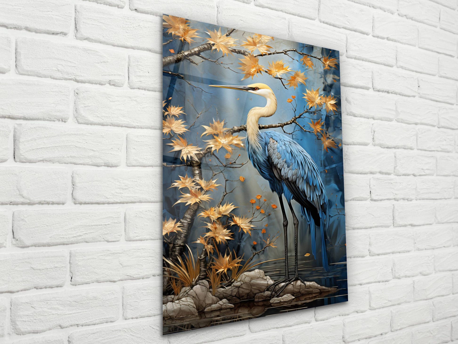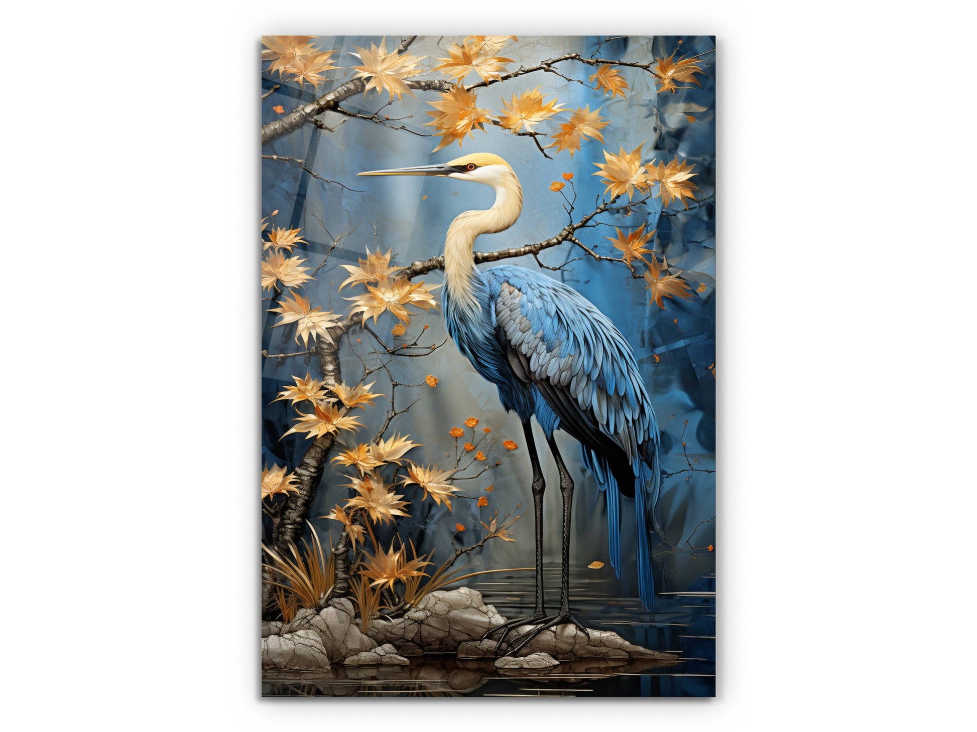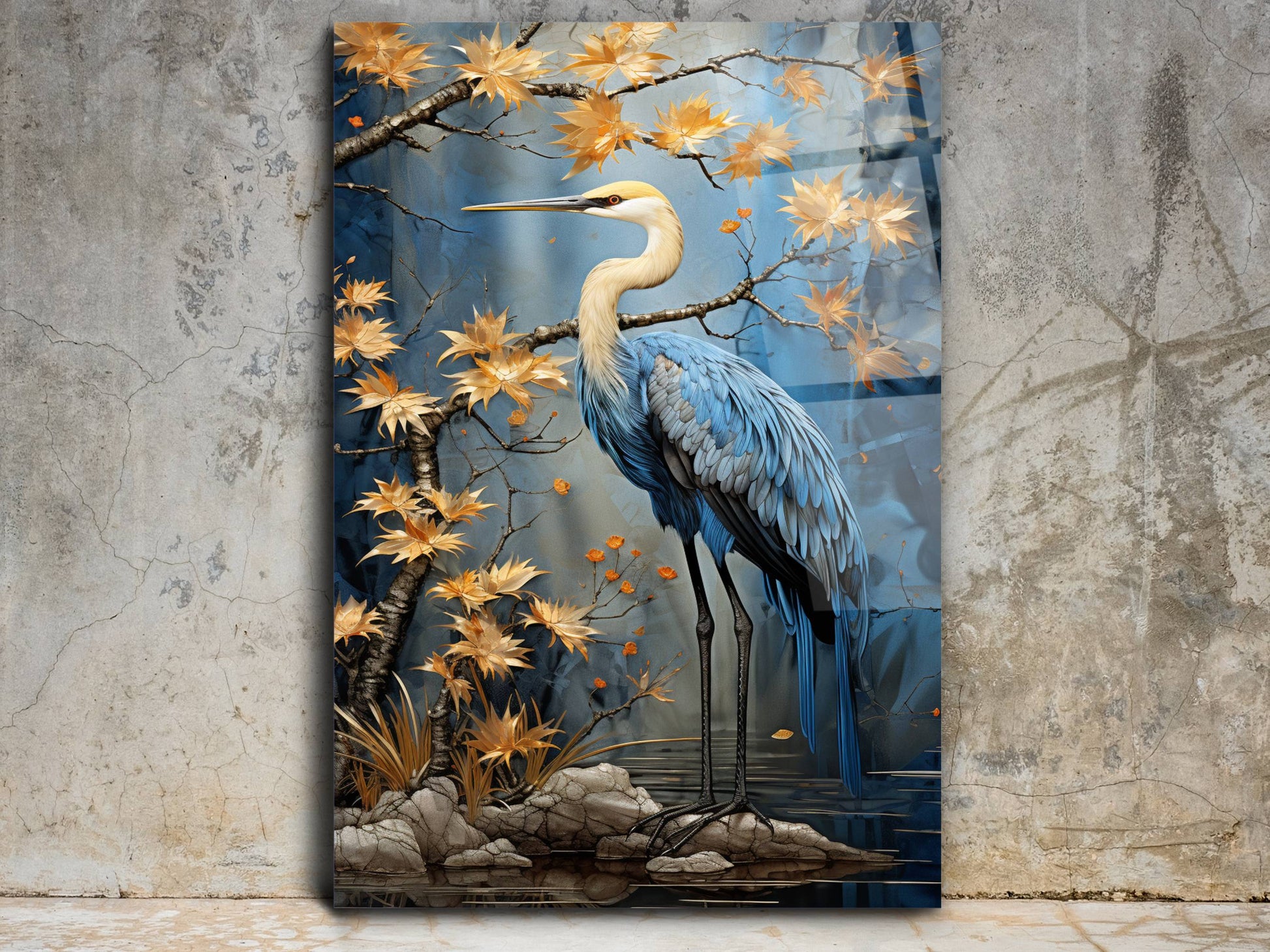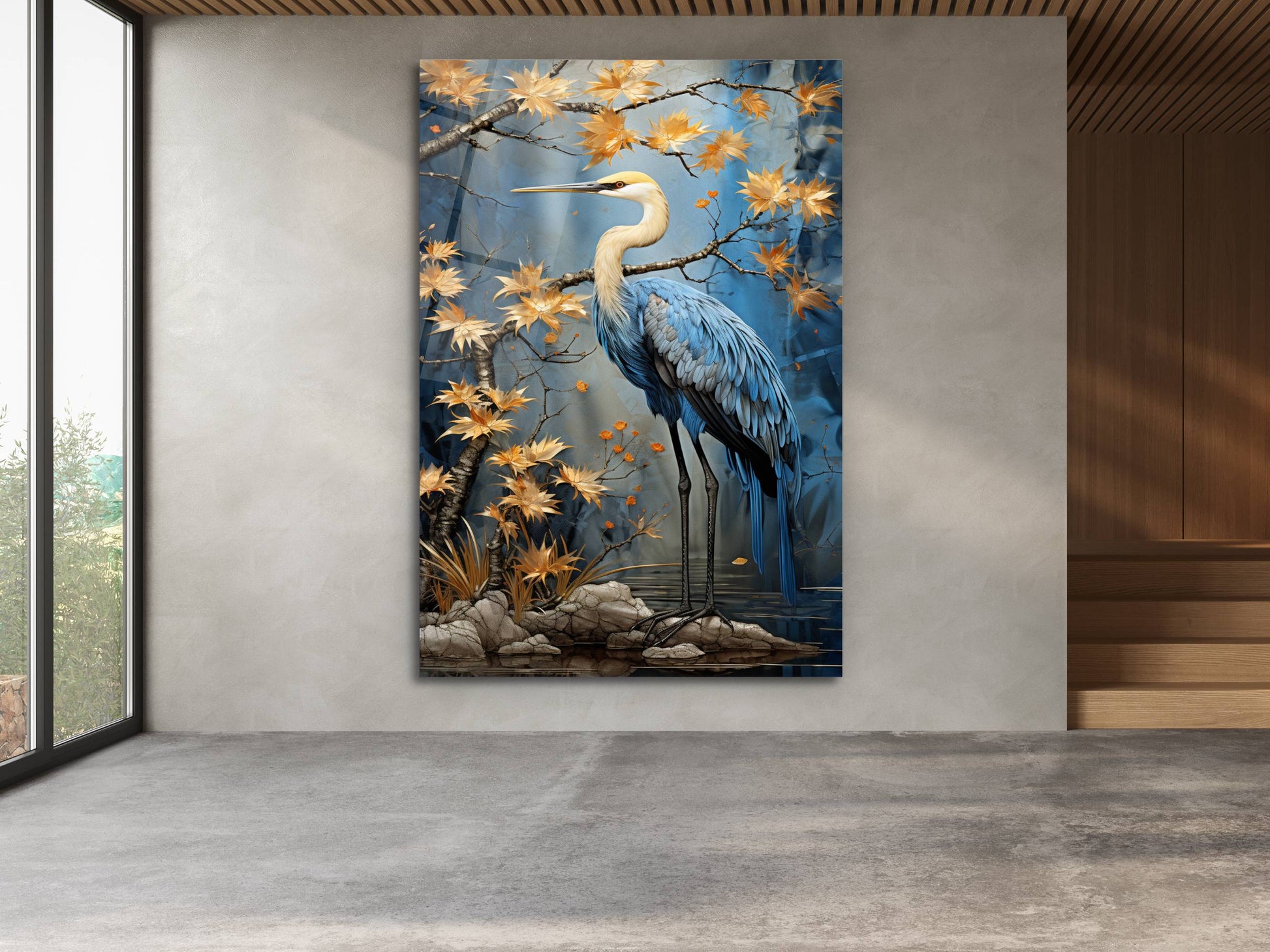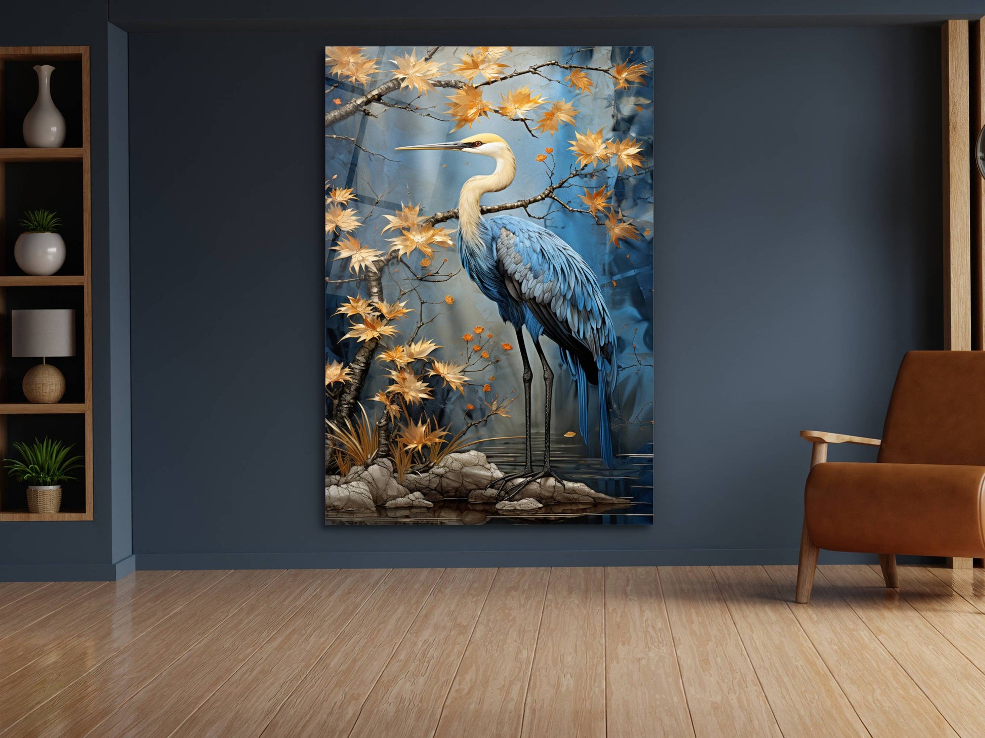 Mavi Balıkçıl Kuşu ve Sonbahar Yaprakları Duvar Tablosu – Doğa Temalı Cam Tablo