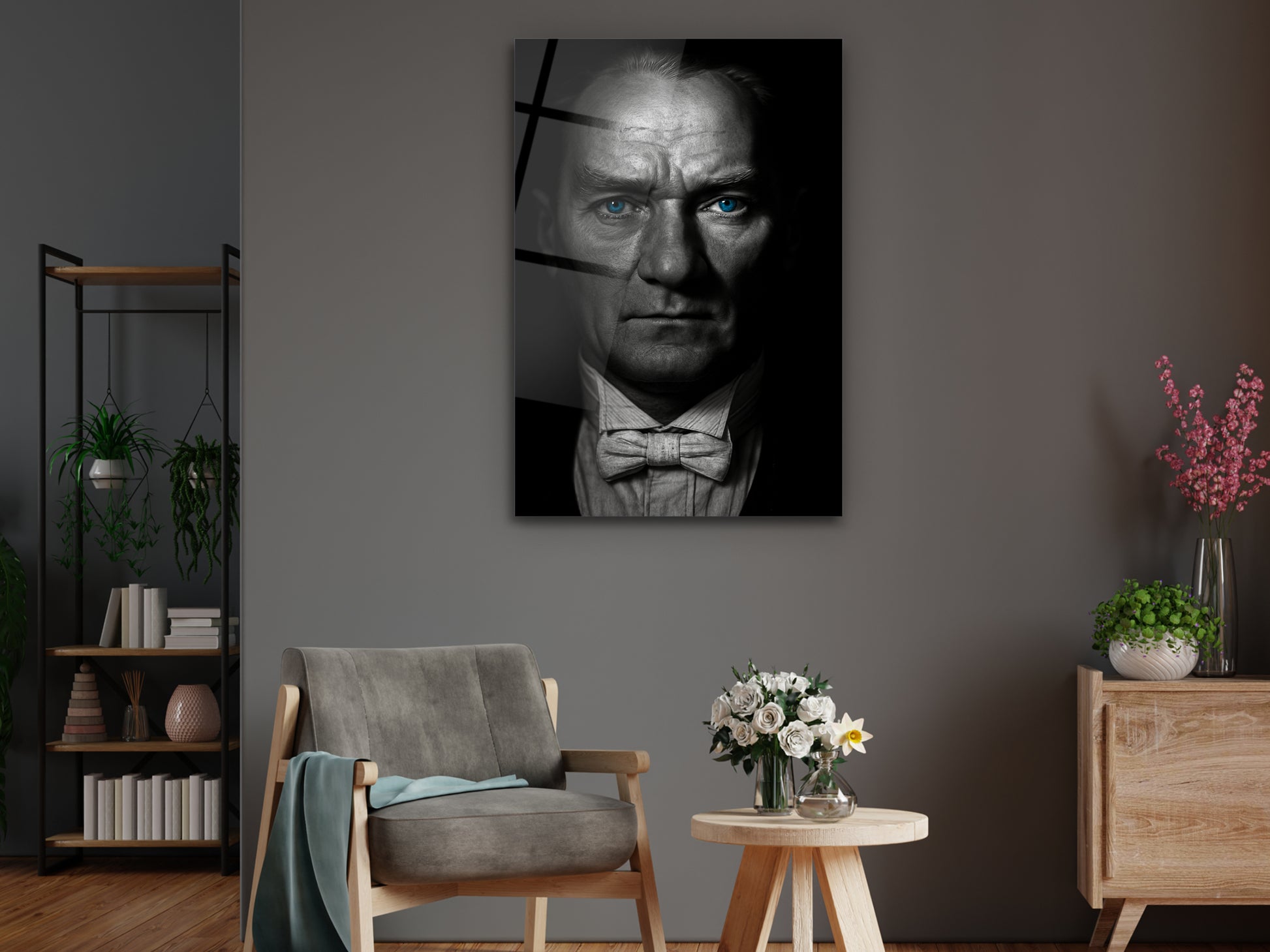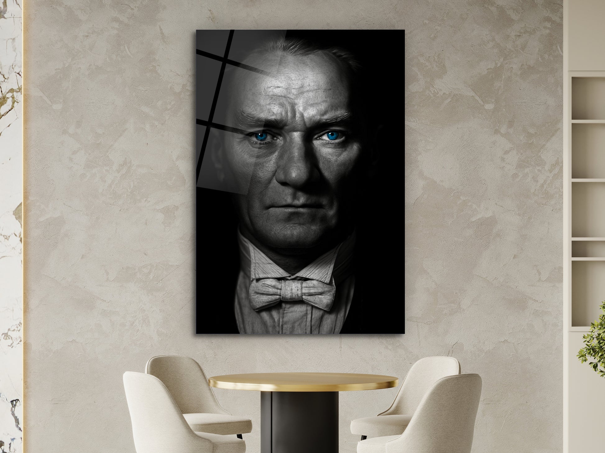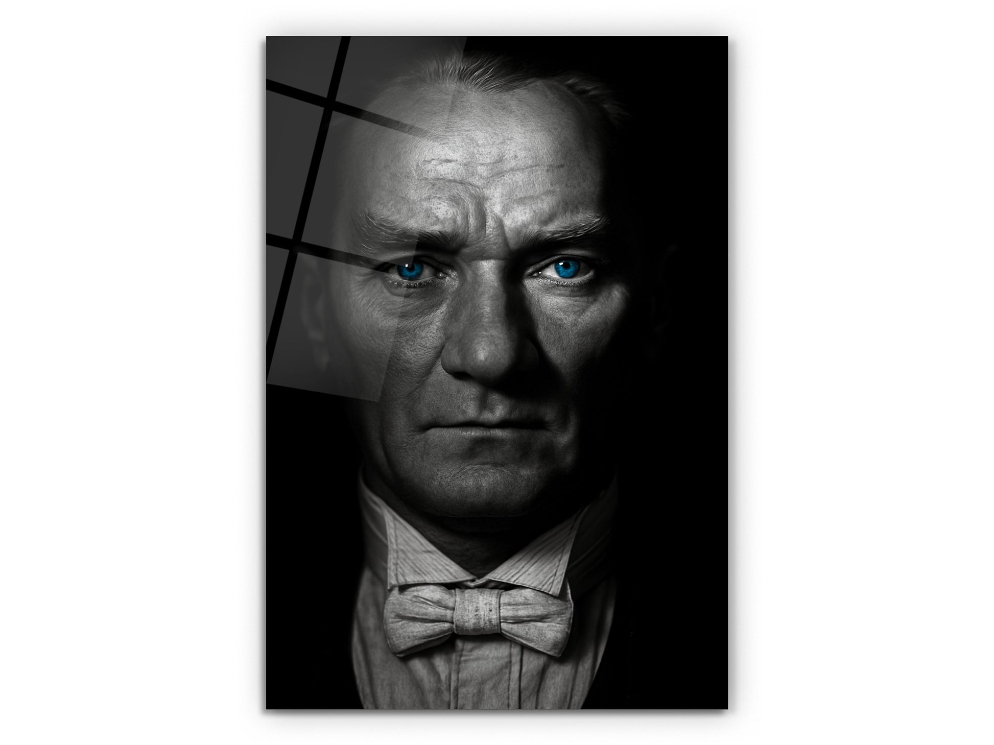 Mavi Gözlü Atatürk Portresi Siyah Beyaz Cam Tablo – Atatürk Tablosu - Modern Ev ve Ofis Dekoru