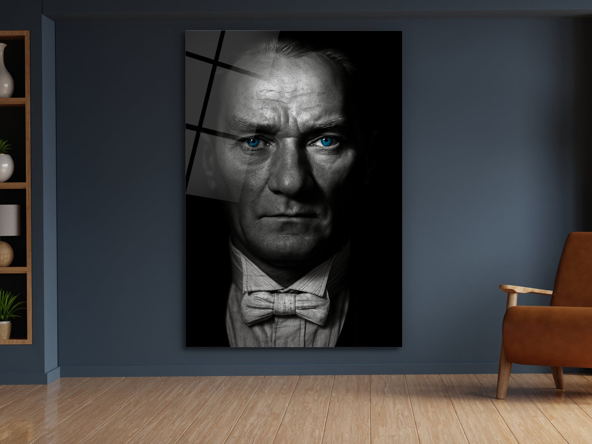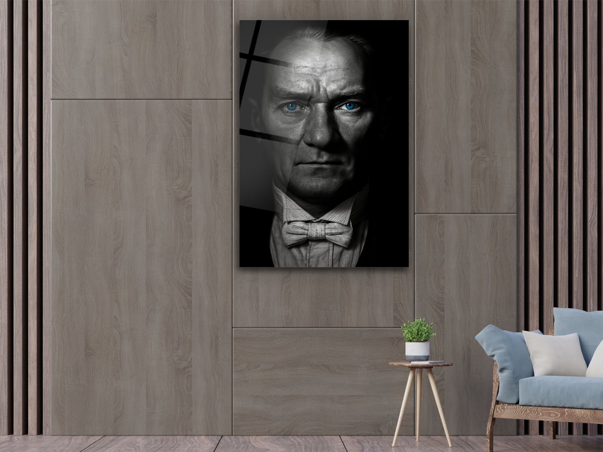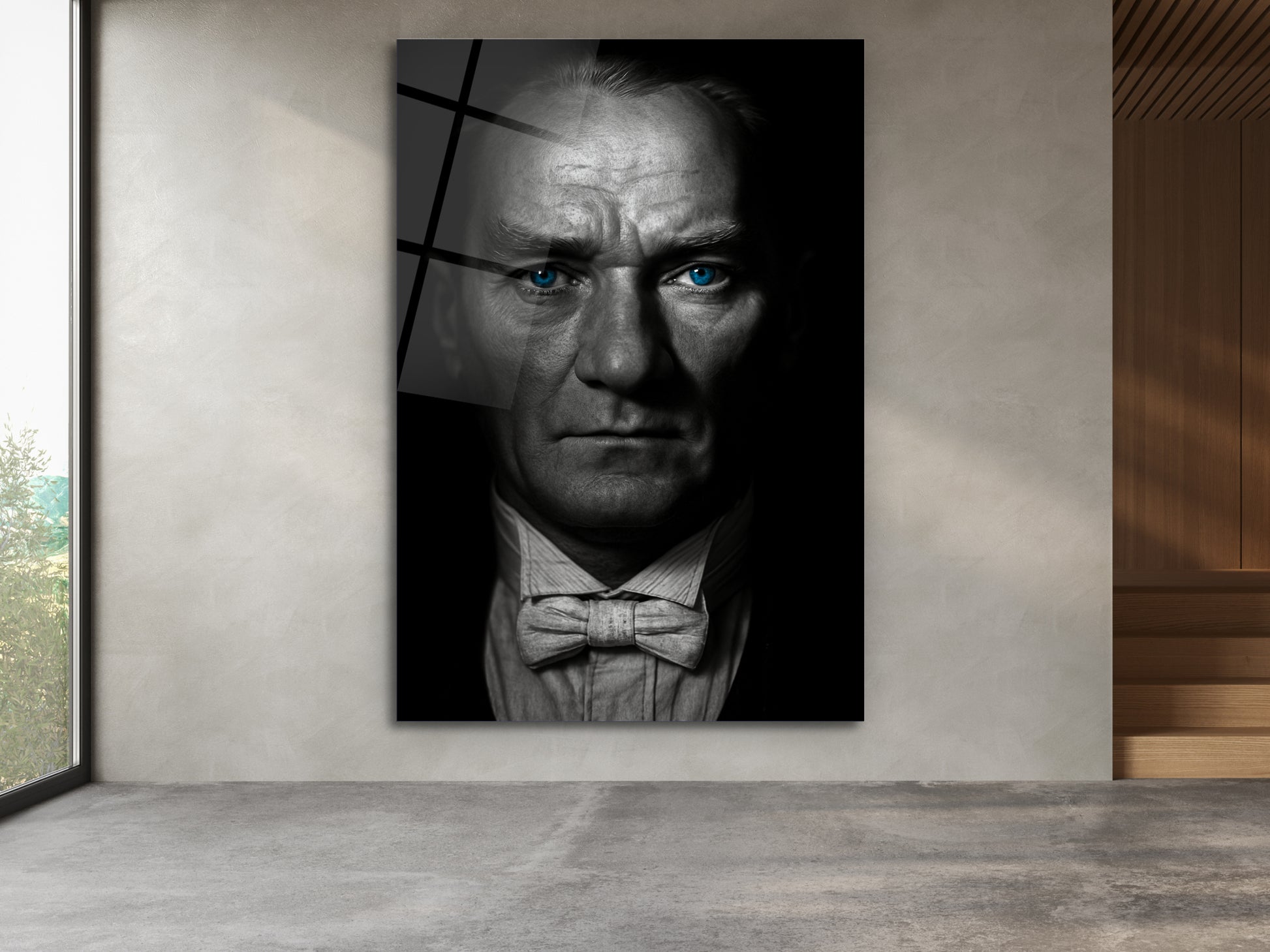 Mavi Gözlü Atatürk Portresi Siyah Beyaz Cam Tablo – Atatürk Tablosu - Modern Ev ve Ofis Dekoru