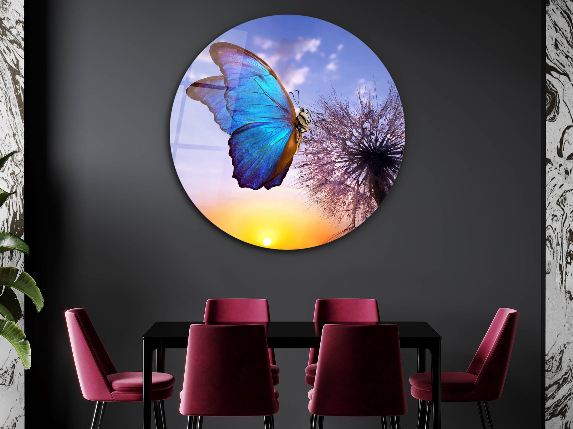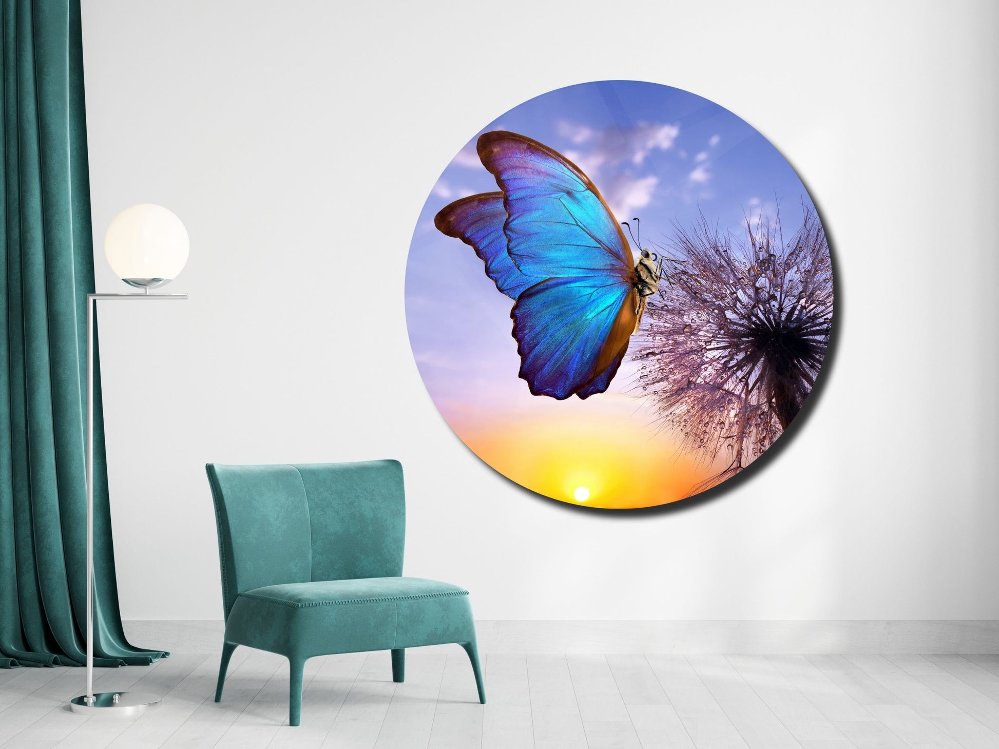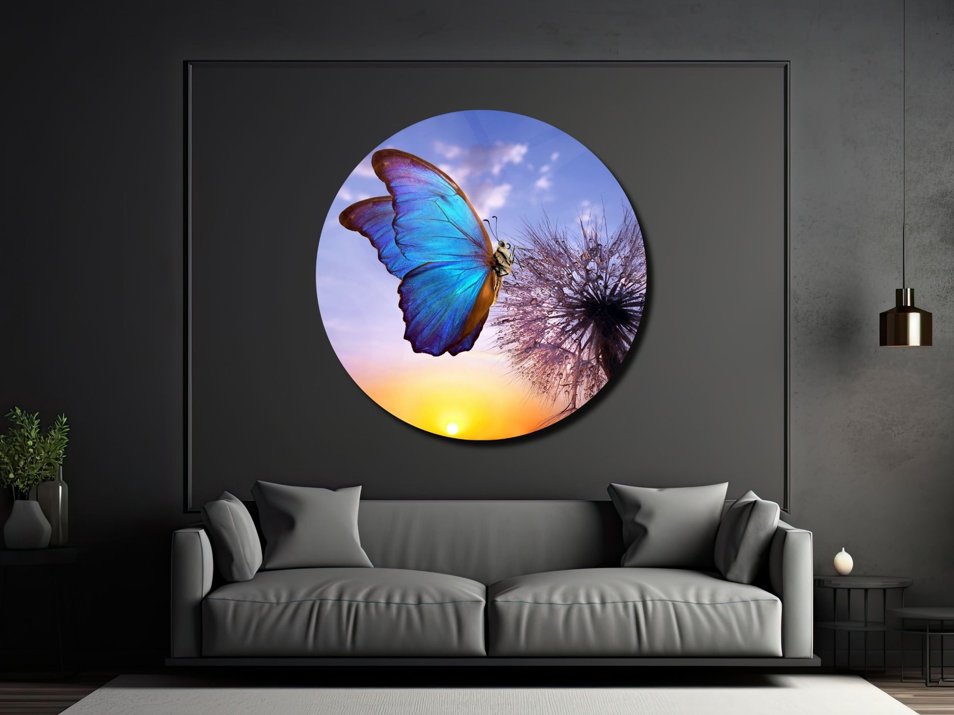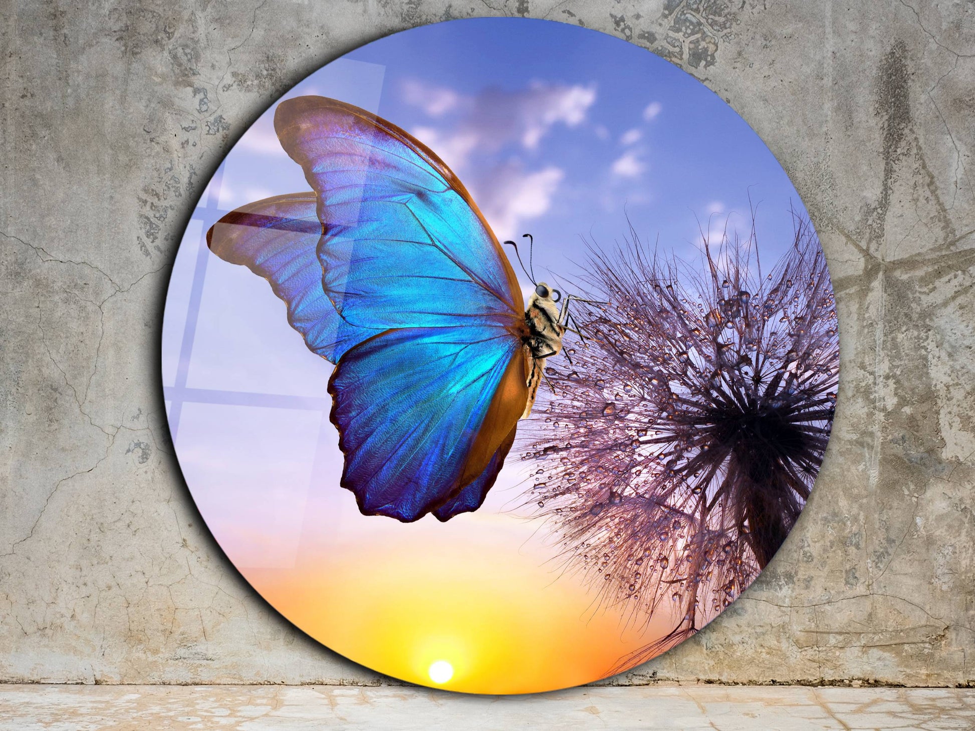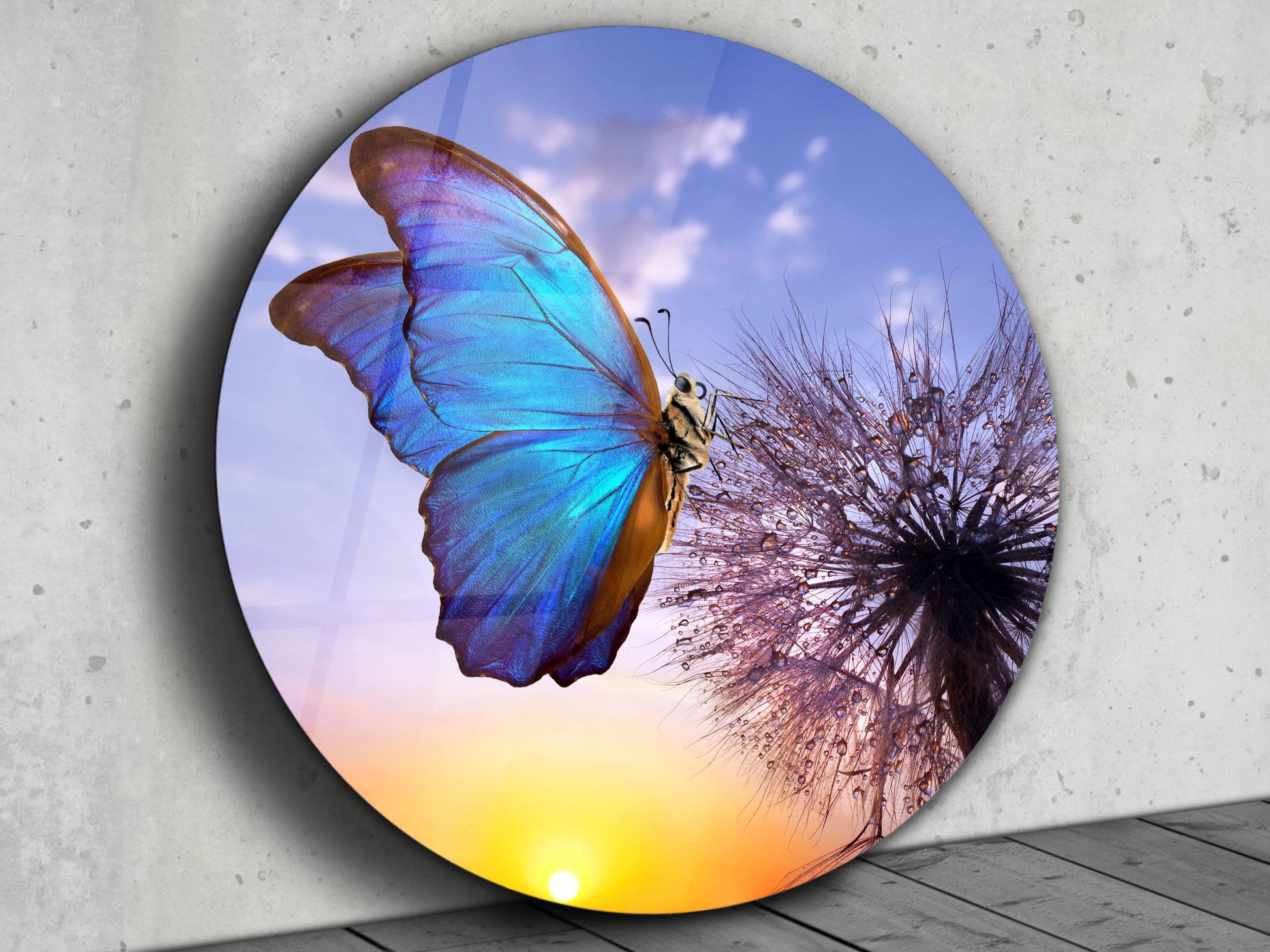 Mavi Kelebek ve Karahindiba Cam Tablo – Gün Batımı Temalı Yuvarlak Duvar Dekoru
