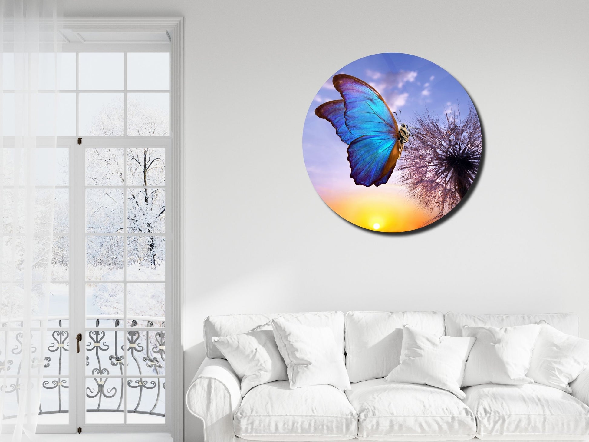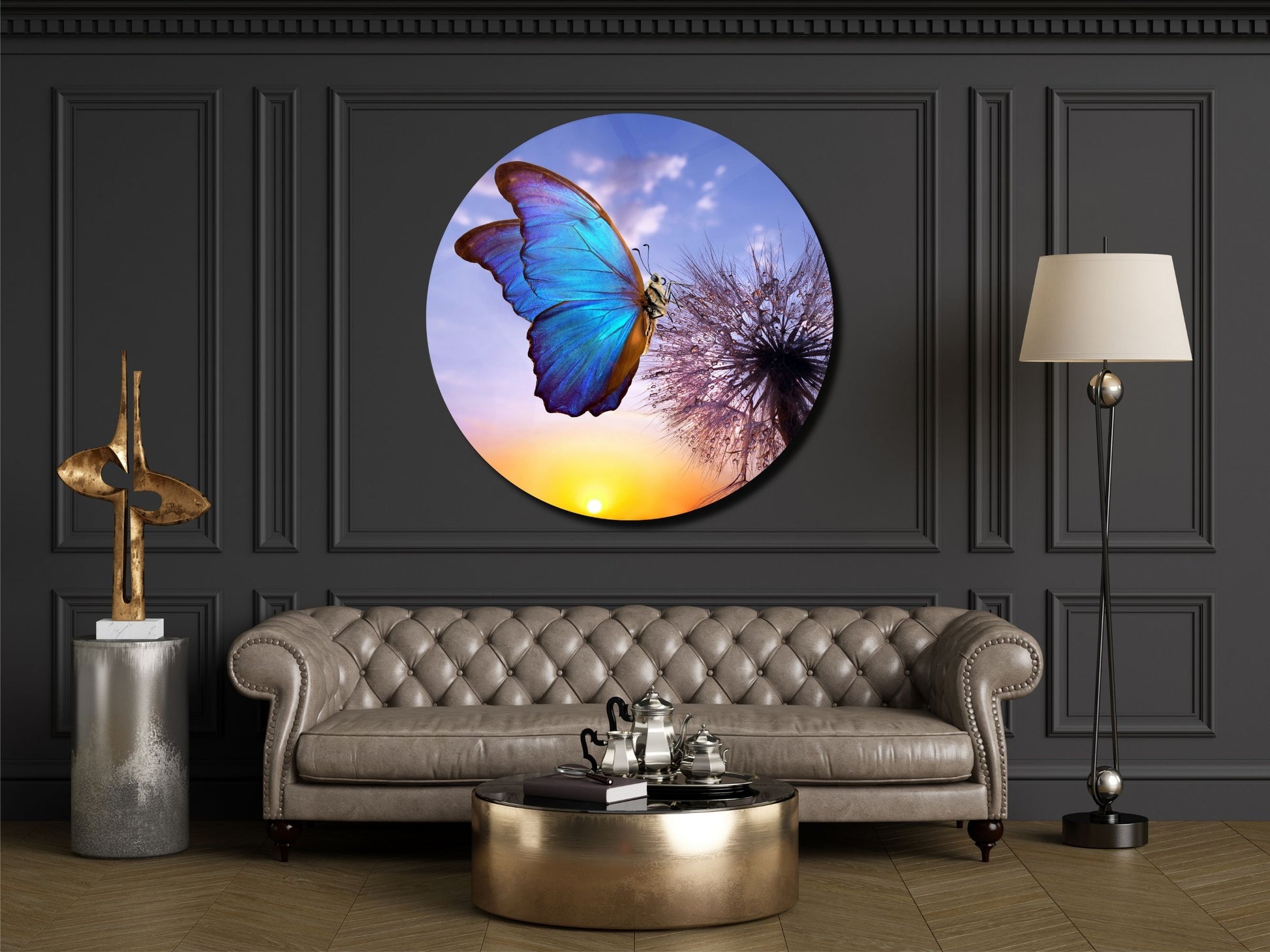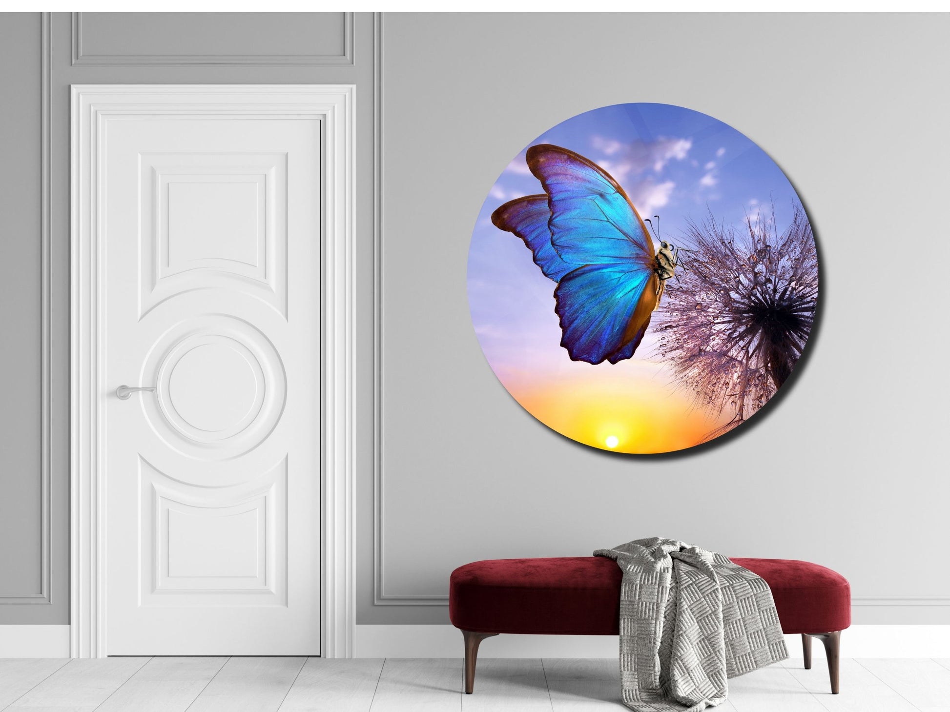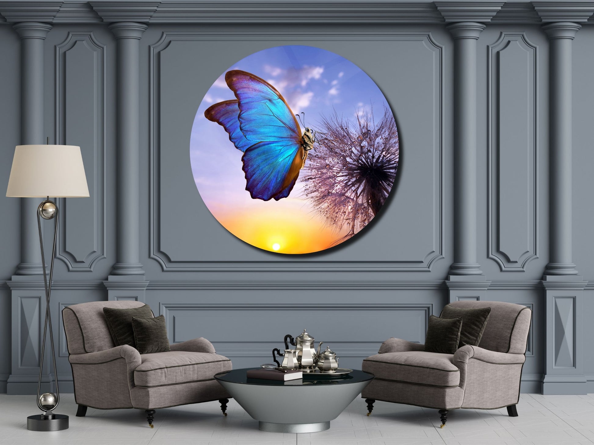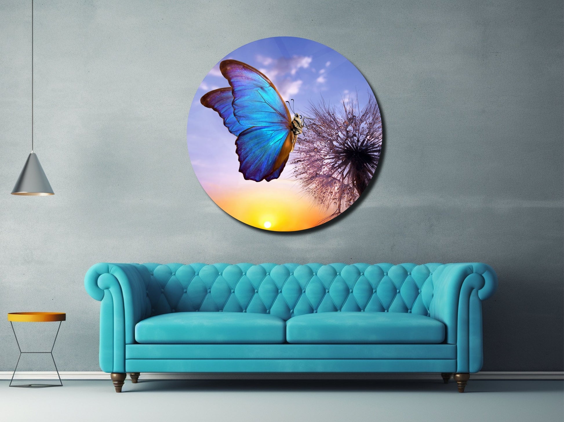 Mavi Kelebek ve Karahindiba Cam Tablo – Gün Batımı Temalı Yuvarlak Duvar Dekoru