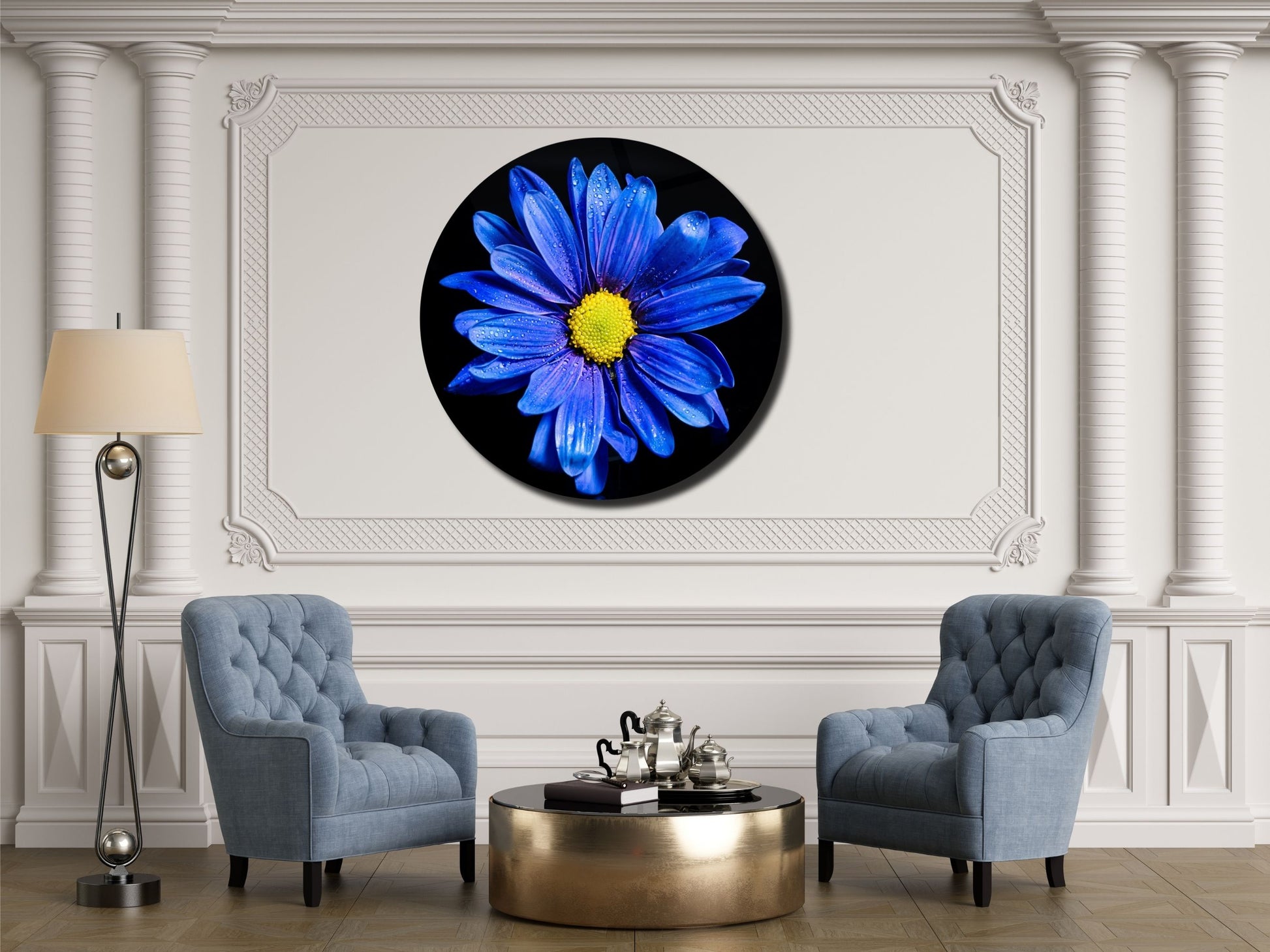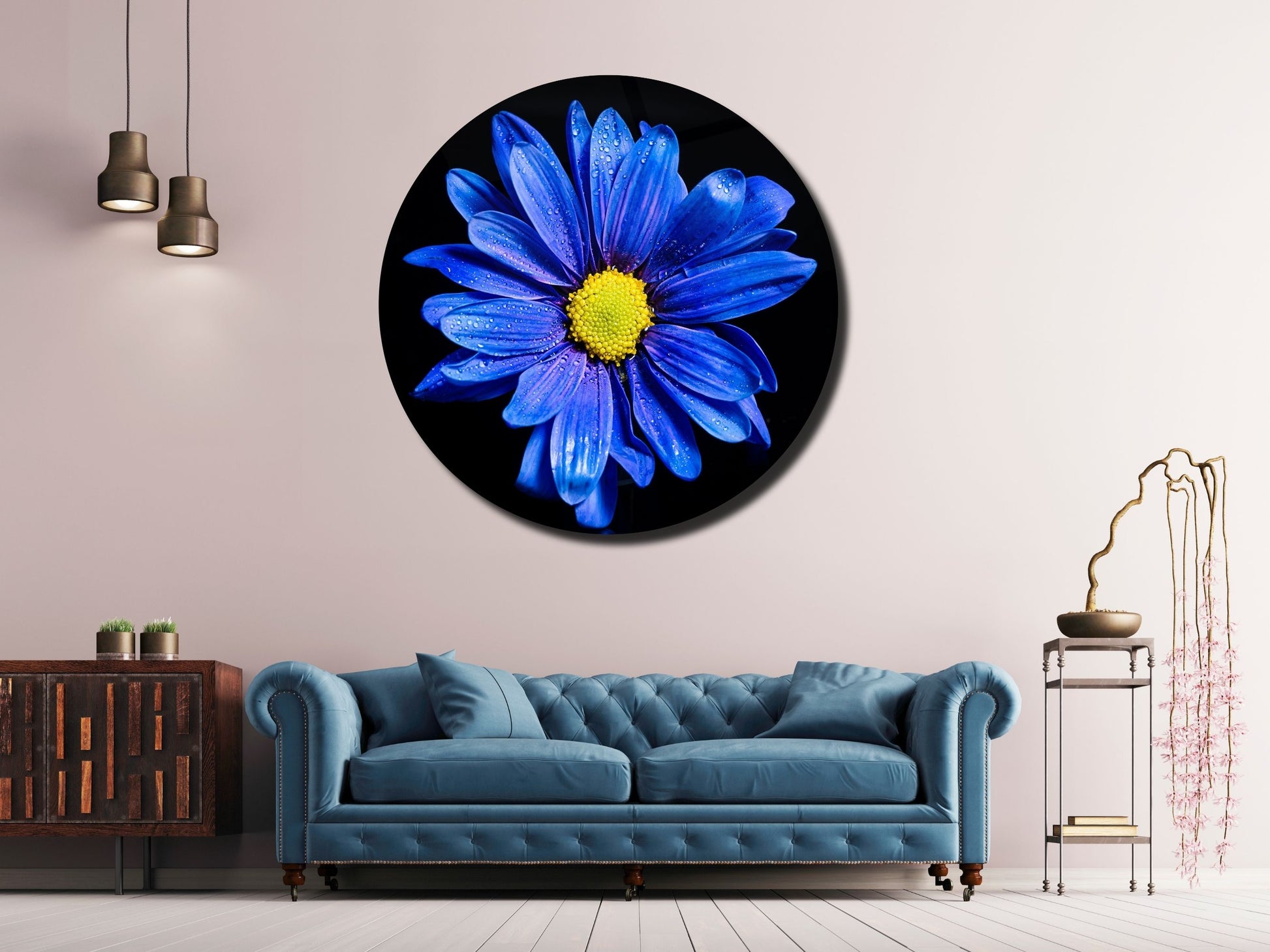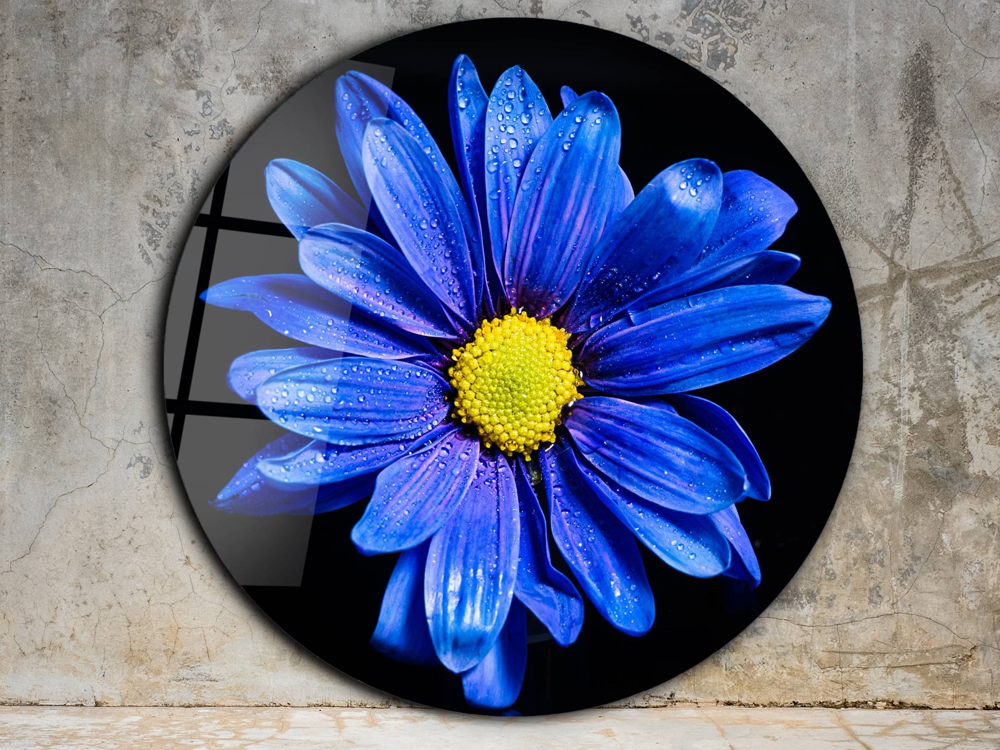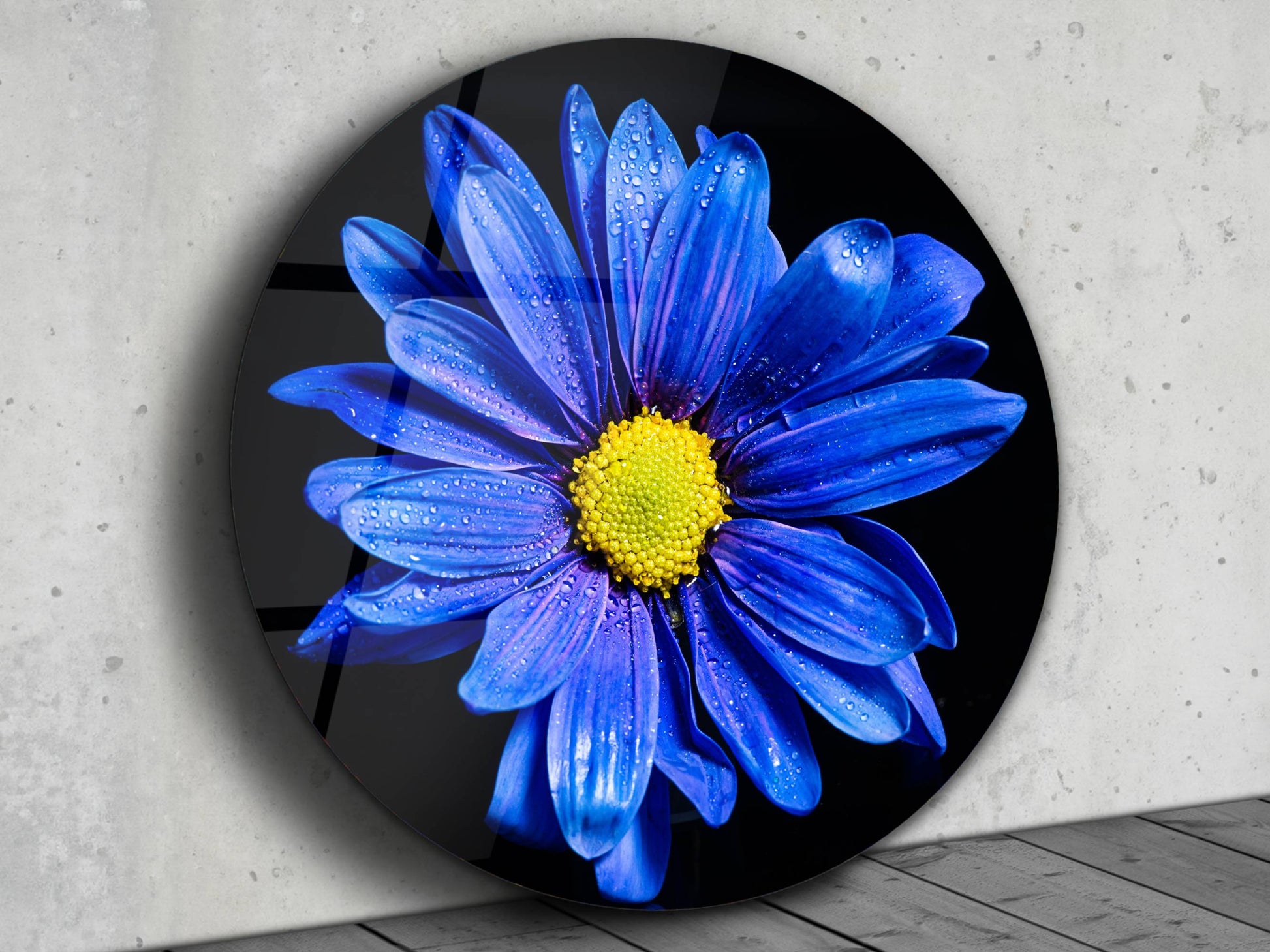Mavi Papatya Cam Tablo – Yuvarlak Modern Çiçek Duvar Dekoru