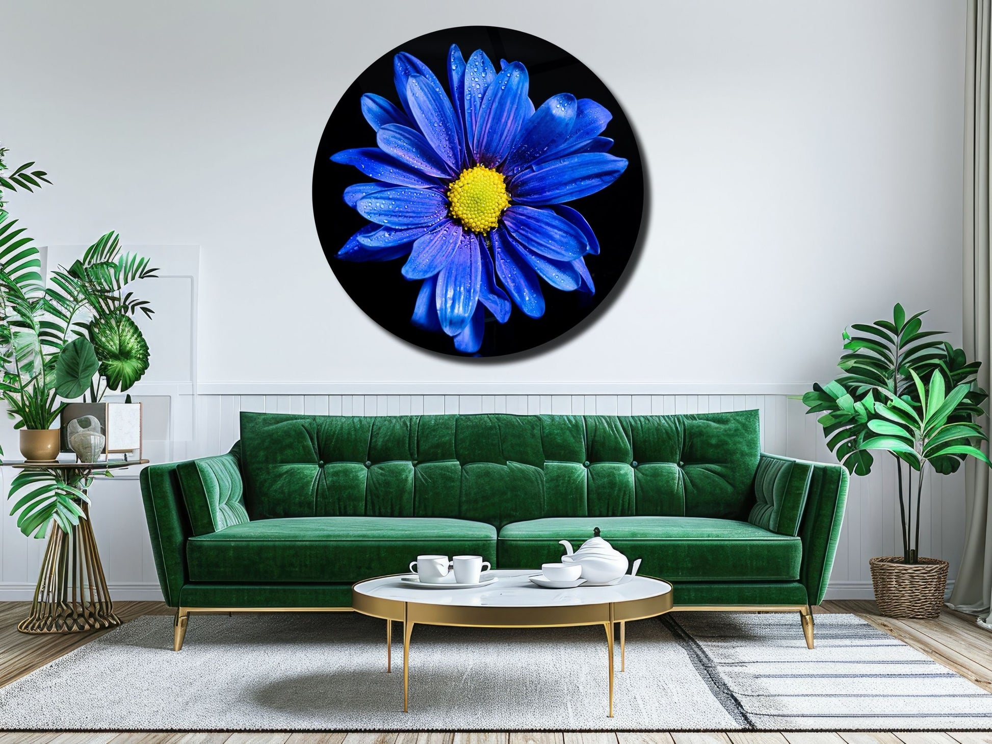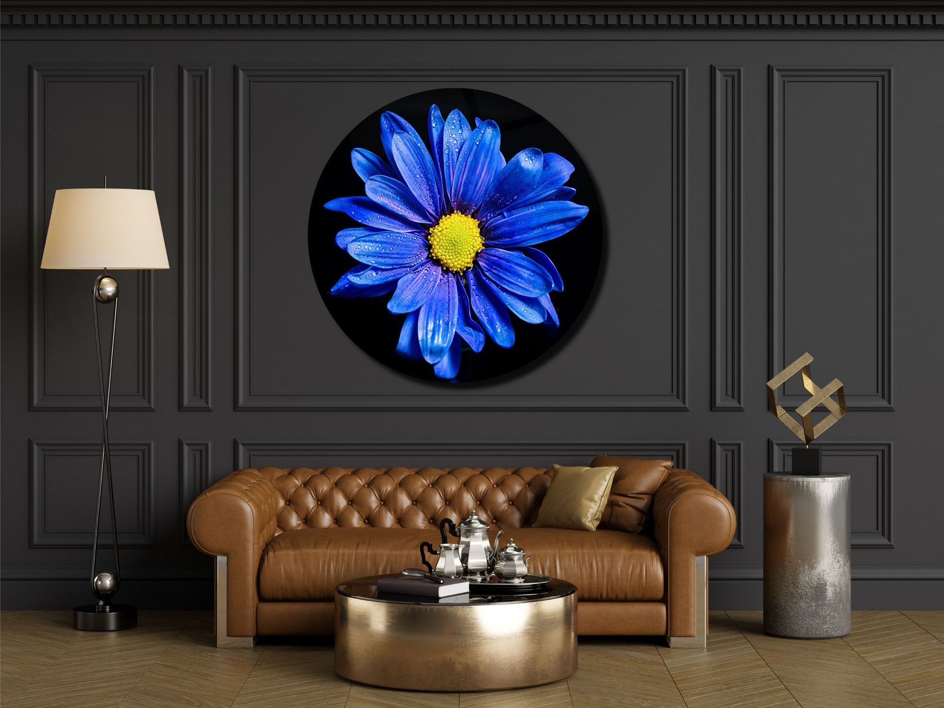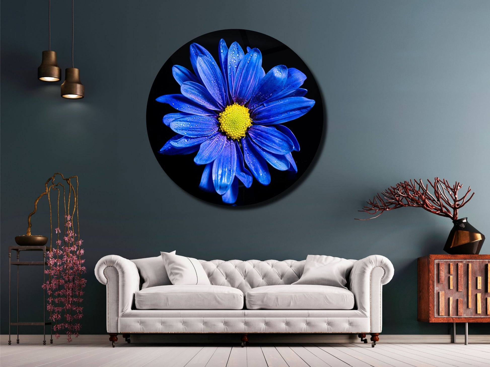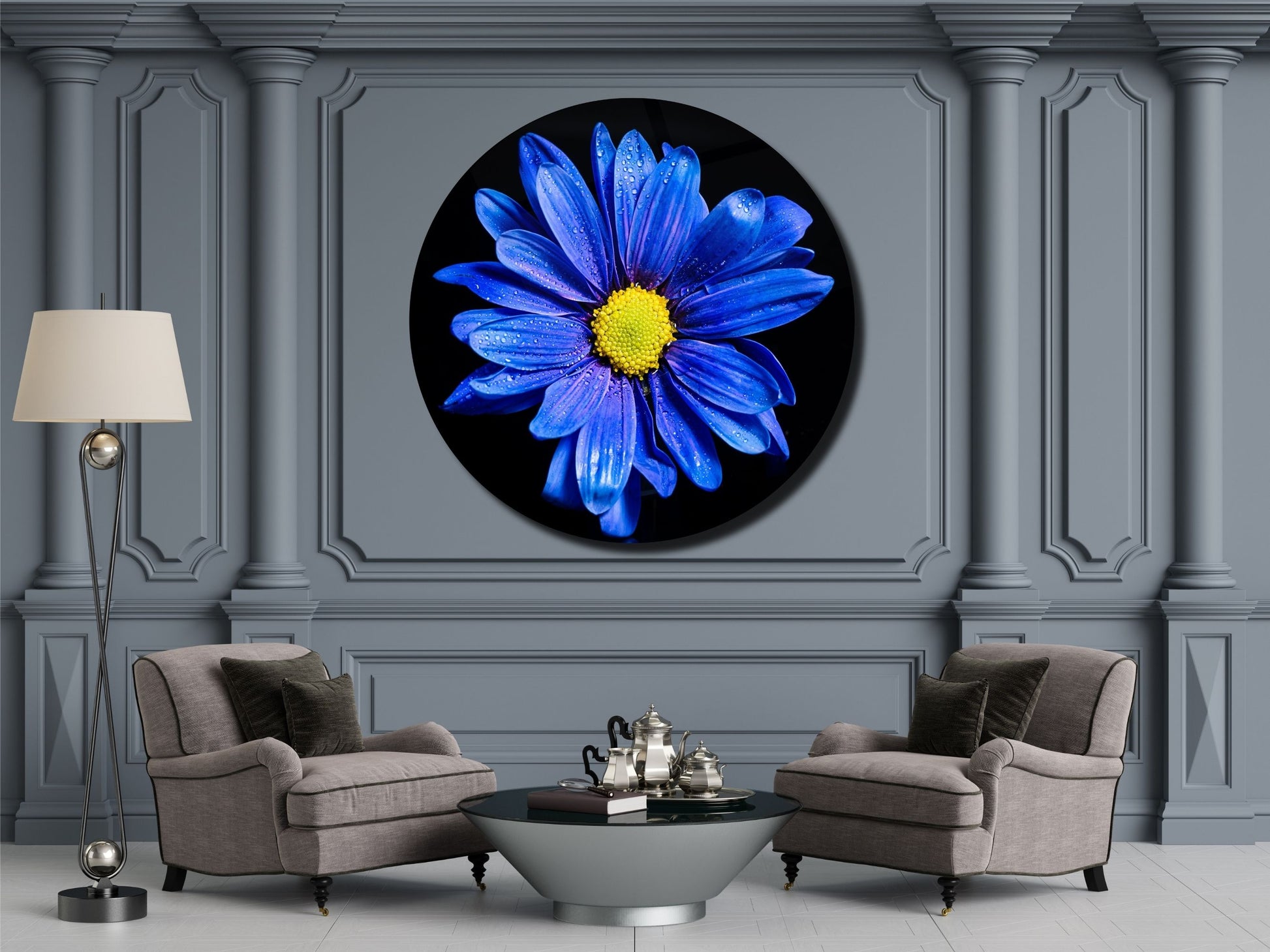 Mavi Papatya Cam Tablo – Yuvarlak Modern Çiçek Duvar Dekoru