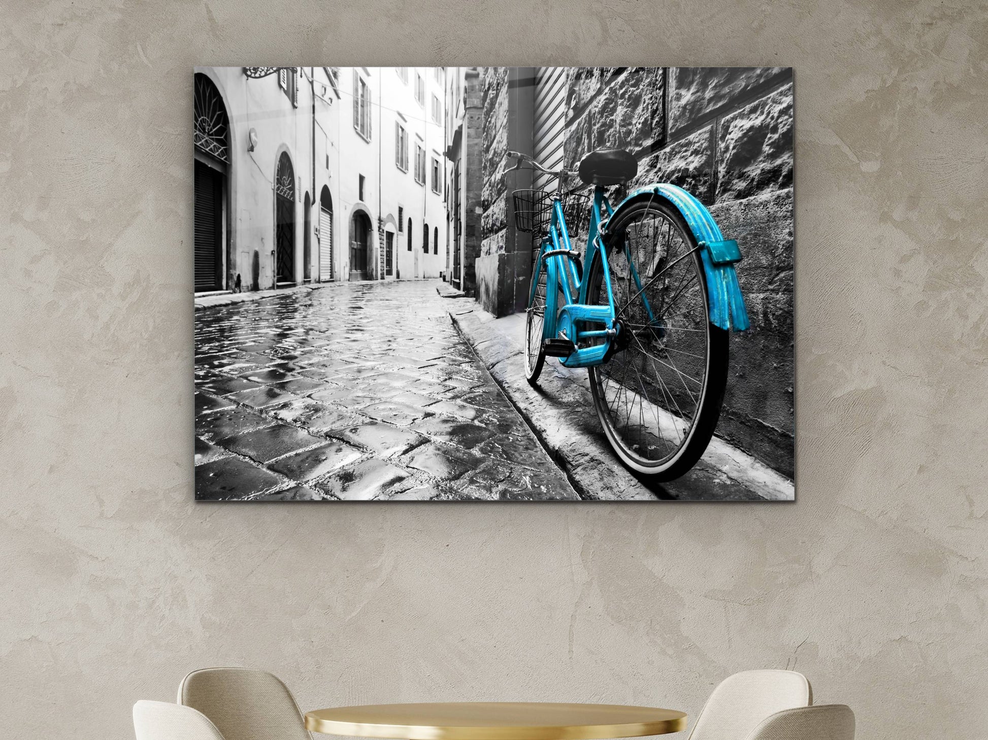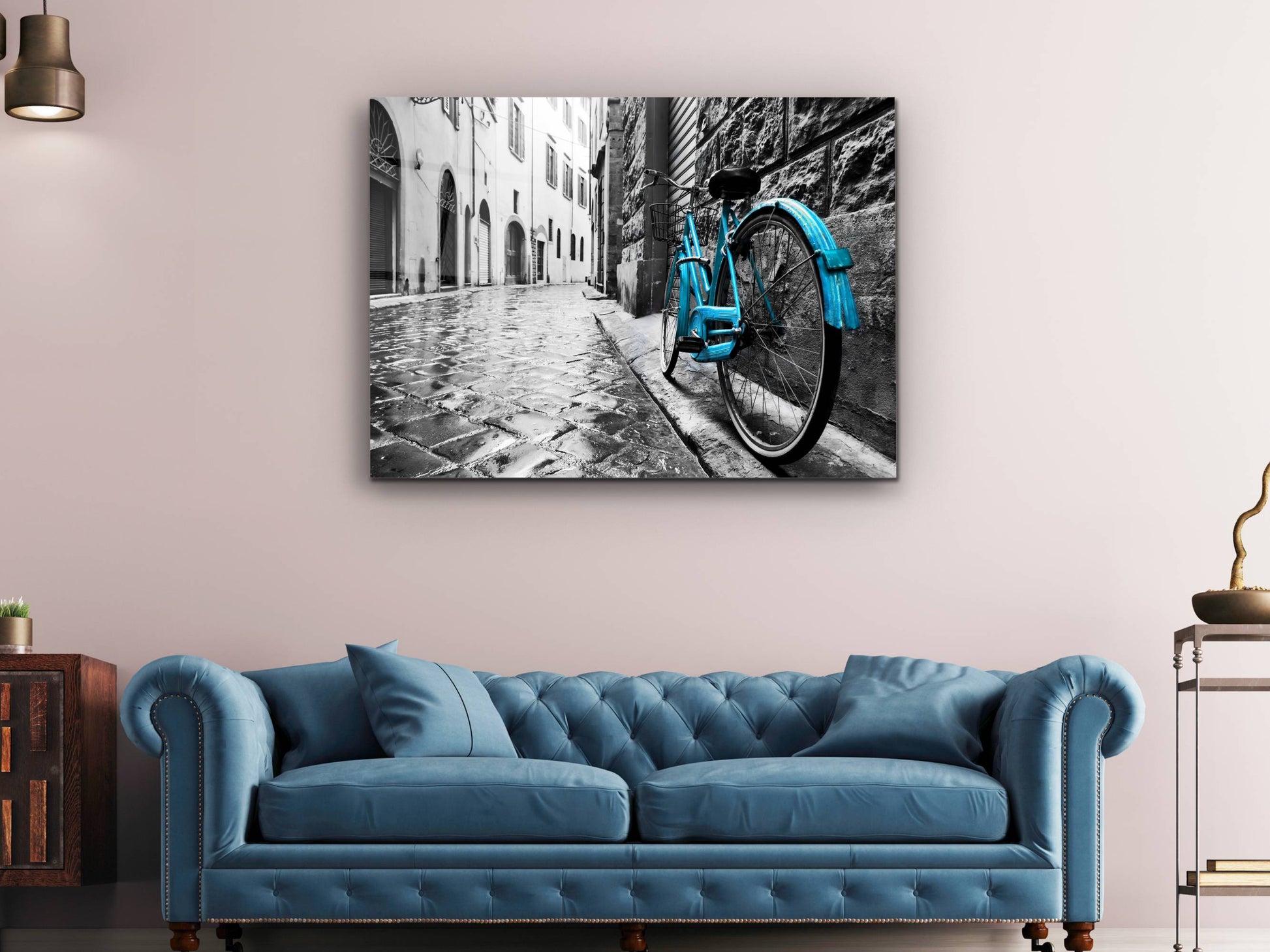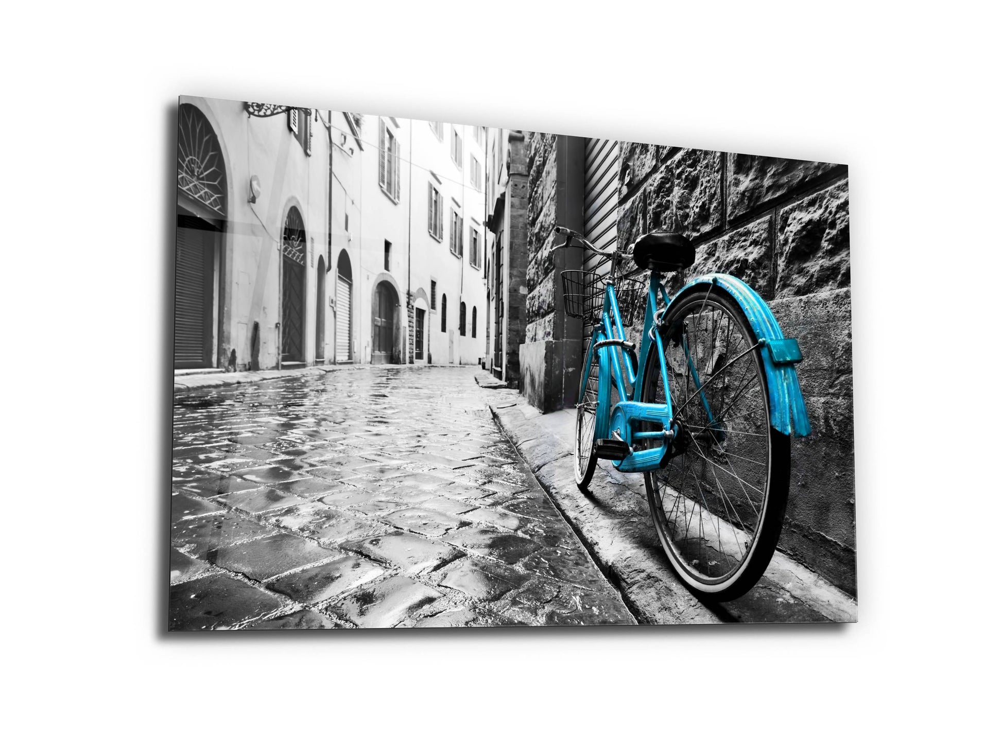 Mavi Retro Bisiklet Cam Tablosu – Soyut ve Modern Dekoratif Ev ve Ofis Tablosu