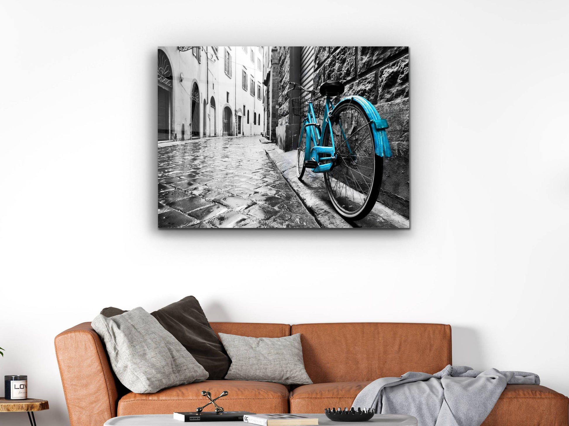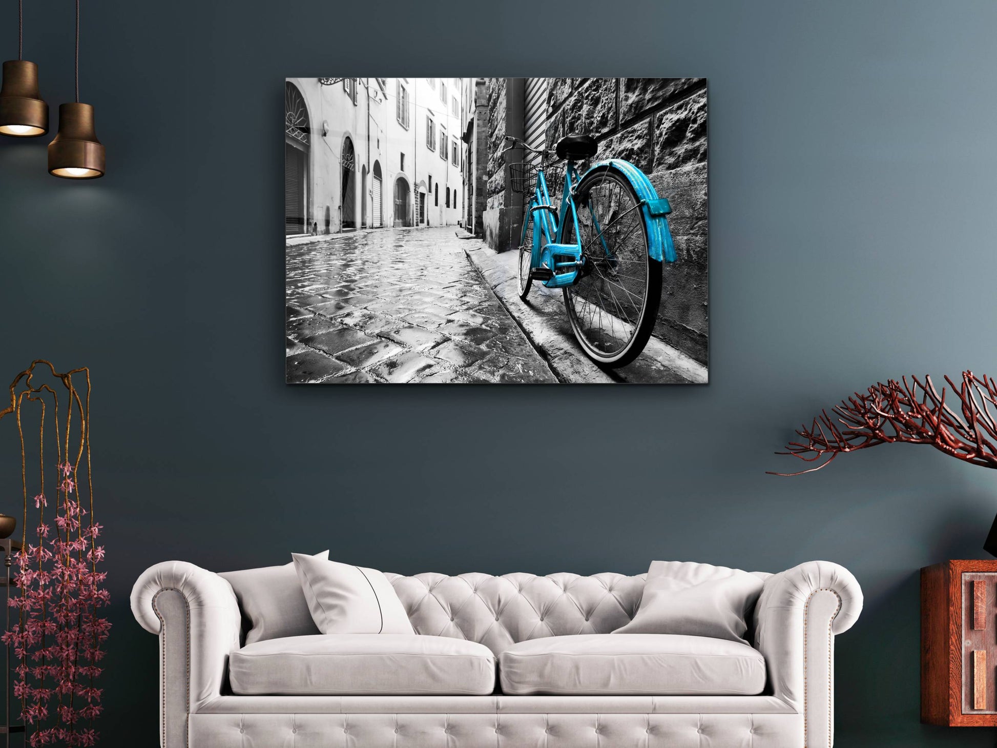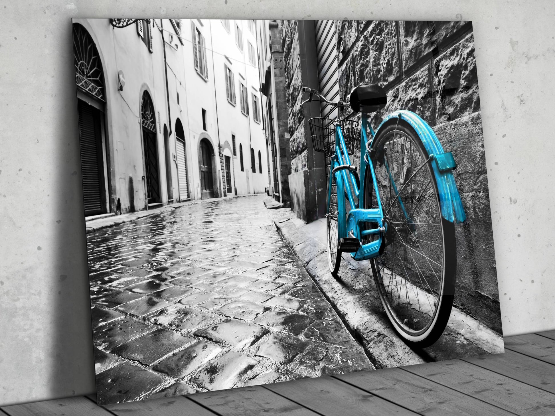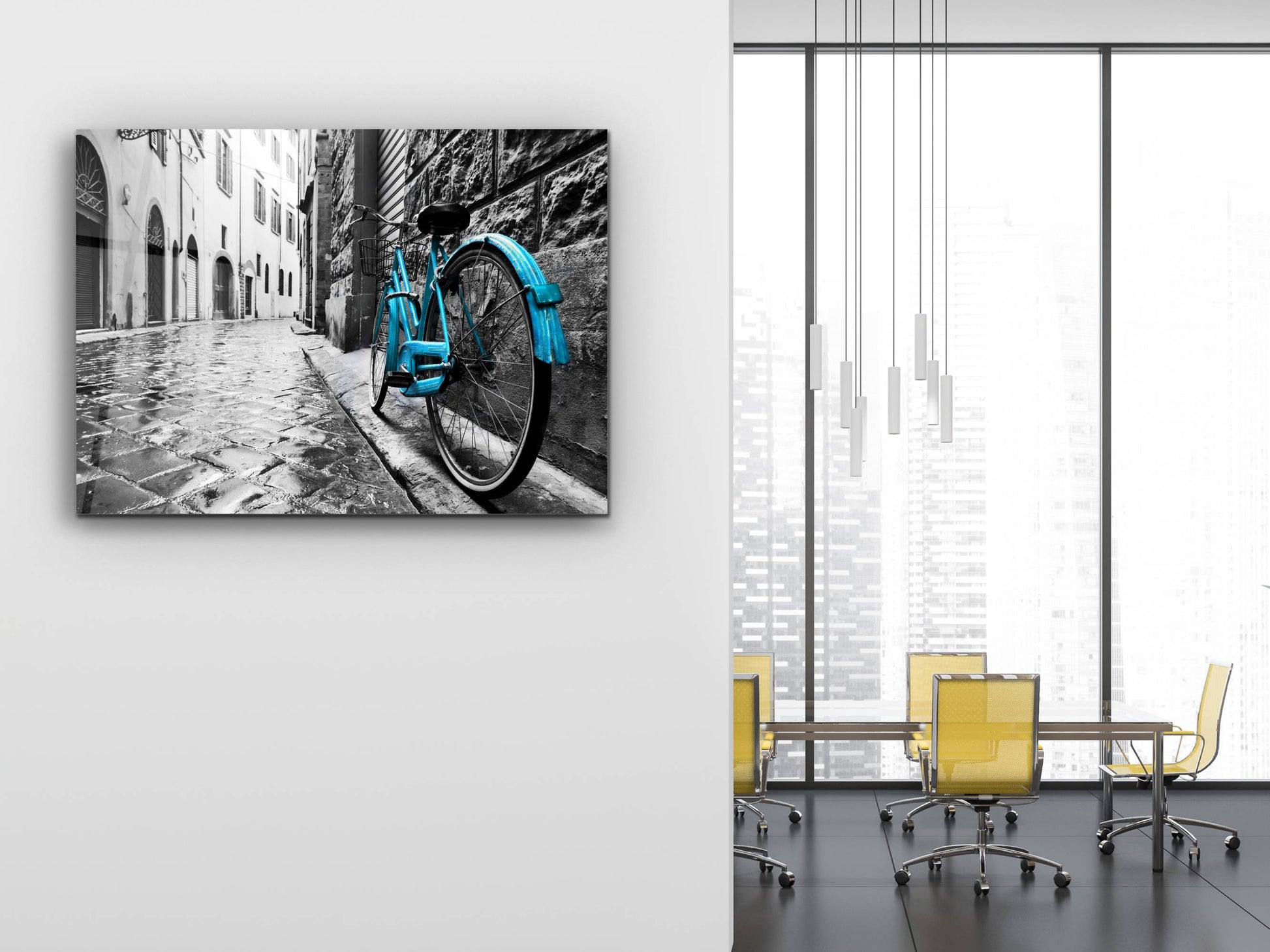 Mavi Retro Bisiklet Cam Tablosu – Soyut ve Modern Dekoratif Ev ve Ofis Tablosu