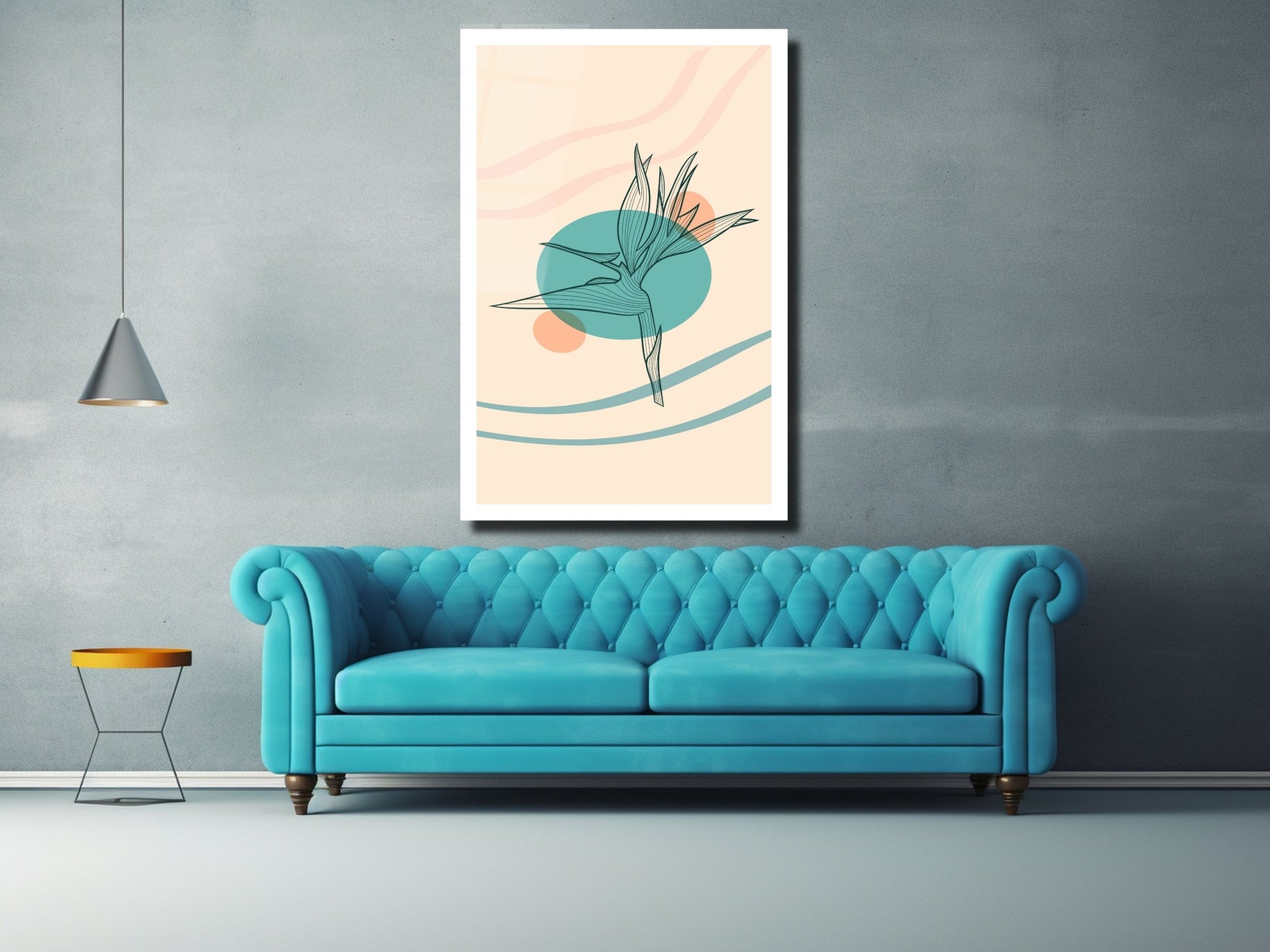 Minimalist Kuş Cenneti Çiçeği Cam Tablo – Çizgisel Botanik Duvar Dekoru – Pastel Renkli Modern Sanat
