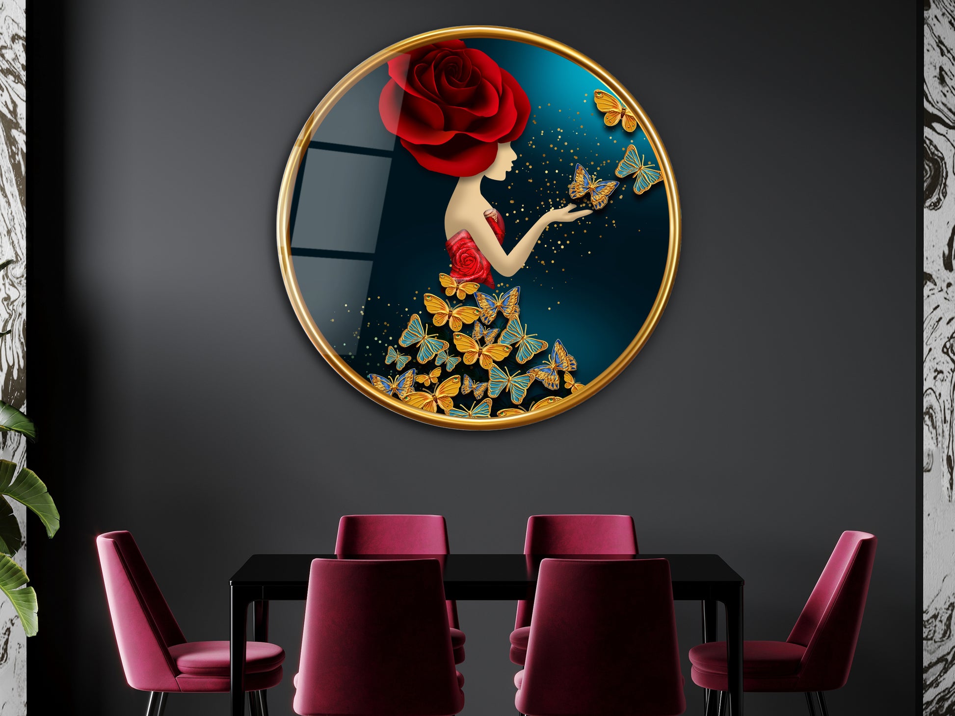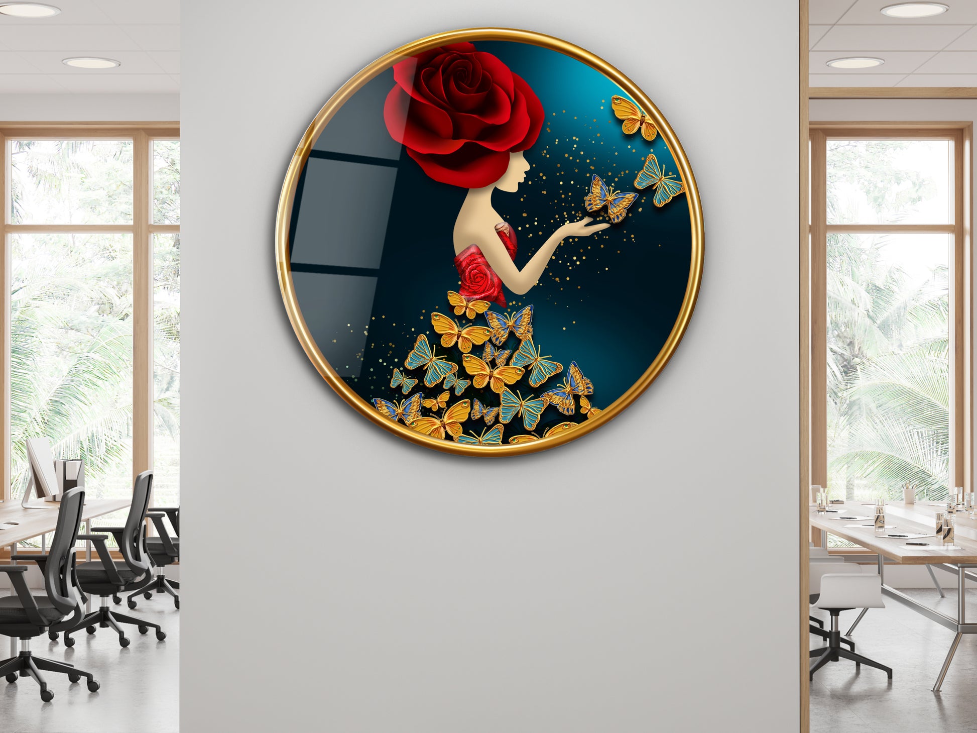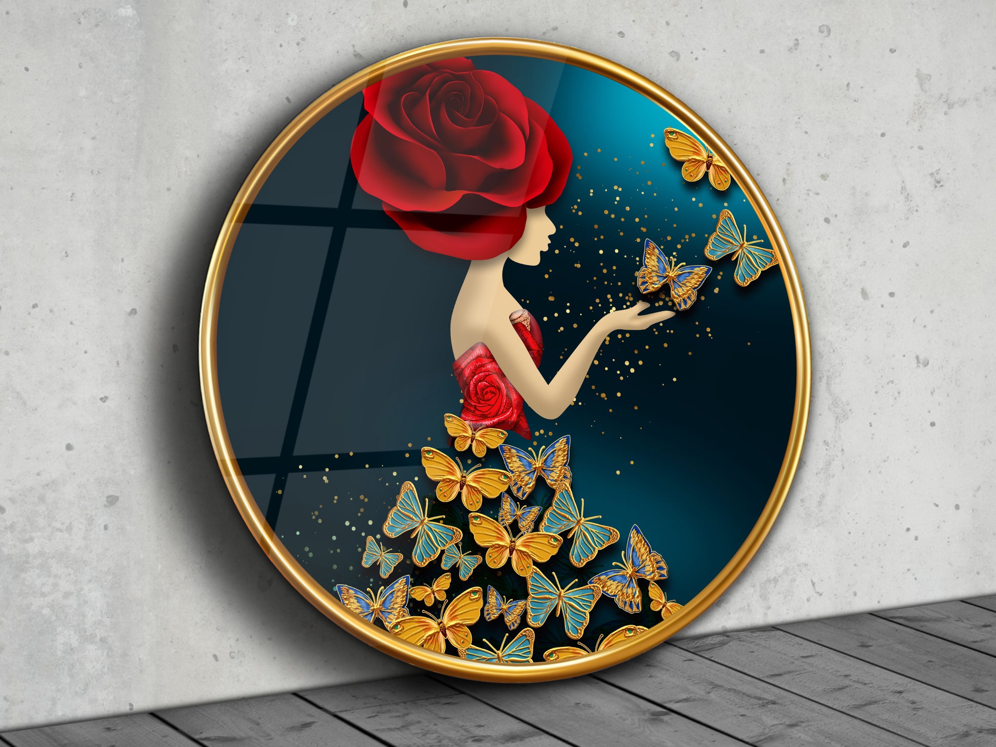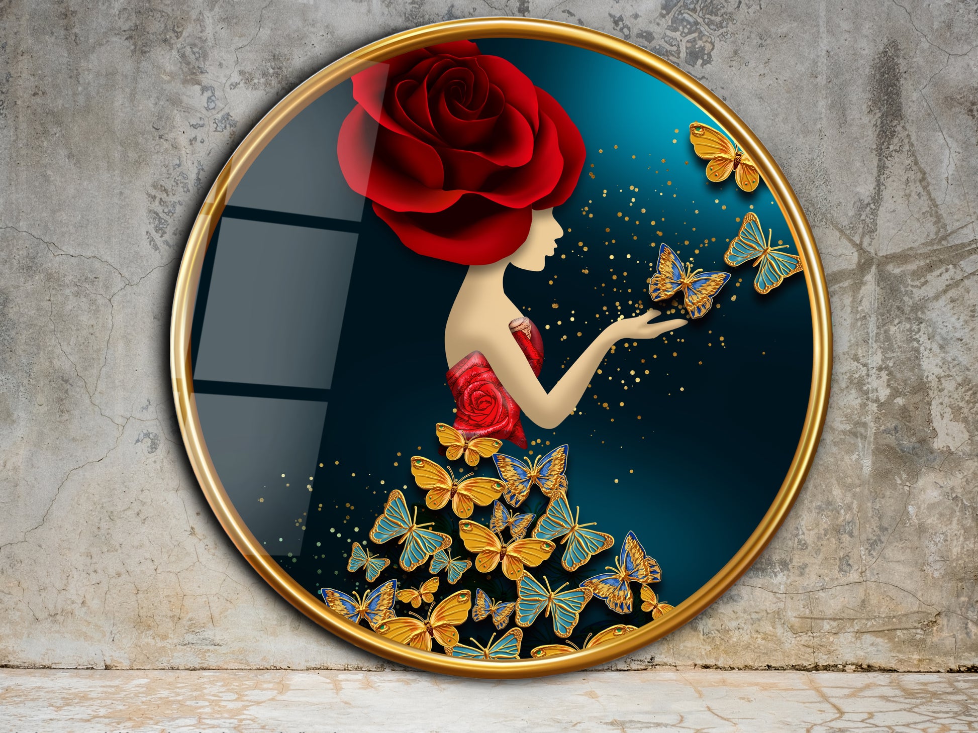 Modern Soyut Cam Tablo – Ev ve Ofis Duvar Dekoru Çiçek Kelebek Kadın
