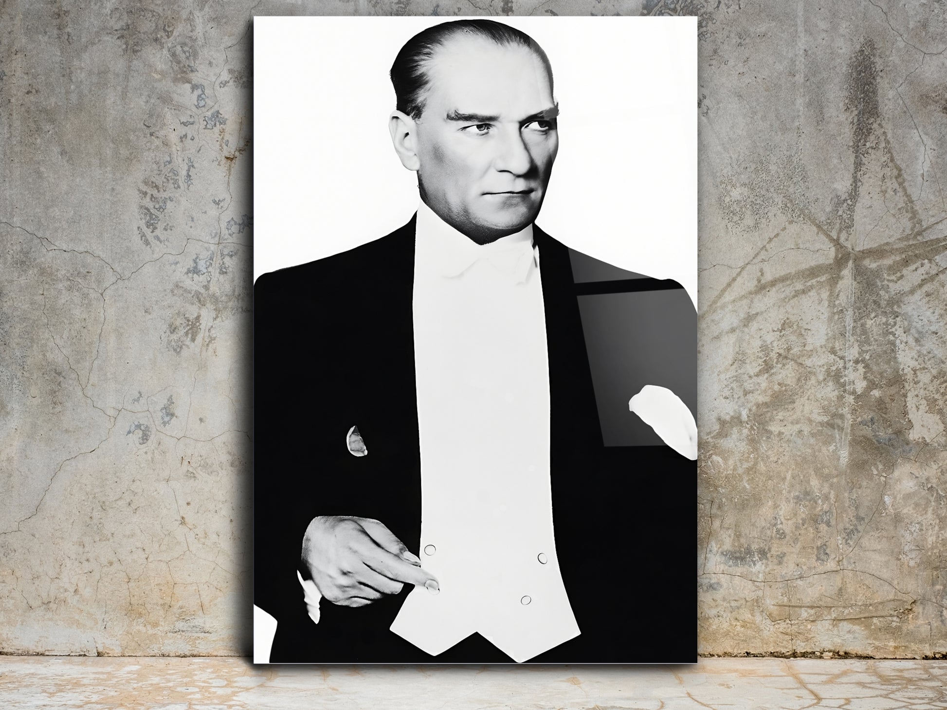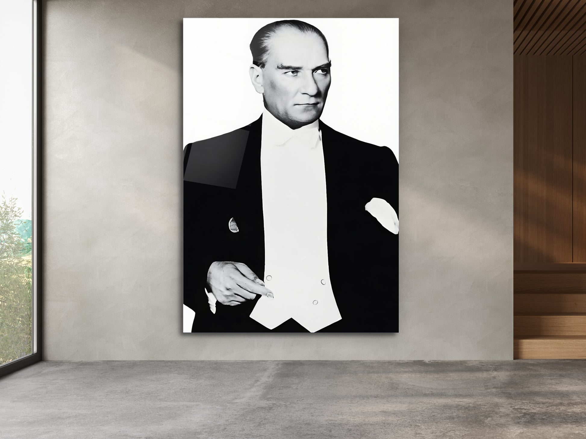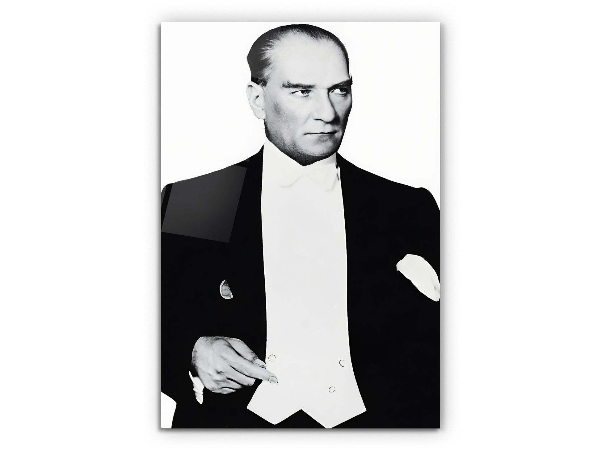 Mustafa Kemal Atatürk Siyah Beyaz Portre Cam Tablo - Atatürk Tablosu - Modern Ev ve Ofis Dekoru