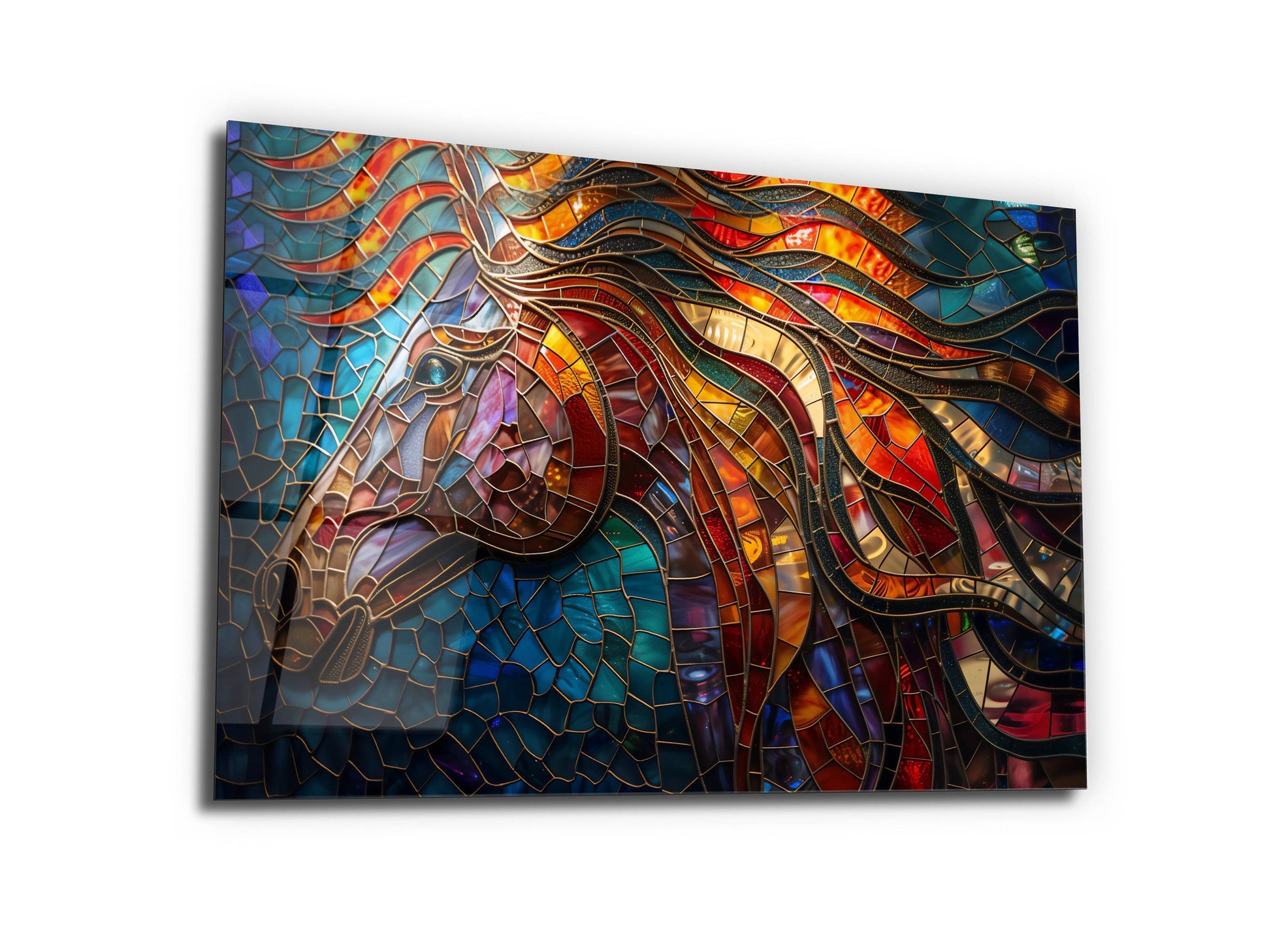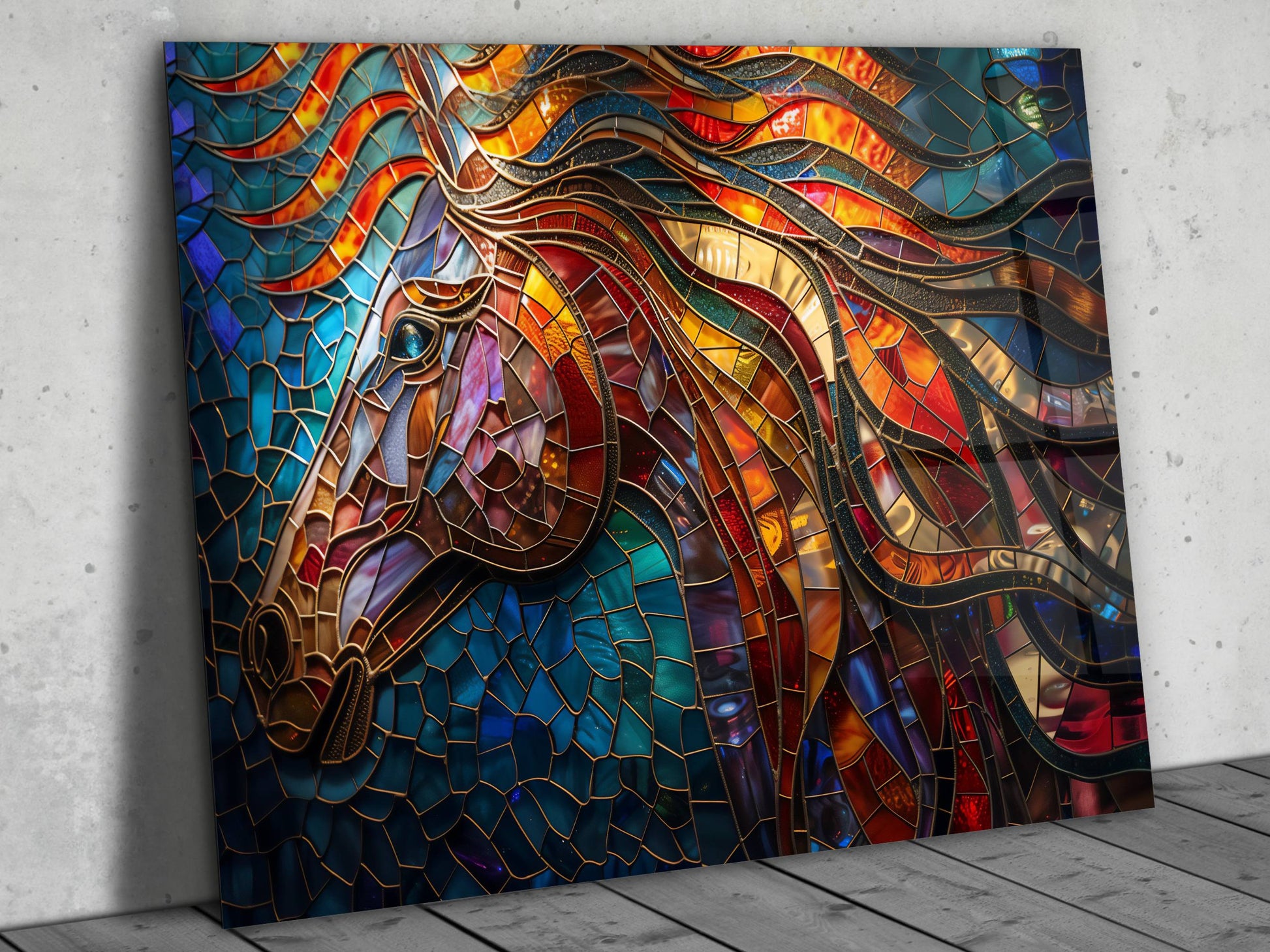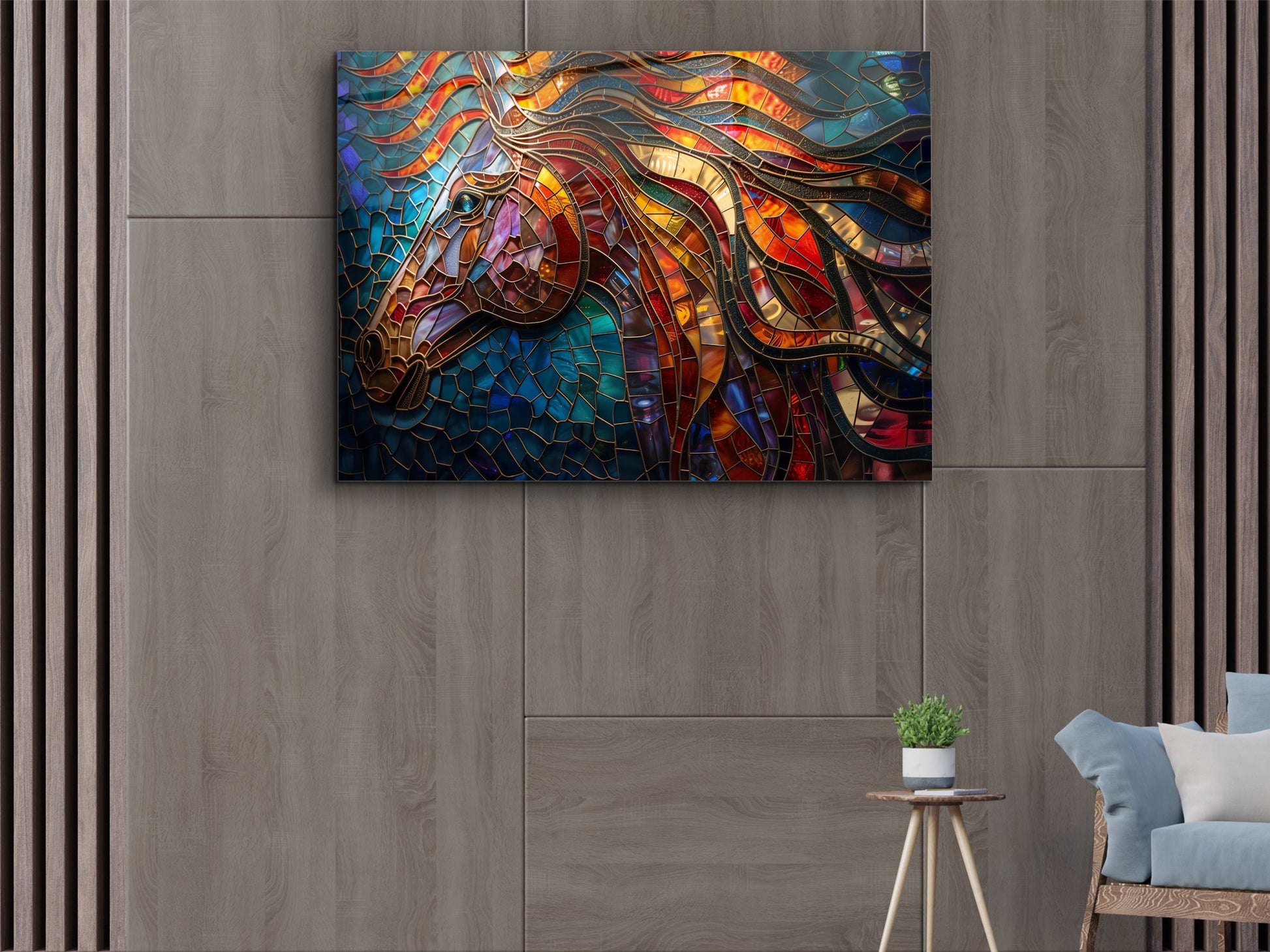 Renkli At Desen Vitray Tablo - Soyut Cam Tablo - Duvar Tablosu