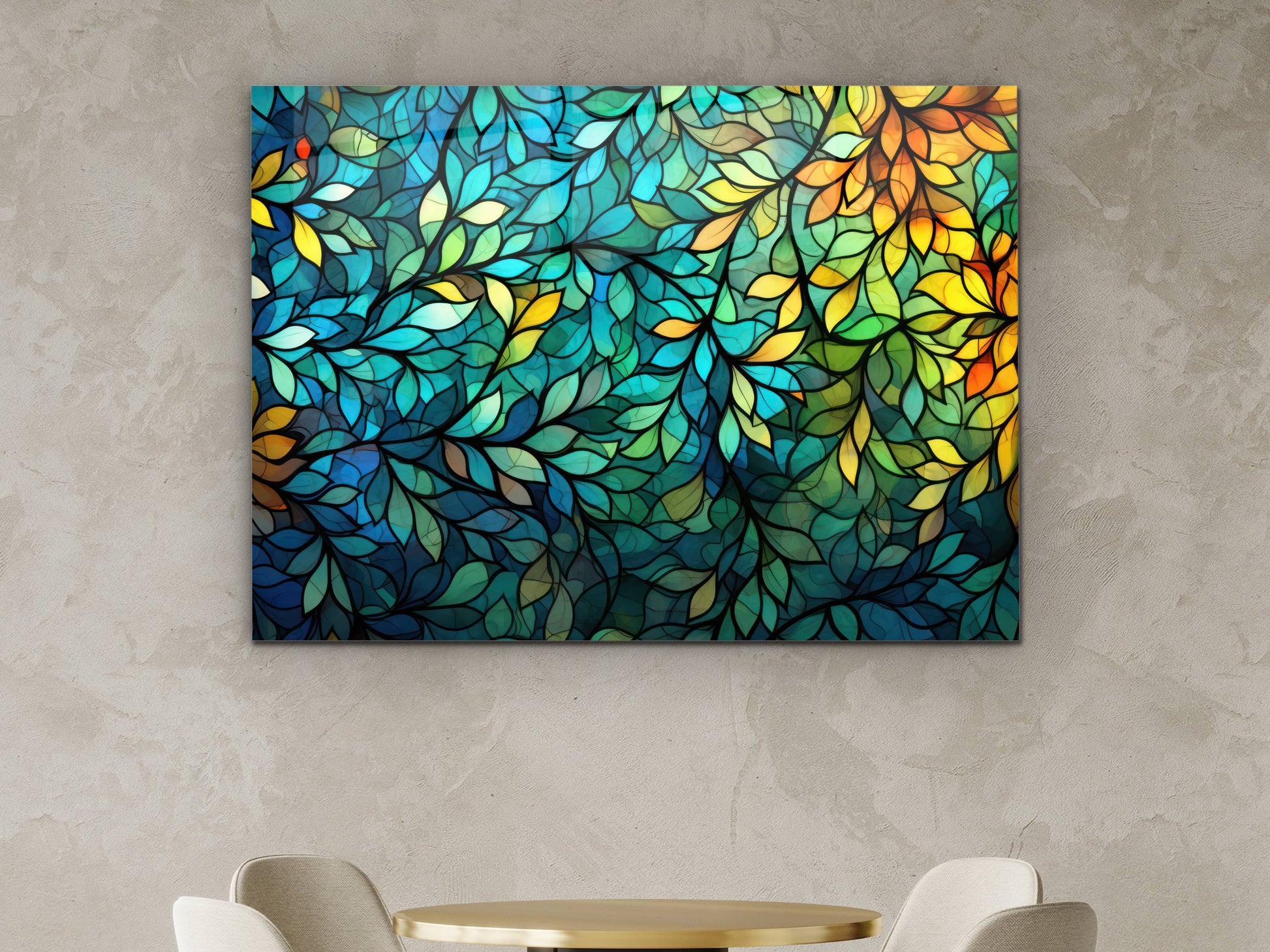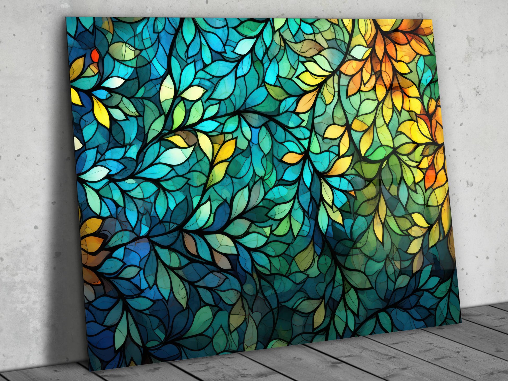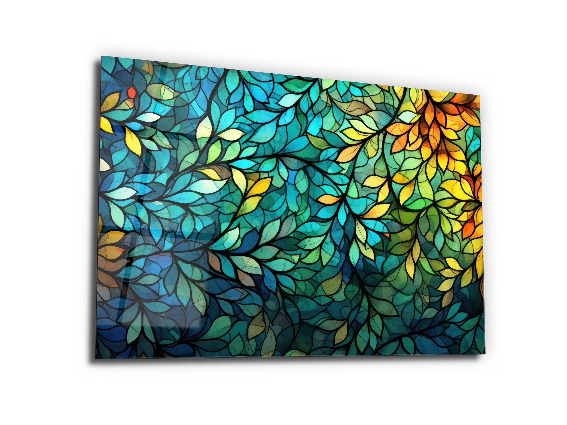 Renkli Cam Tablo - Cam Duvar Dekoru - Yaprak Desen Duvar Tablosu