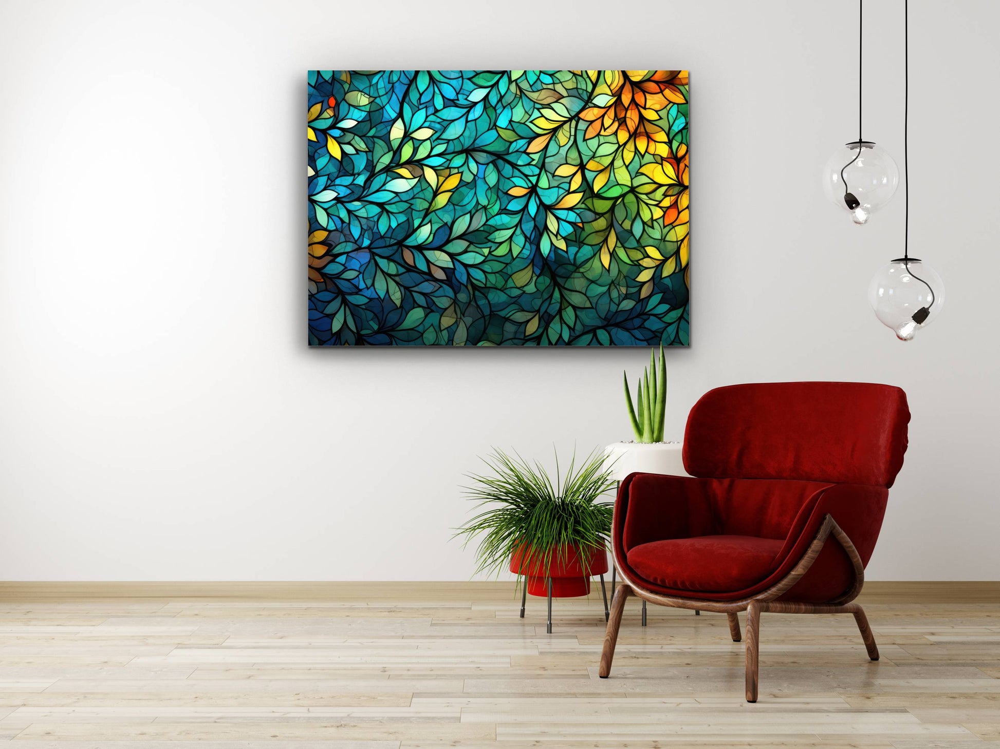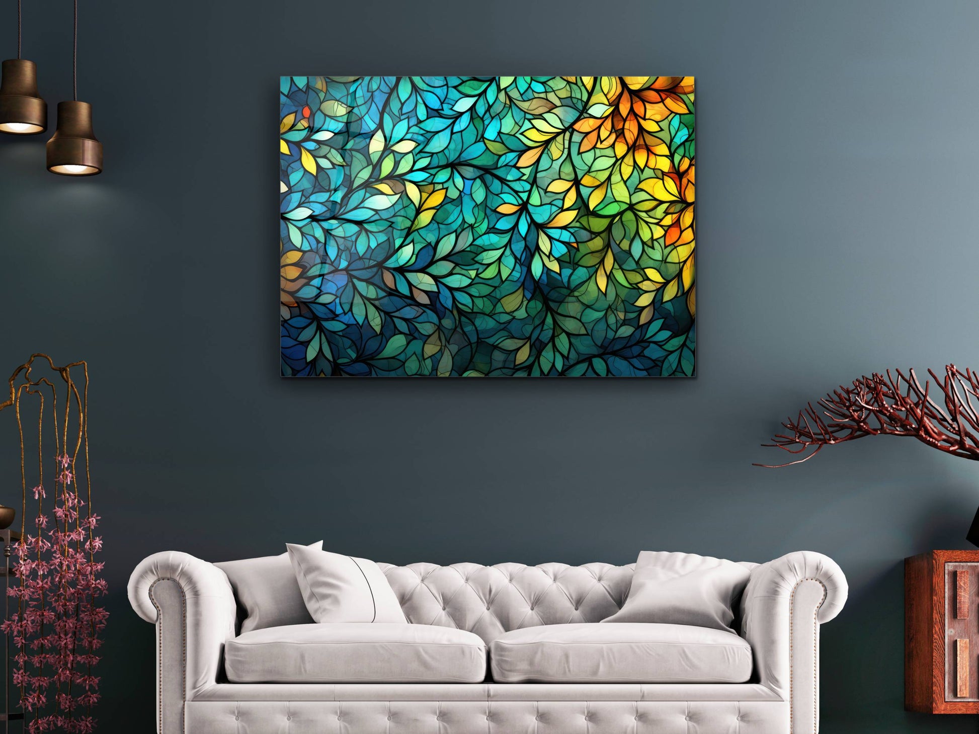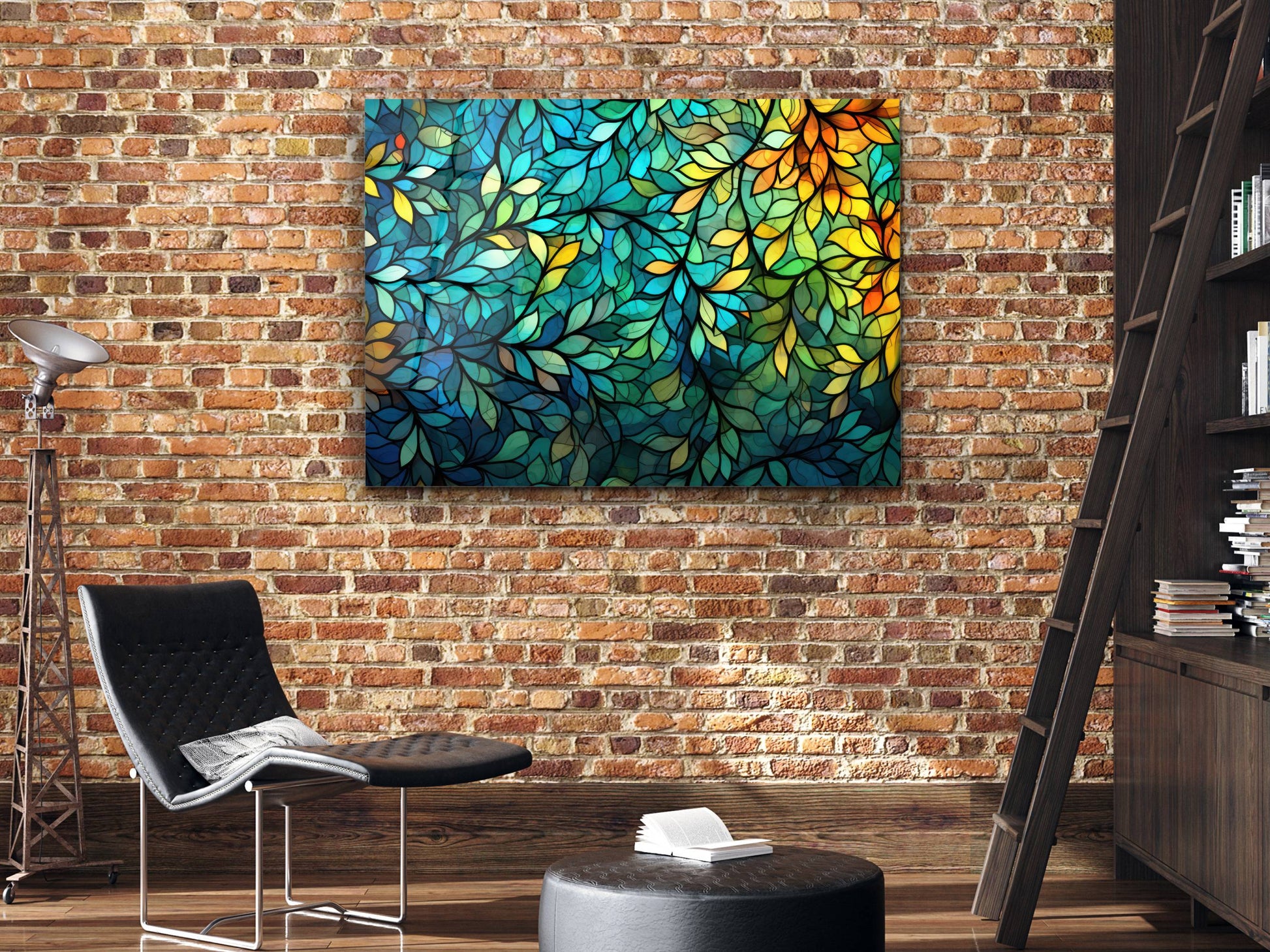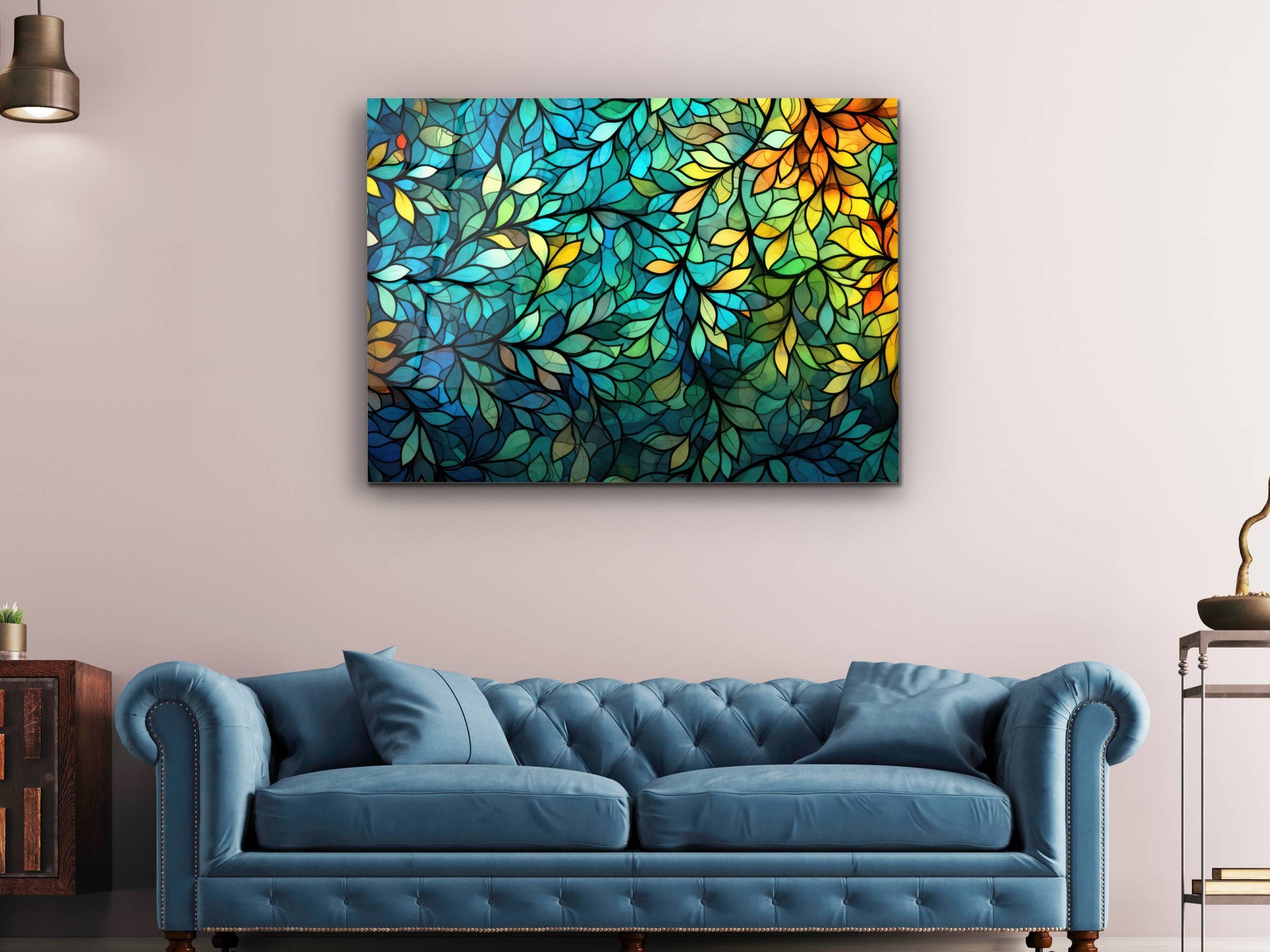 Renkli Cam Tablo - Cam Duvar Dekoru - Yaprak Desen Duvar Tablosu