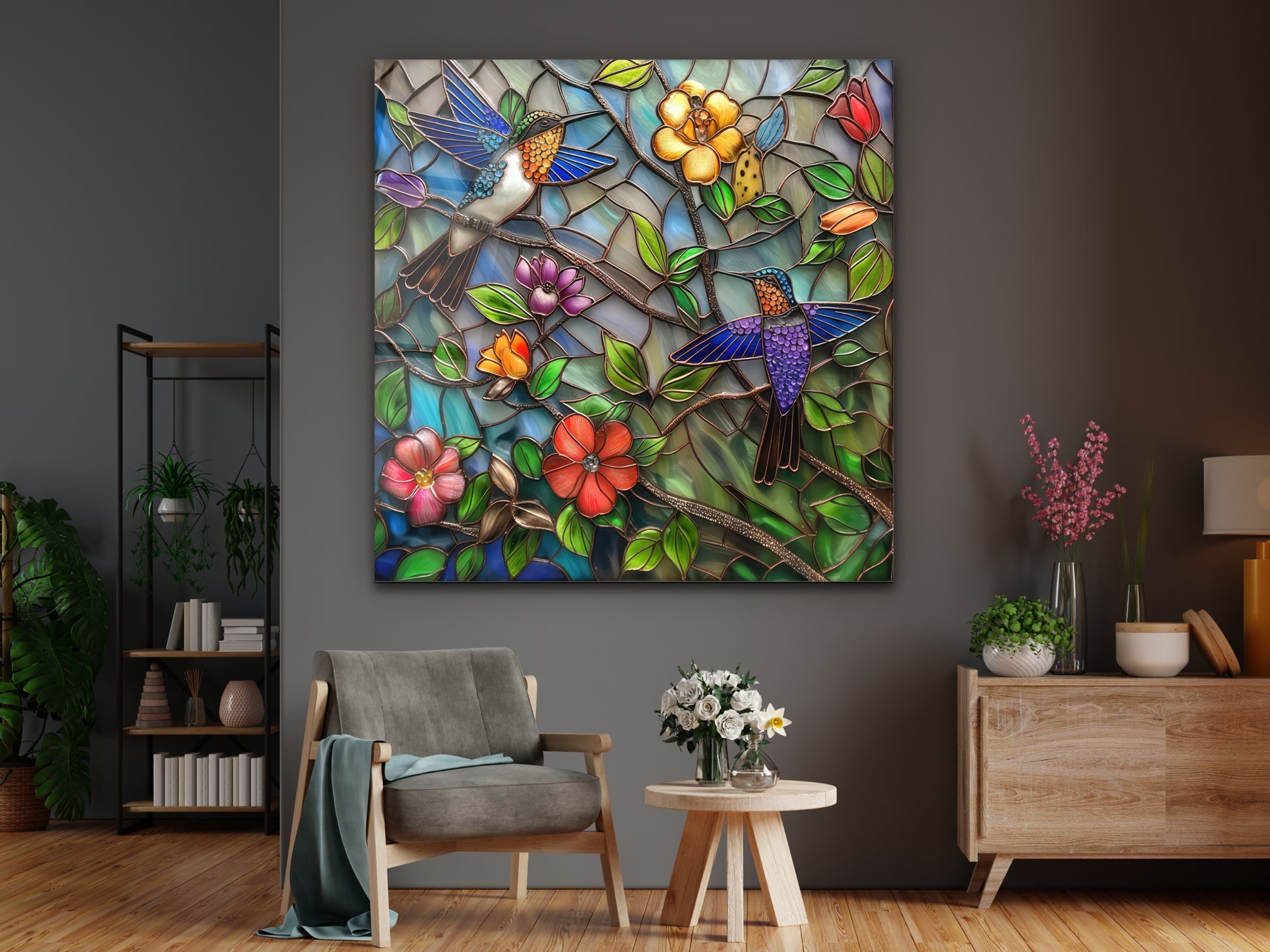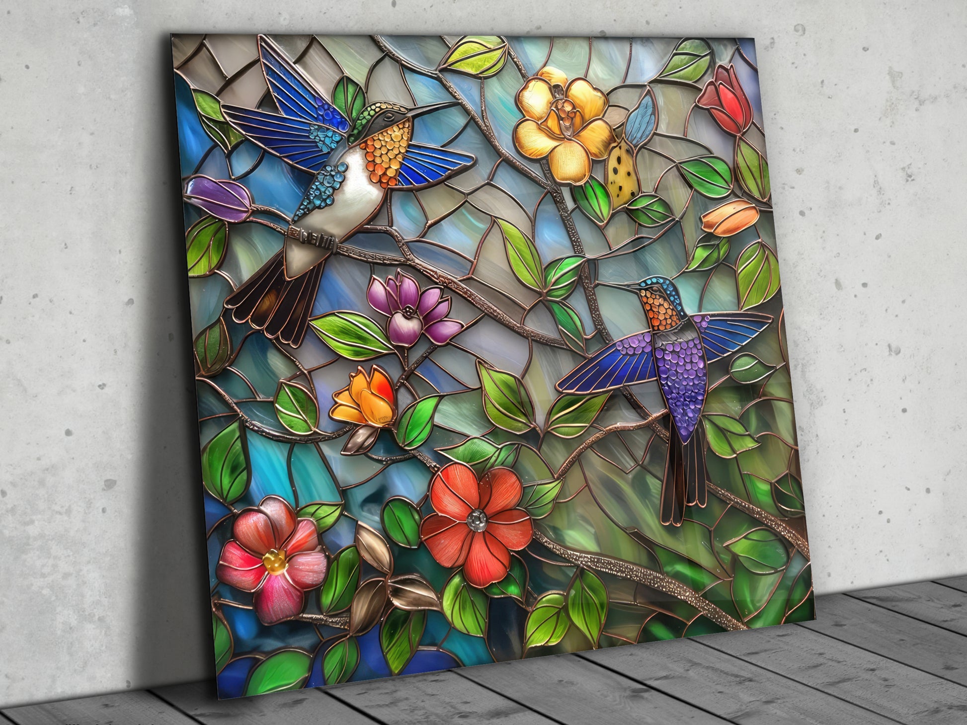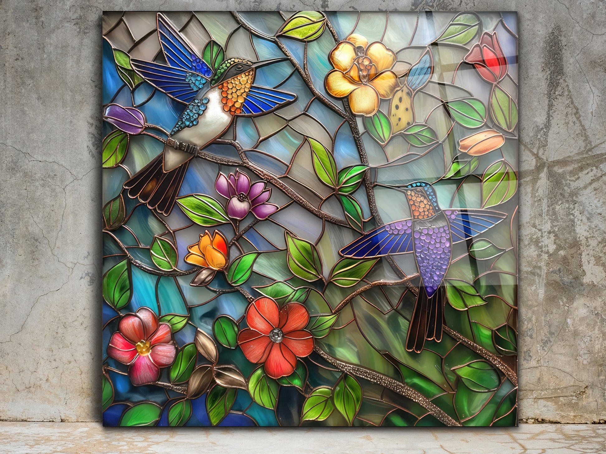 Renkli Kuş ve Çiçek Desenli Vitray Cam Tablo – Doğa Temalı Dekoratif Duvar Tablosu