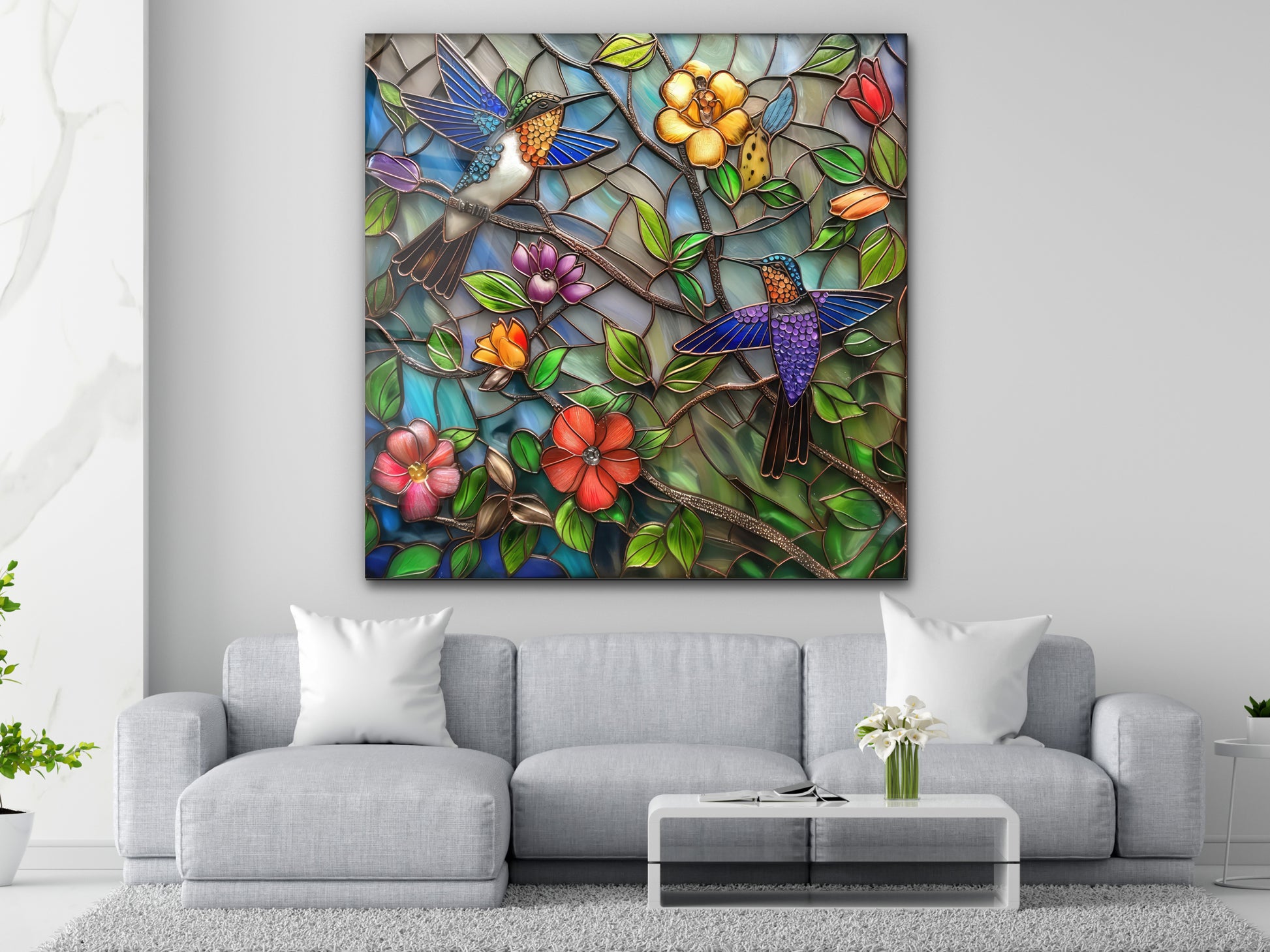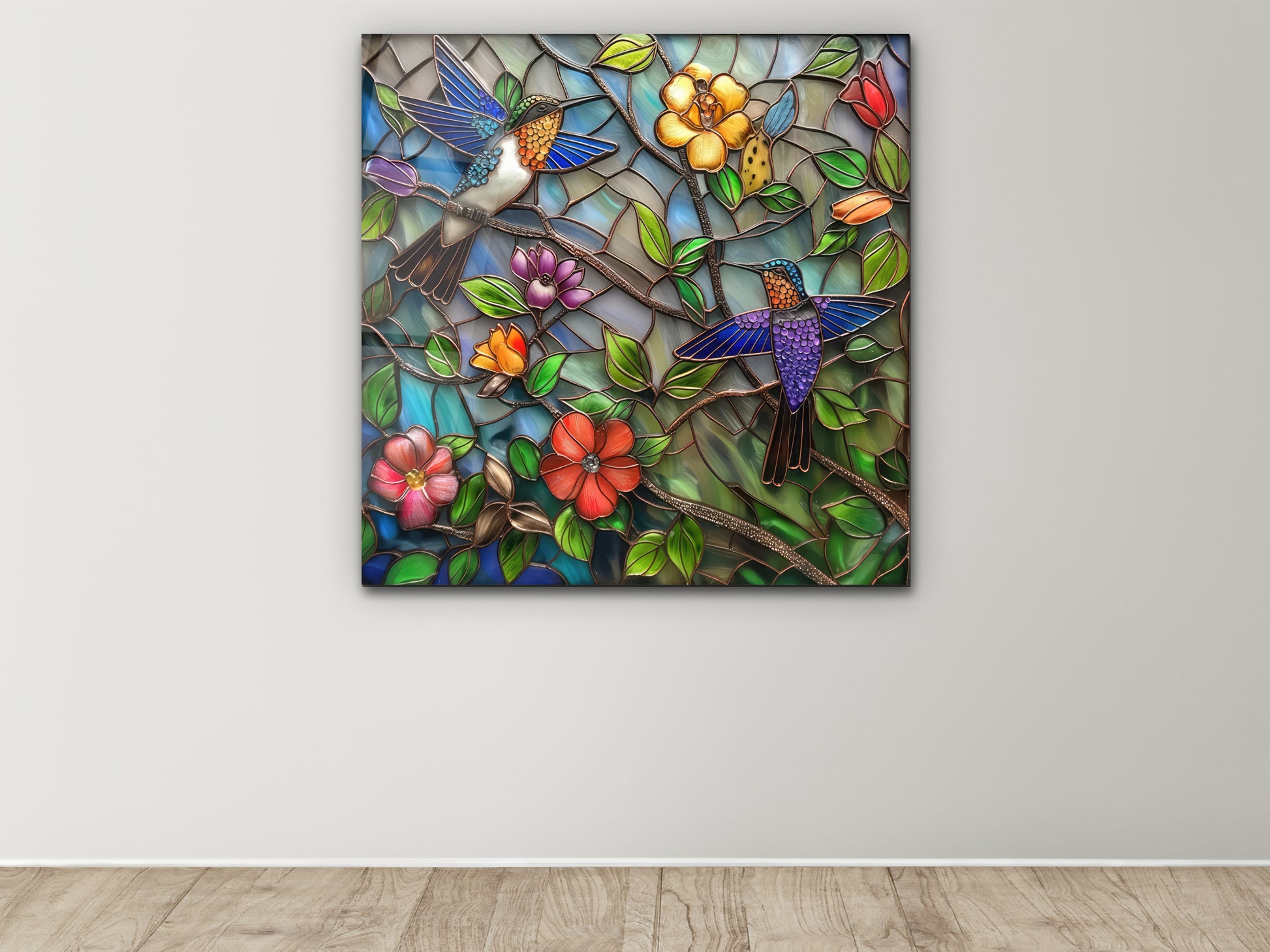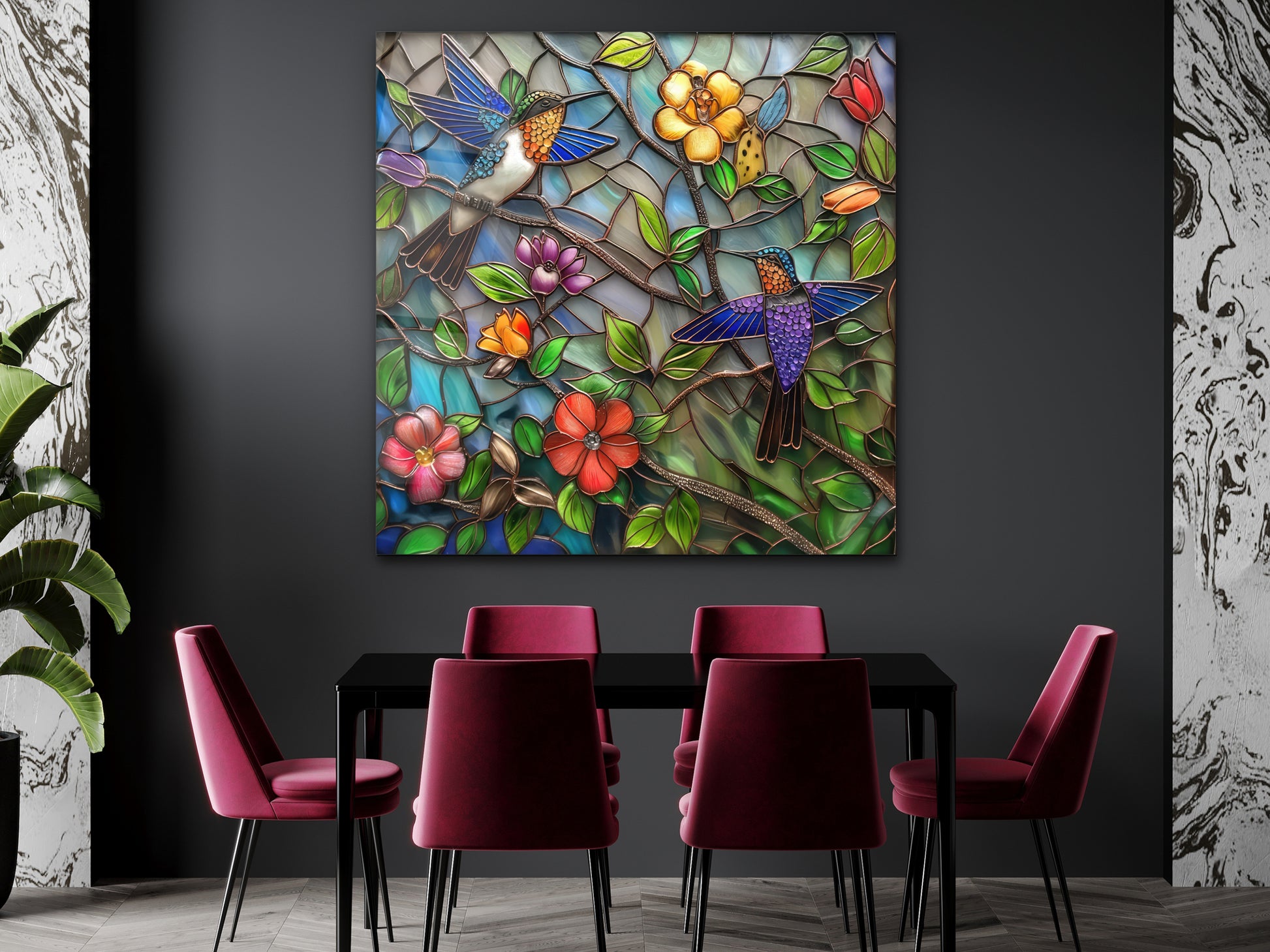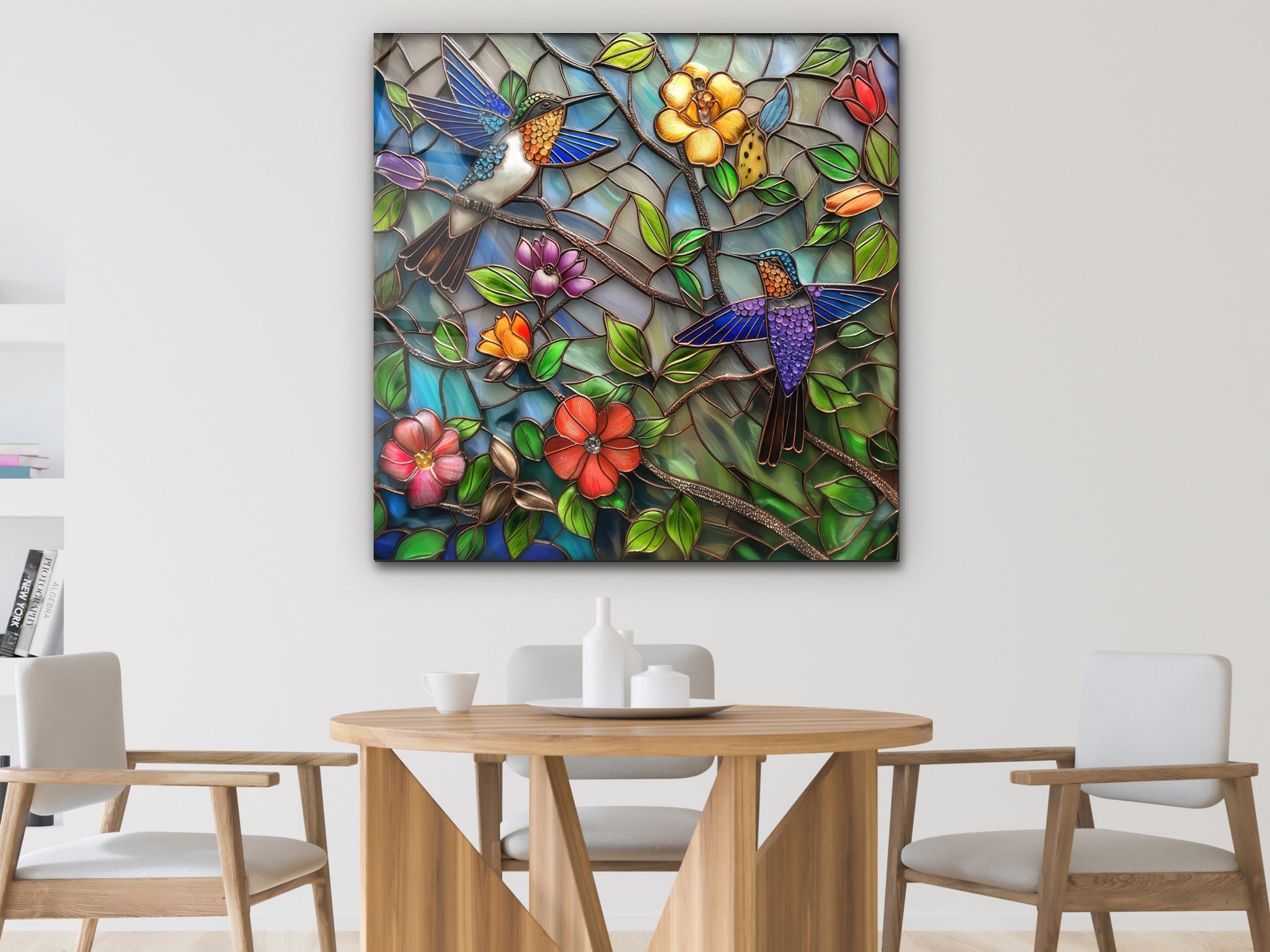 Renkli Kuş ve Çiçek Desenli Vitray Cam Tablo – Doğa Temalı Dekoratif Duvar Tablosu