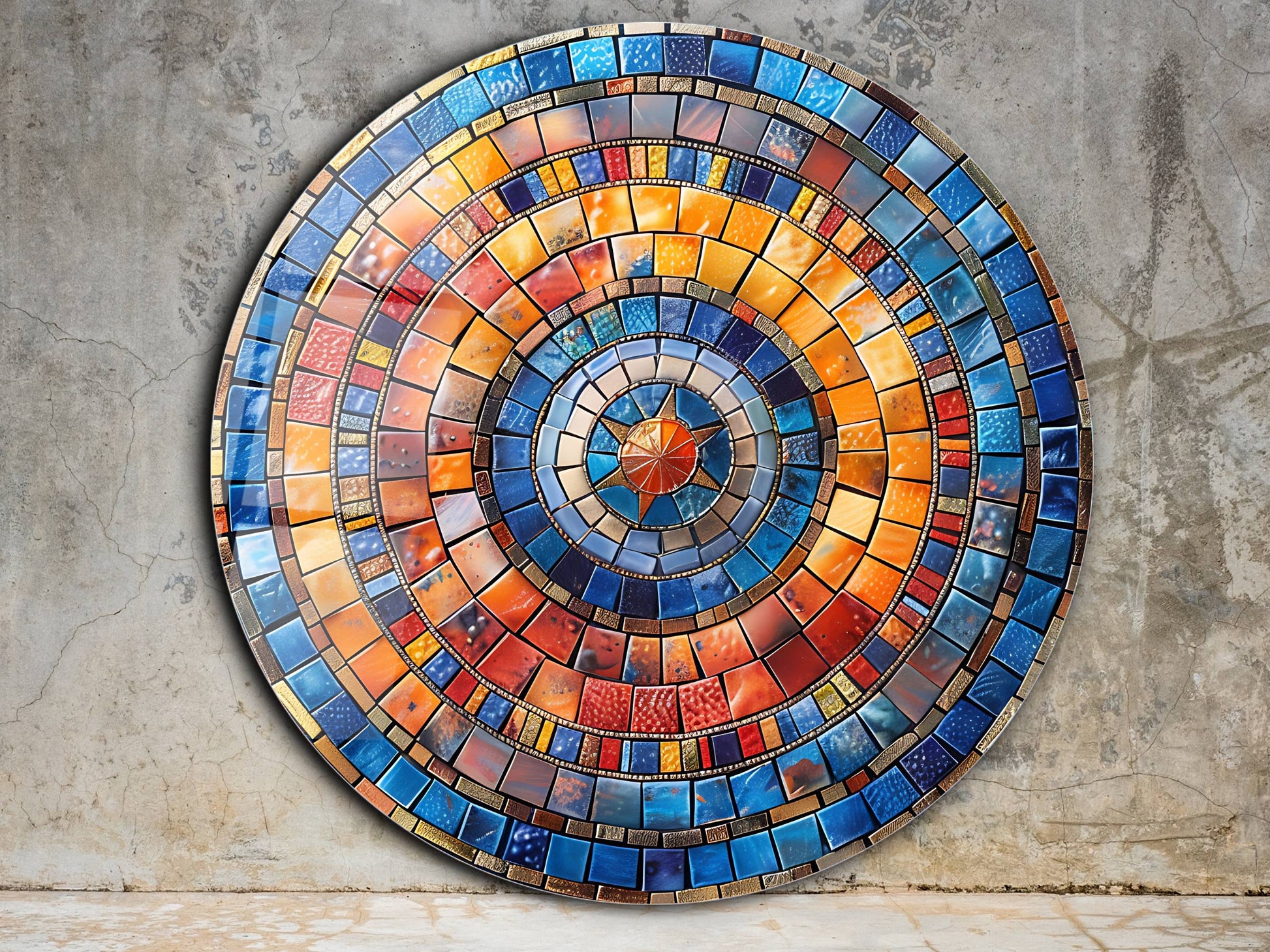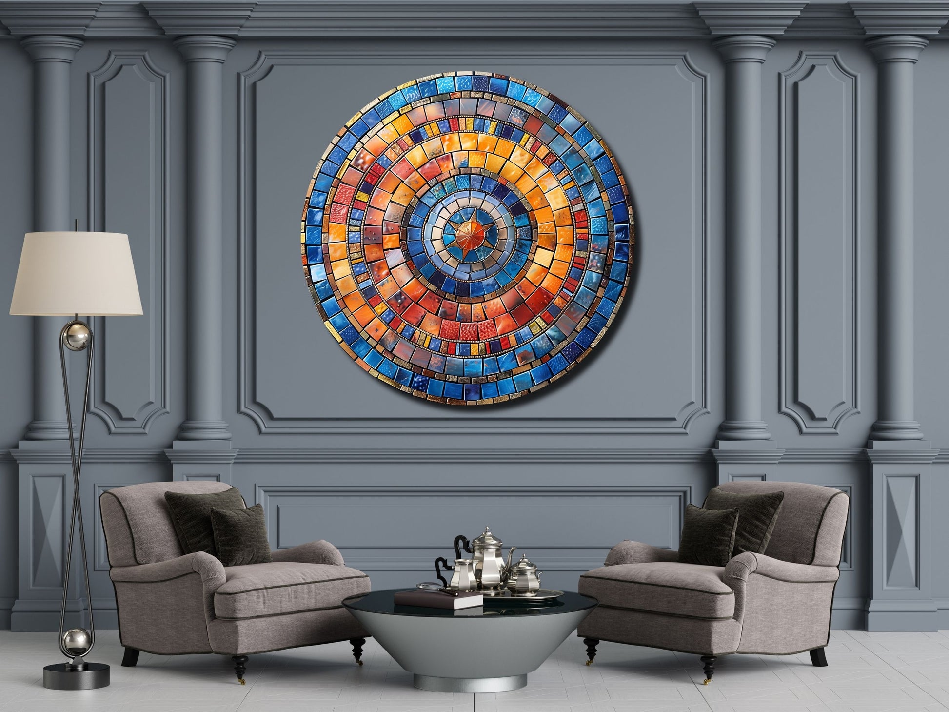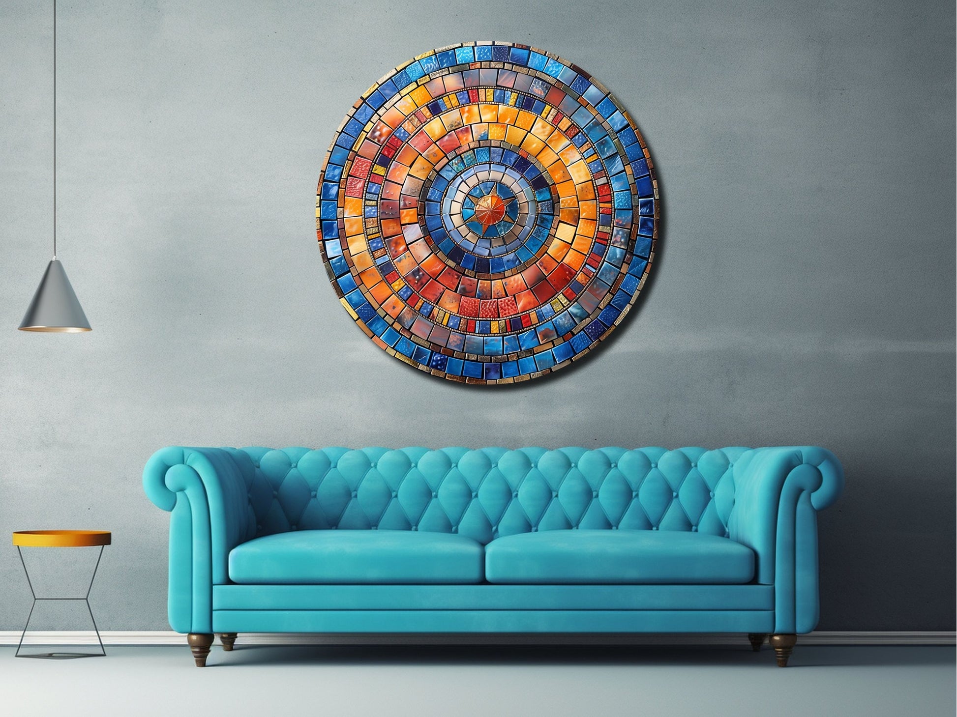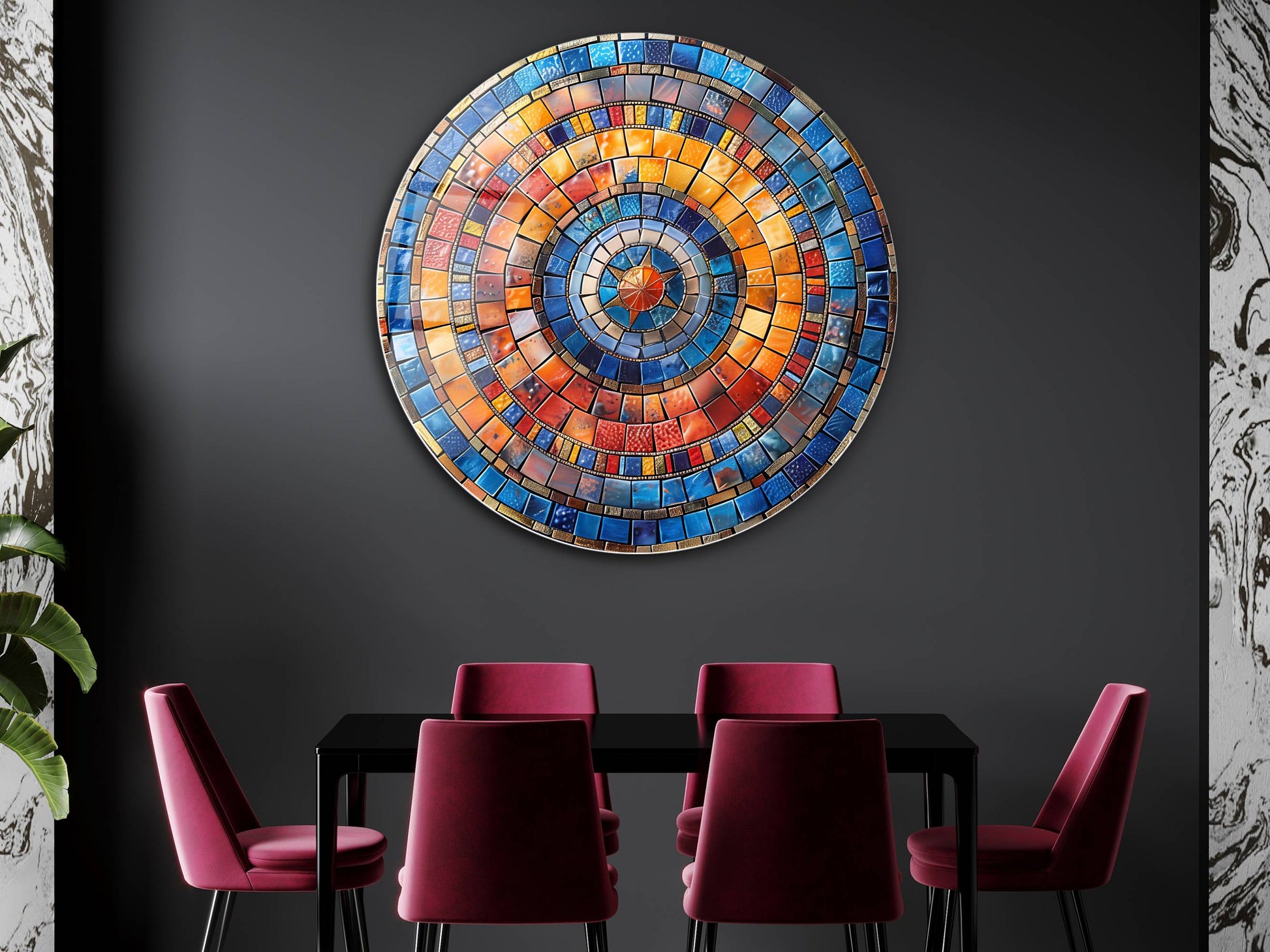 Renkli Mozaik Desenli Yuvarlak Cam Tablo - Modern Ev ve Ofis Dekoru