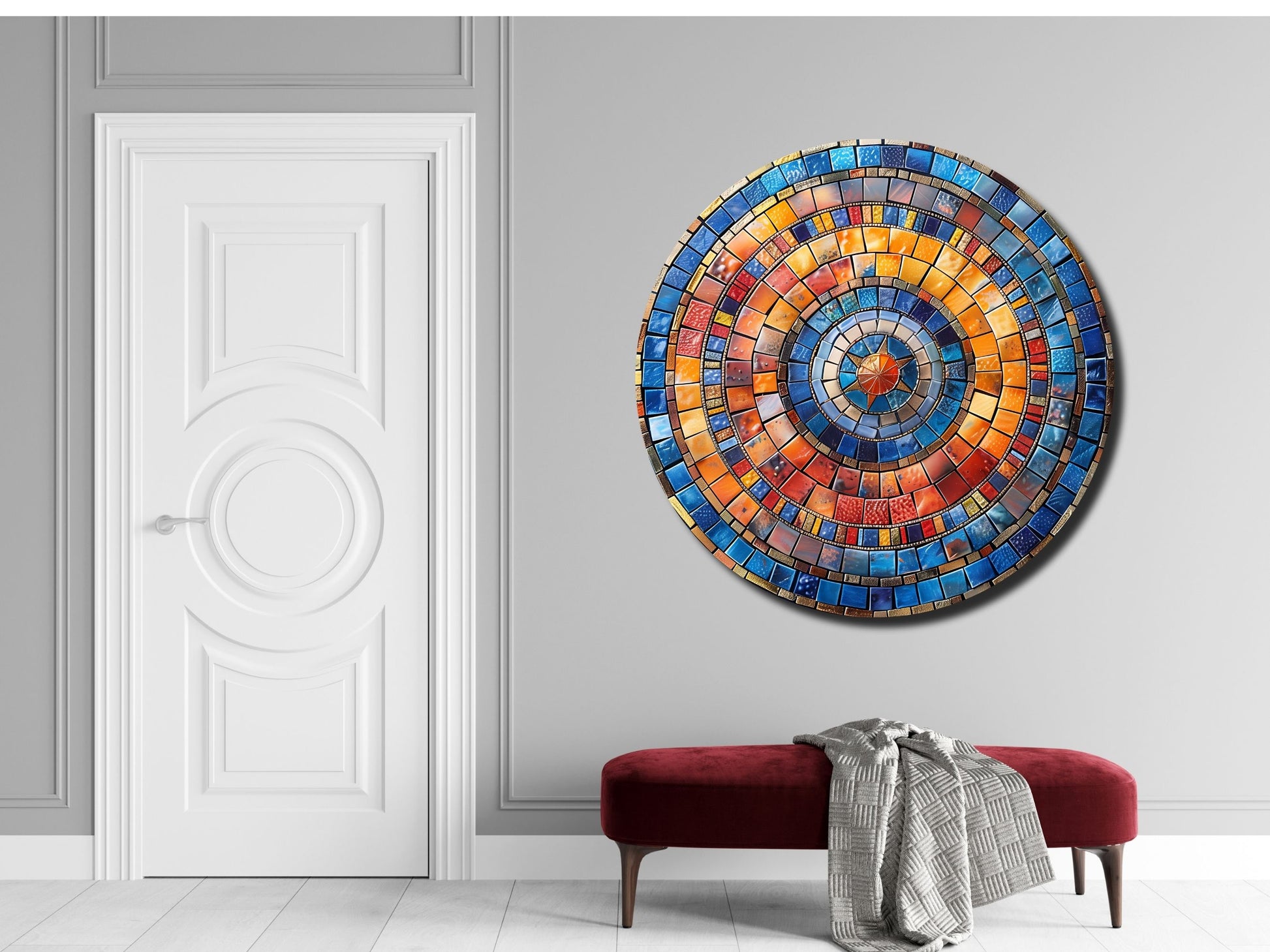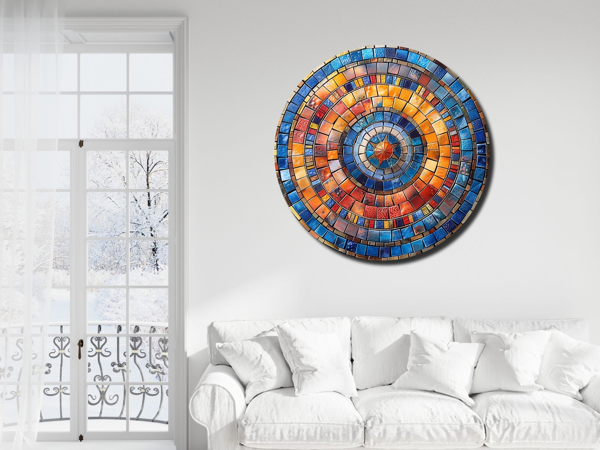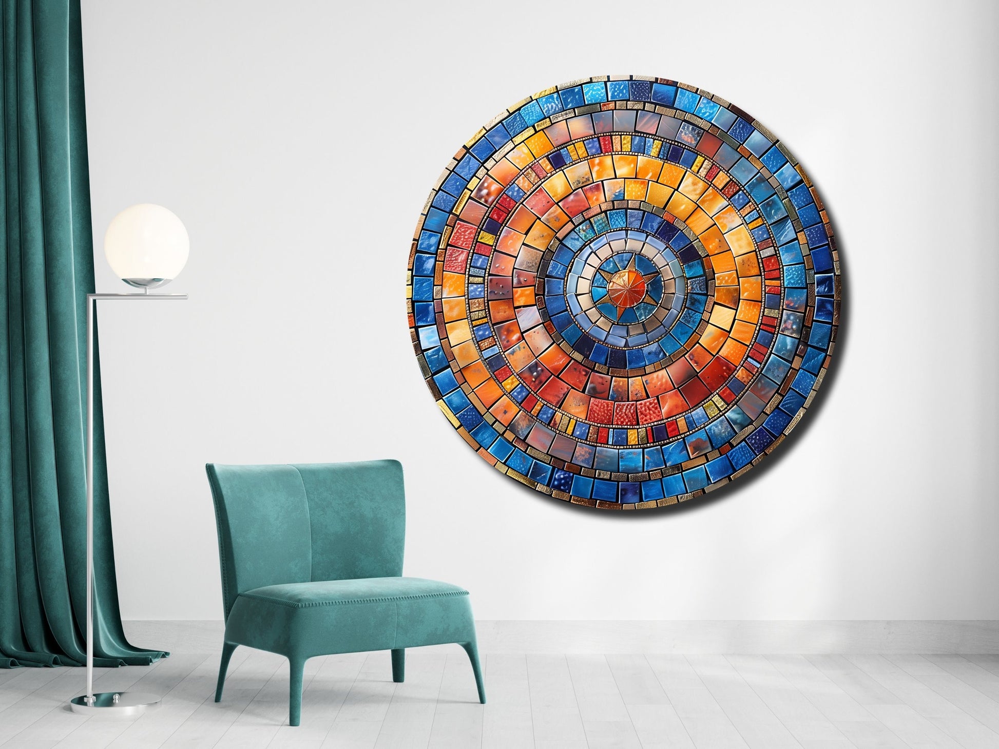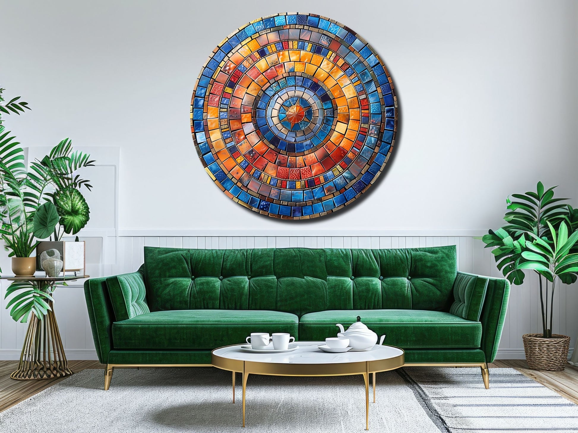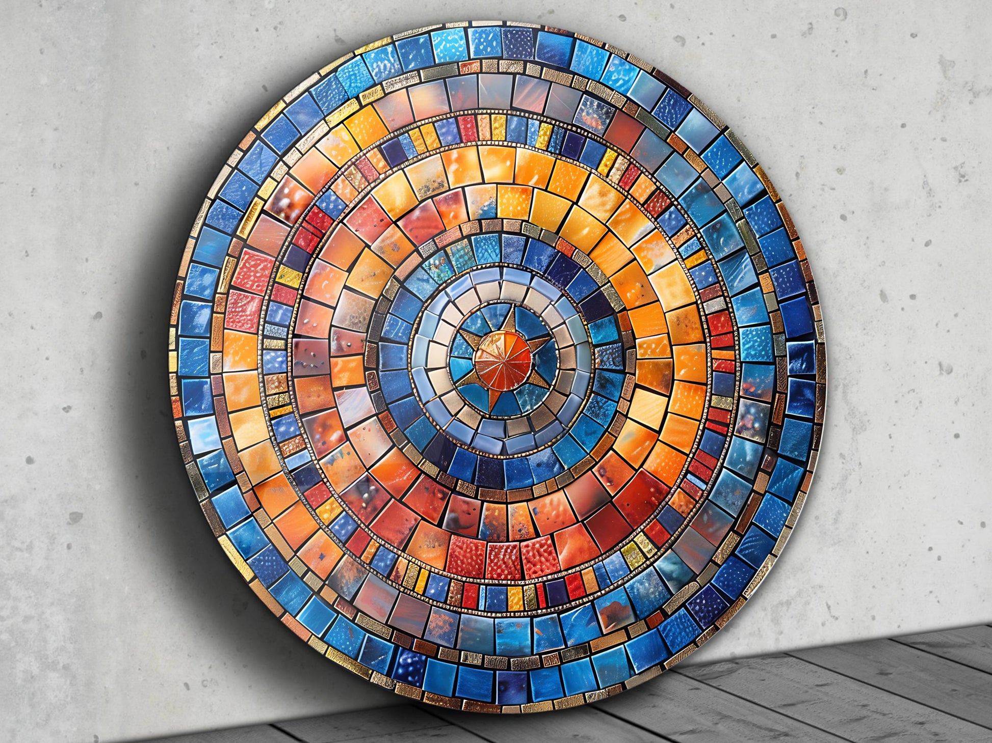 Renkli Mozaik Desenli Yuvarlak Cam Tablo - Modern Ev ve Ofis Dekoru