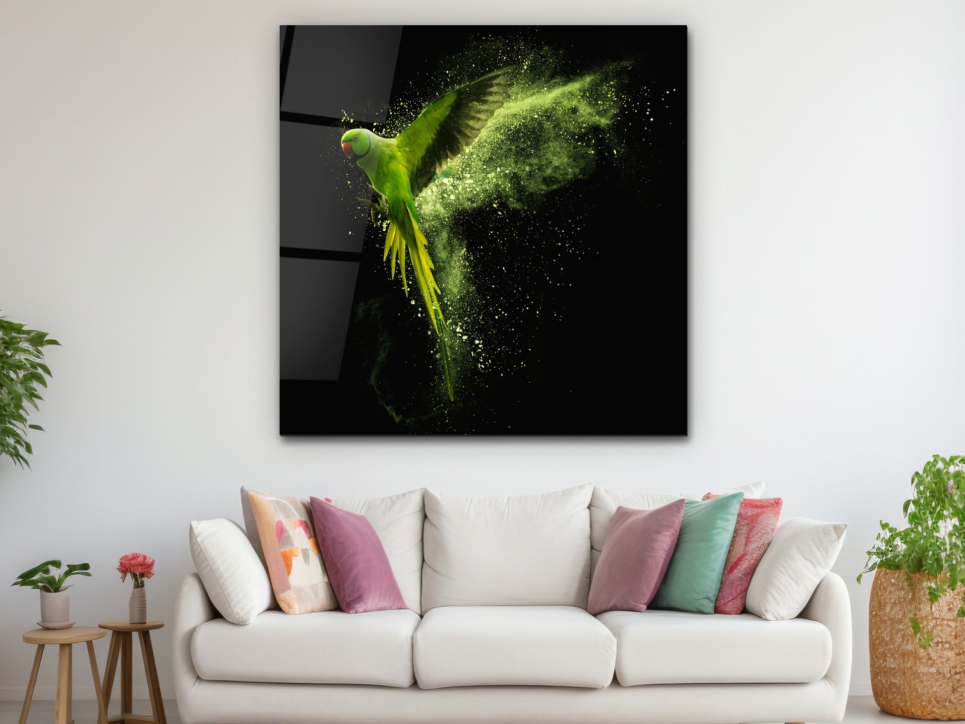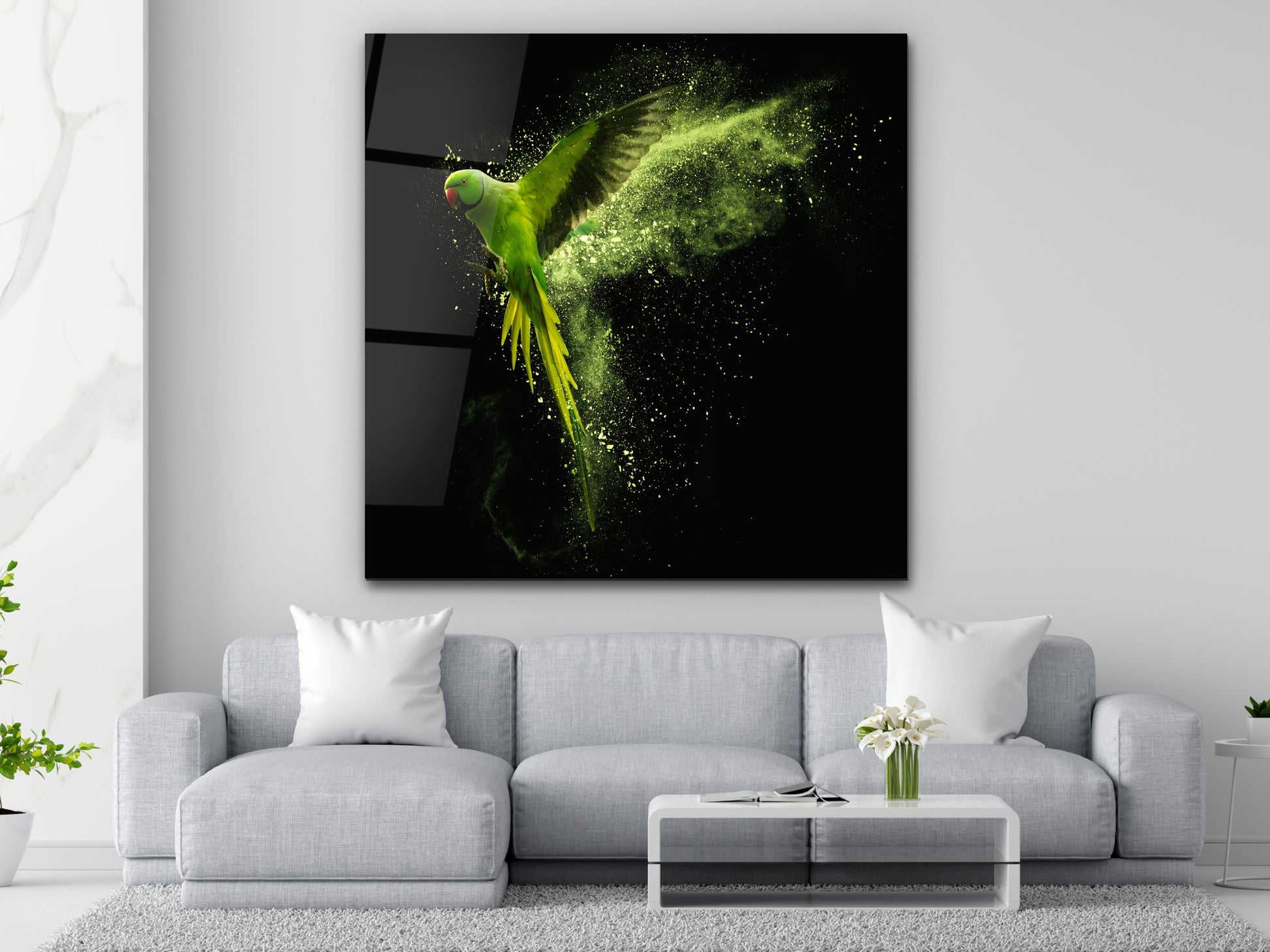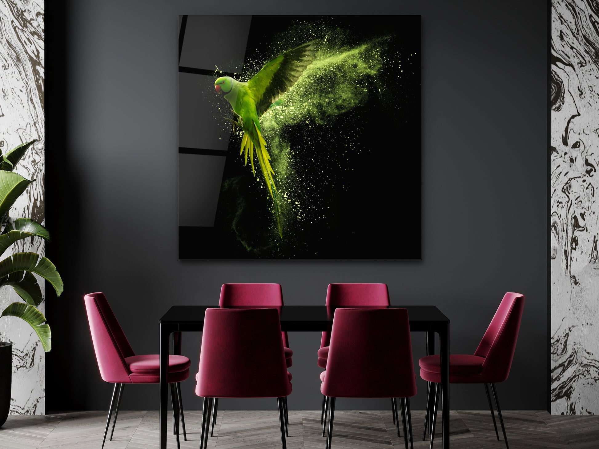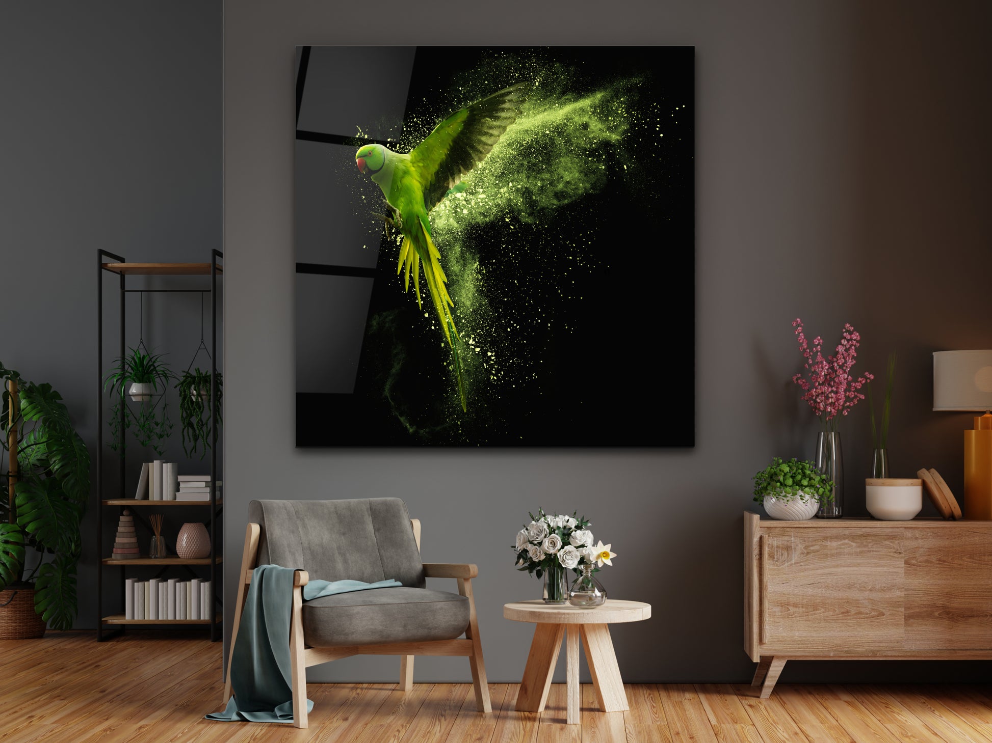 Yeşil Papağan Soyut Cam Tablo – Dekoratif Tablo - Modern Ev ve Ofis Dekoru