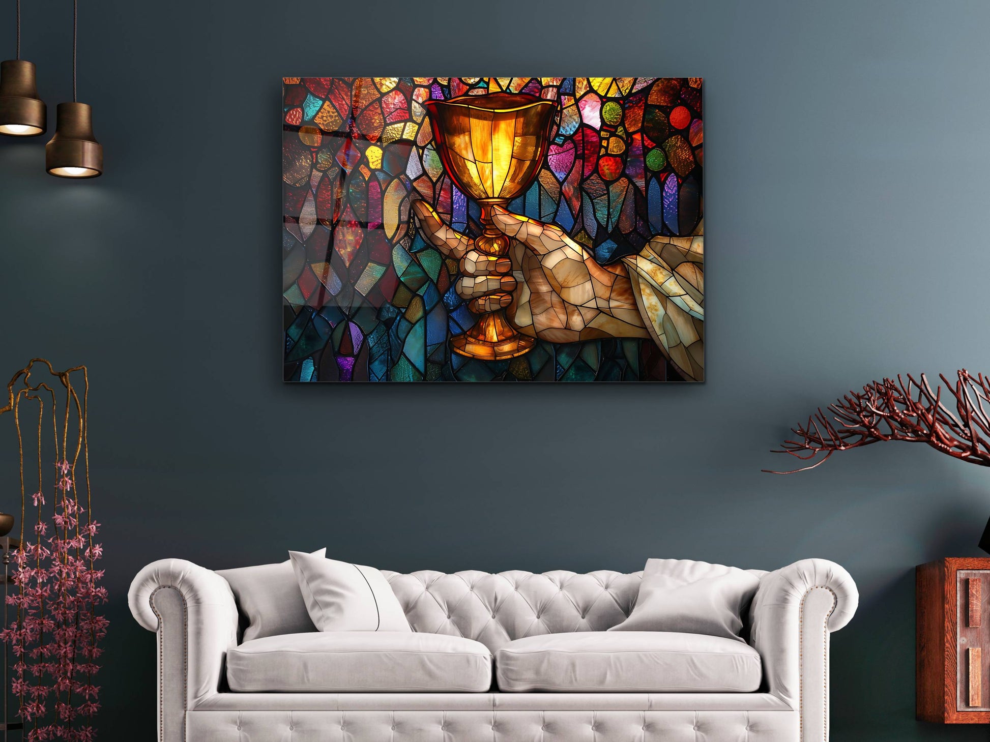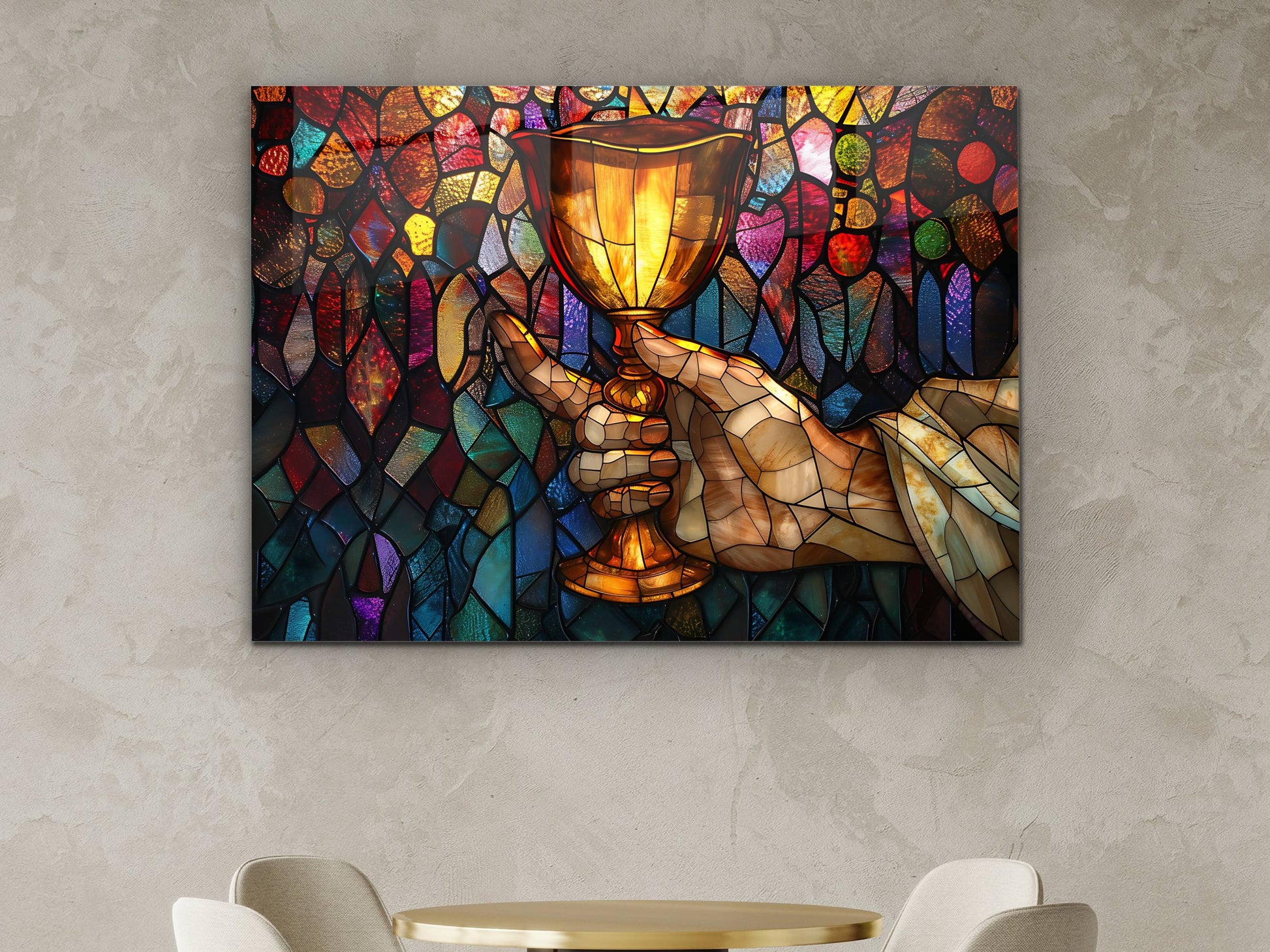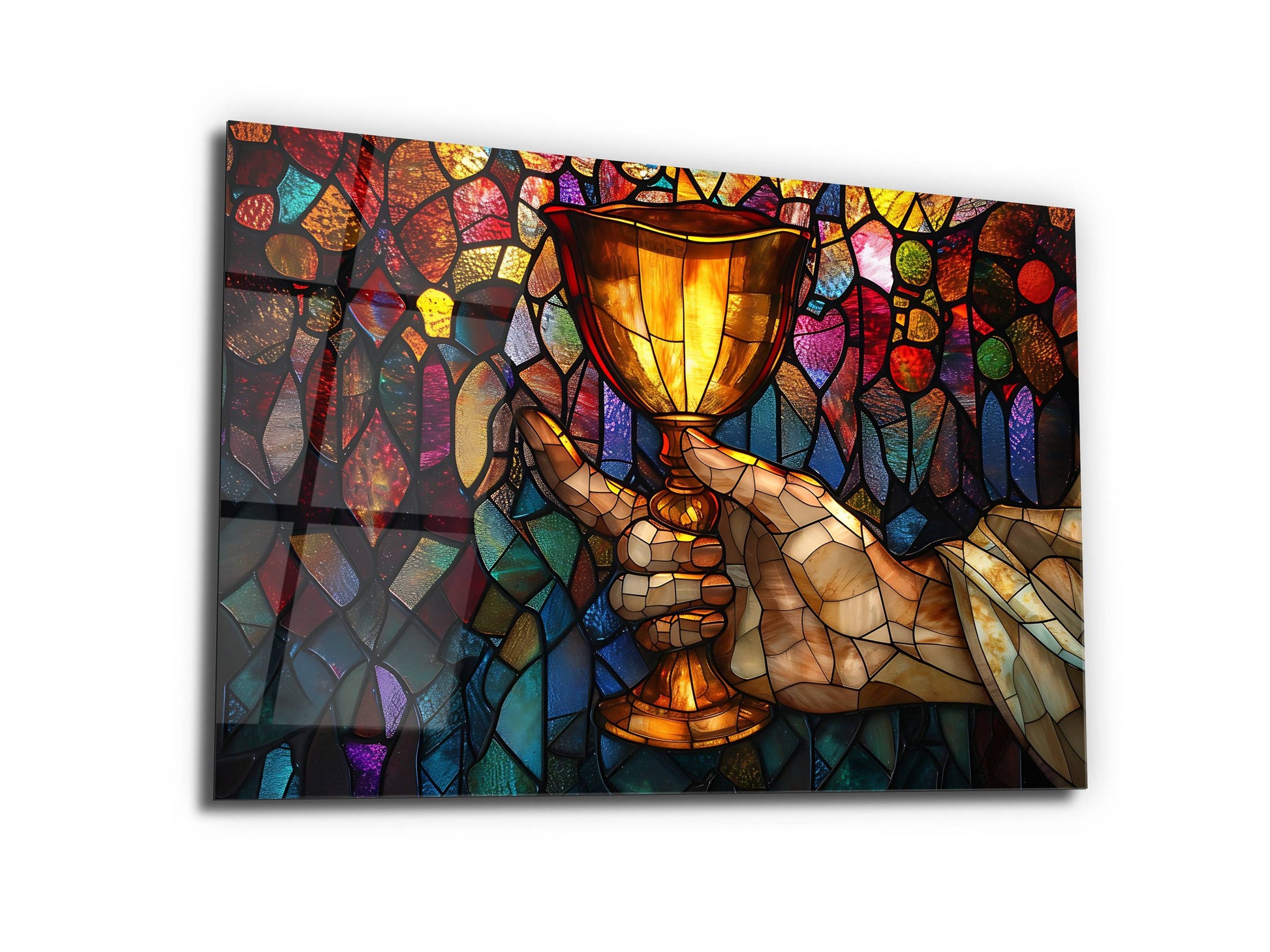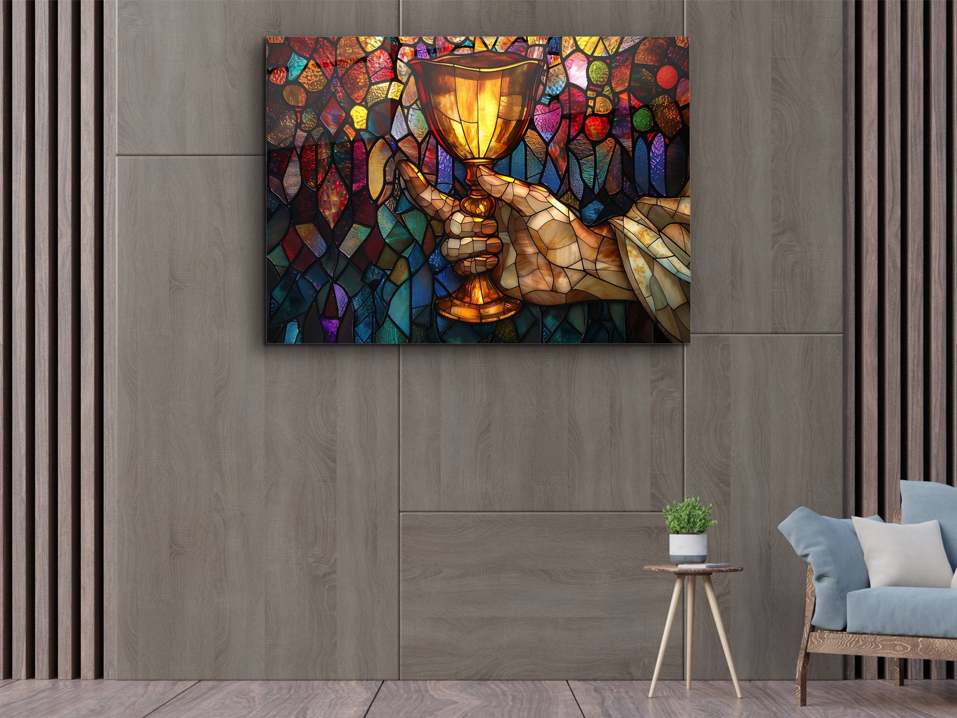 Renkli Vitray Cam Tablo - Altın Kadeh ve Renkli Mozaik Desen Tablo