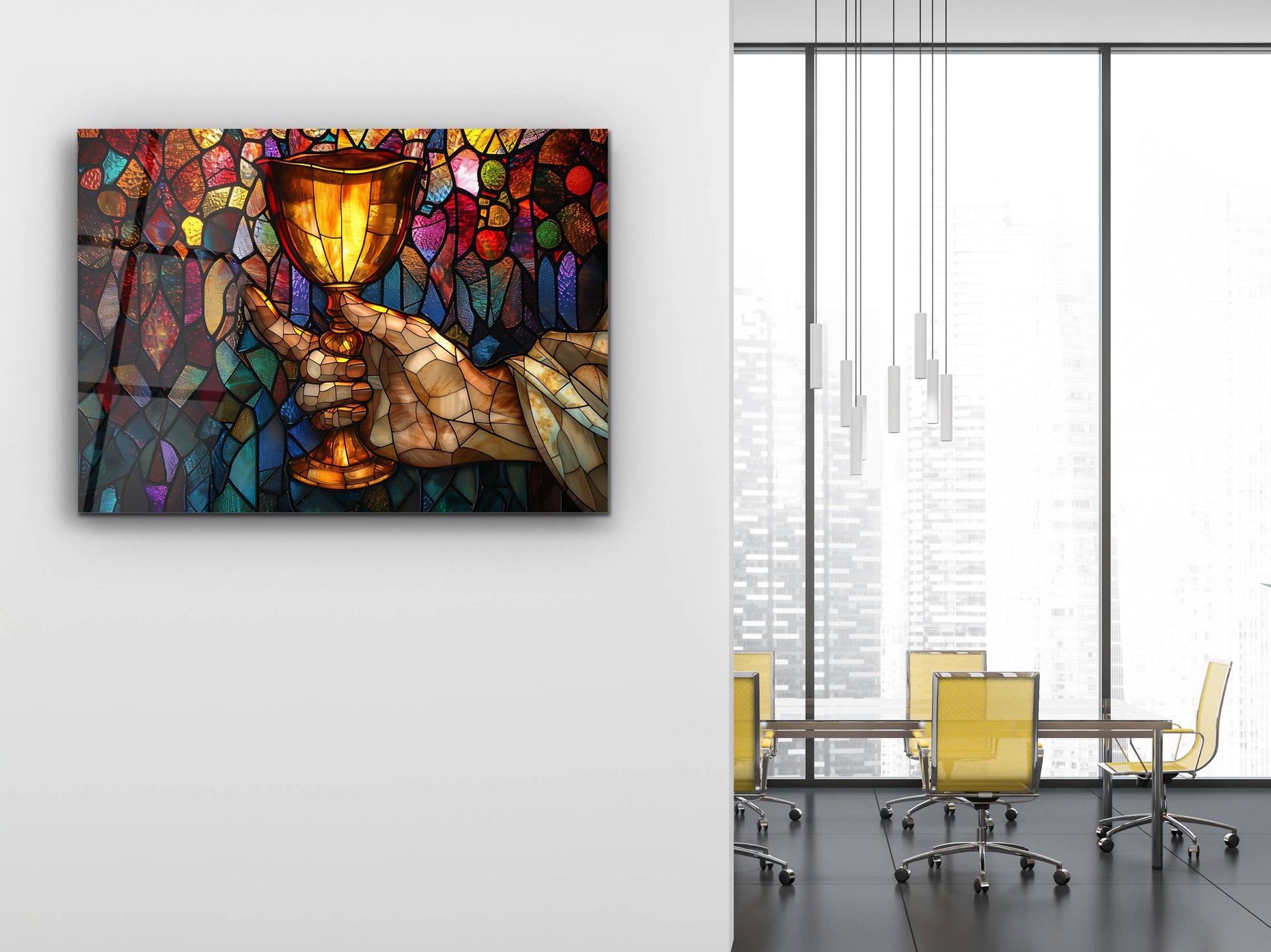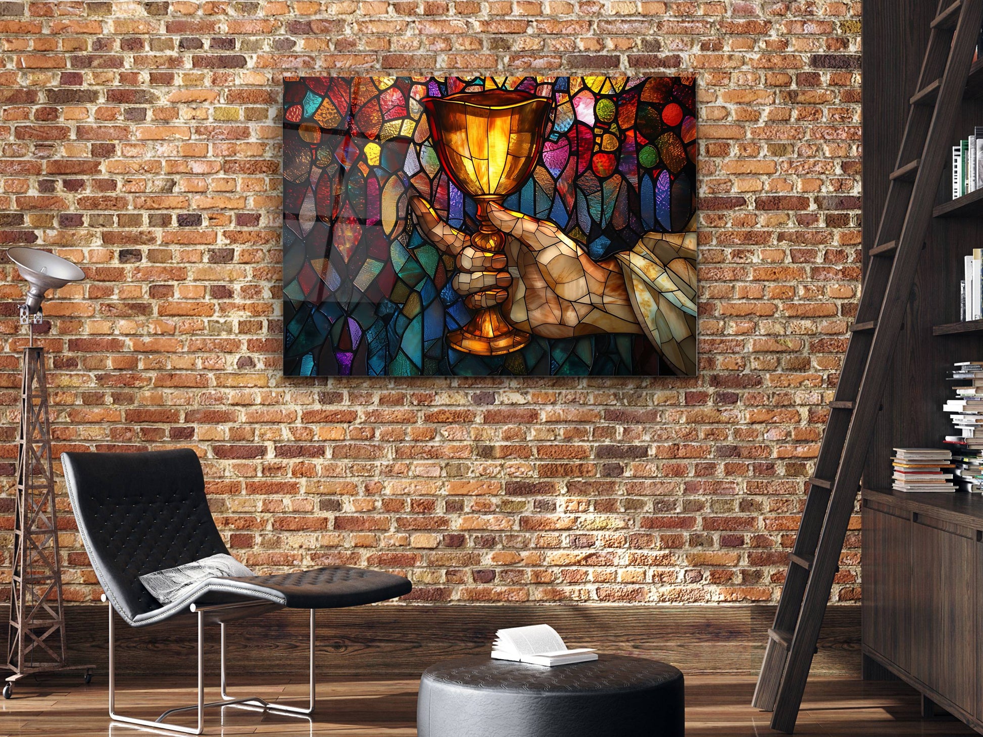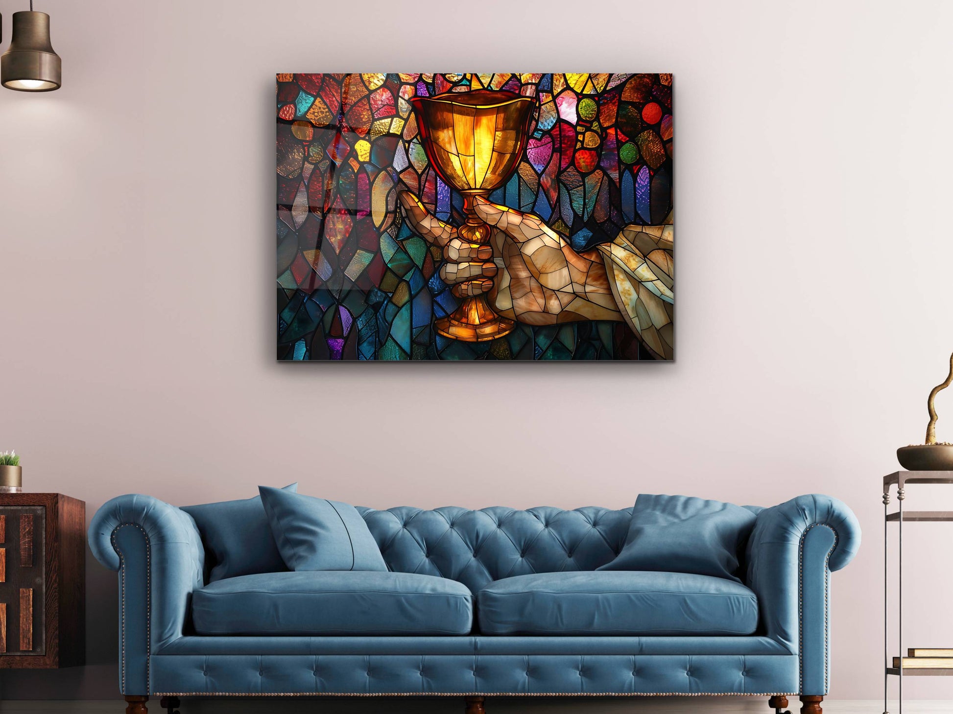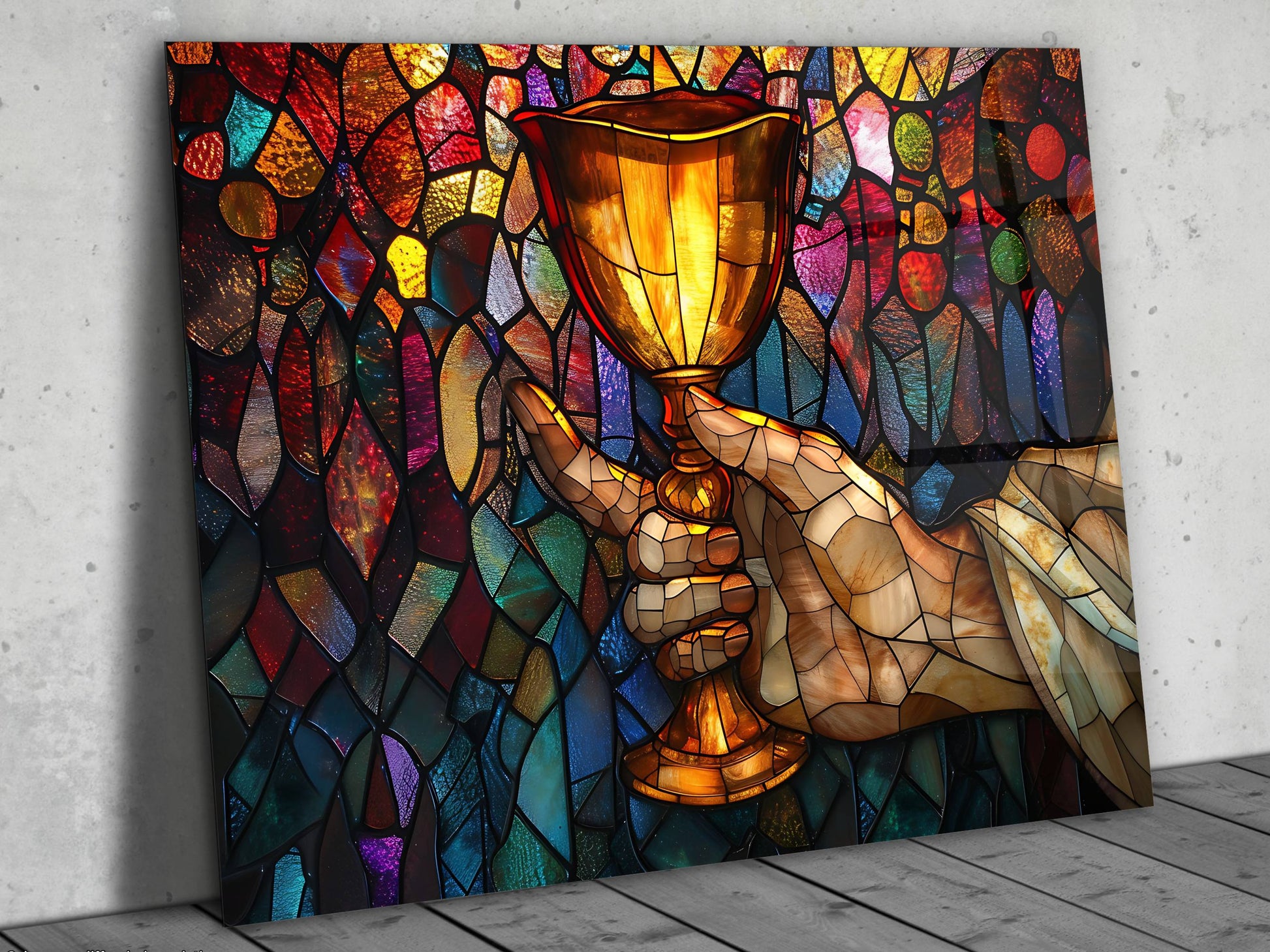 Renkli Vitray Cam Tablo - Altın Kadeh ve Renkli Mozaik Desen Tablo