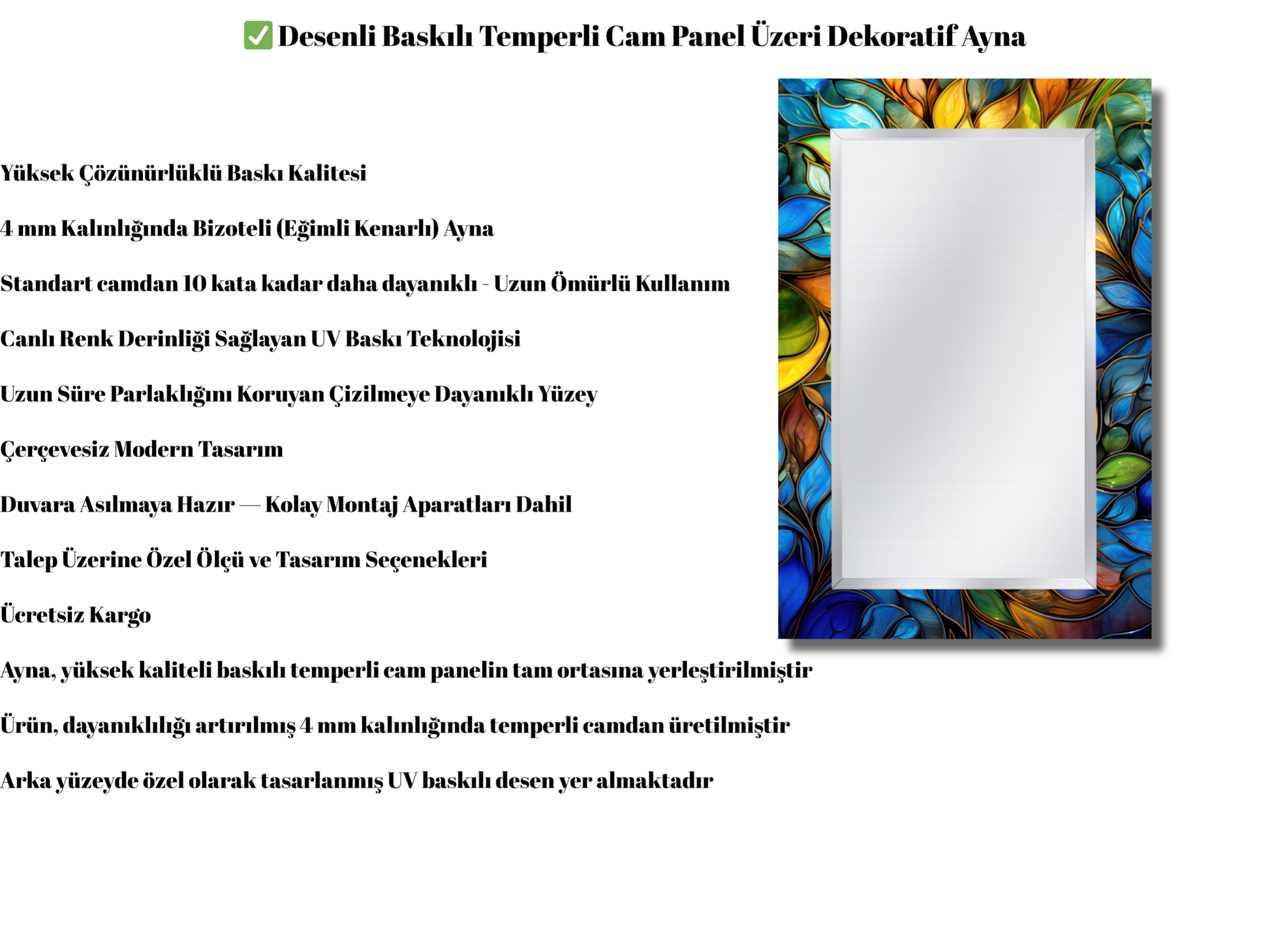 Ürünlerimiz, 4 mm kalınlığında temperli cam üzerine canlı UV baskılı desenlerle üretilir ve merkezinde yer alan 4 mm bizoteli ayna ile hem dayanıklılık hem de zarif bir estetik sunar.