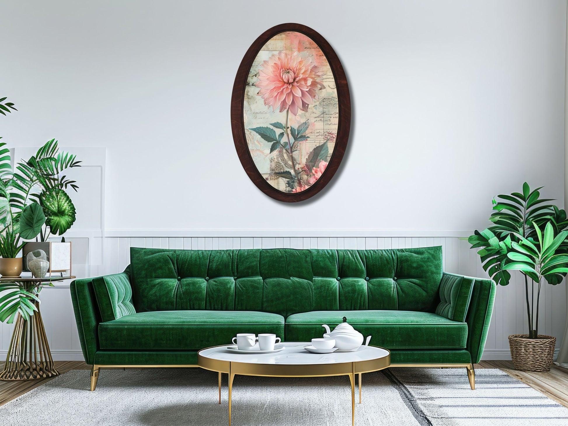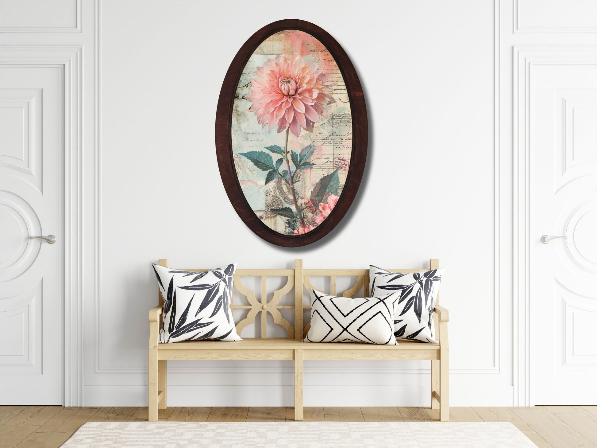 Retro Stil Çiçek Desenli Oval Ahşap Tablo – Klasik Oval Duvar Dekoru - Nostaljik Dekoratif Duvar Tablosu