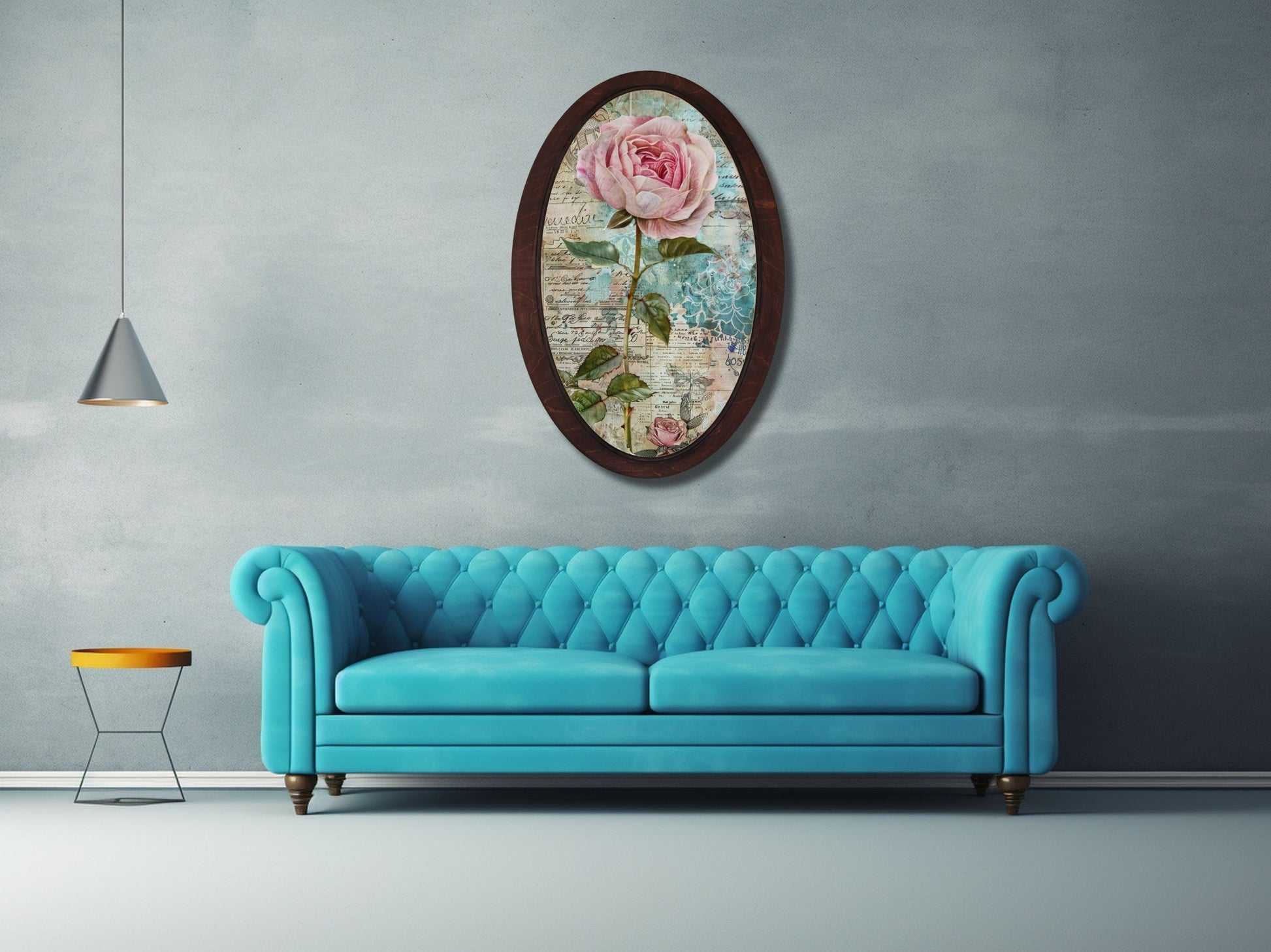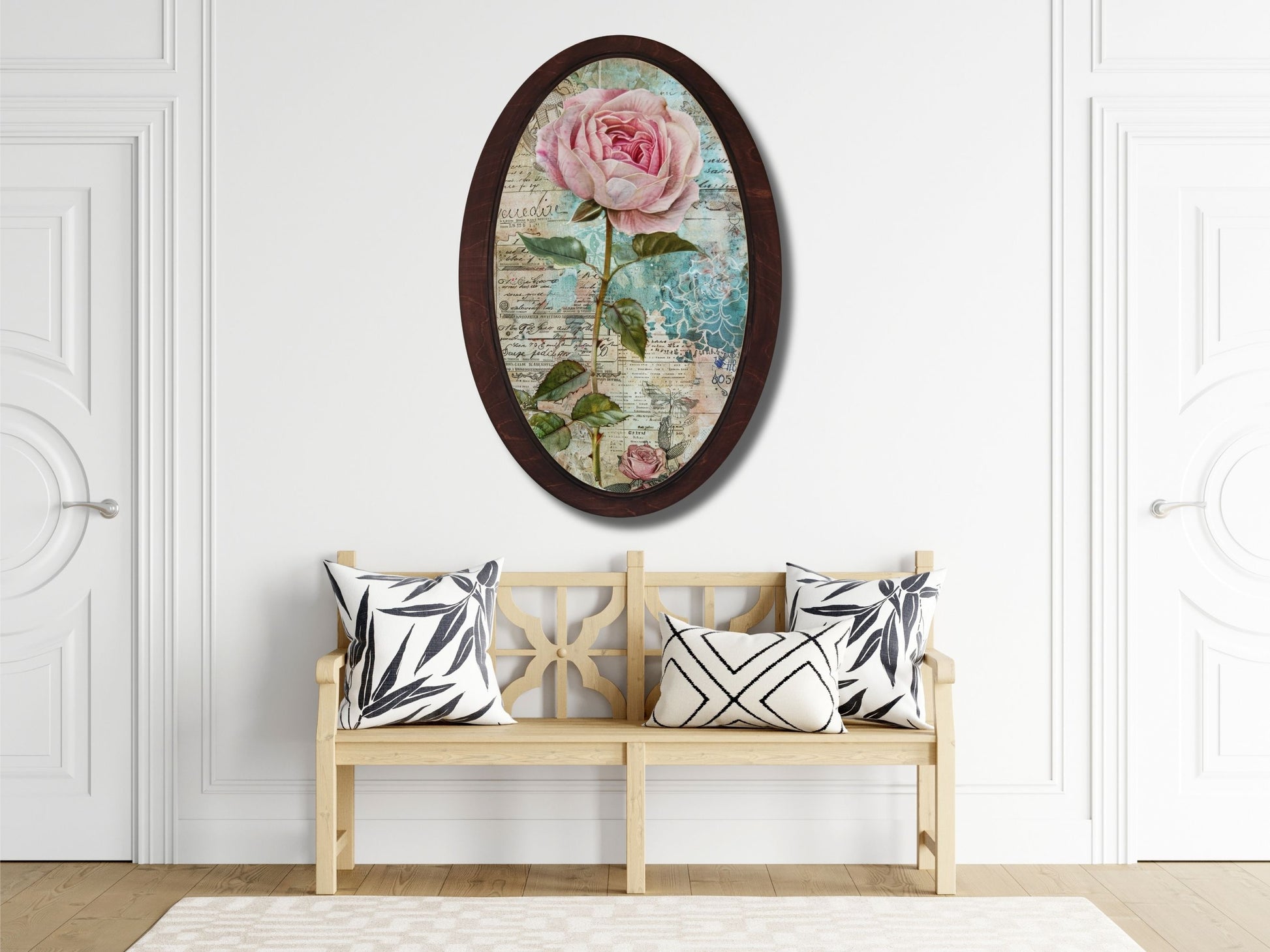 Retro Stil Çiçek Desenli Oval Ahşap Tablo – Klasik Oval Duvar Dekoru - Nostaljik Dekoratif Duvar Tablosu