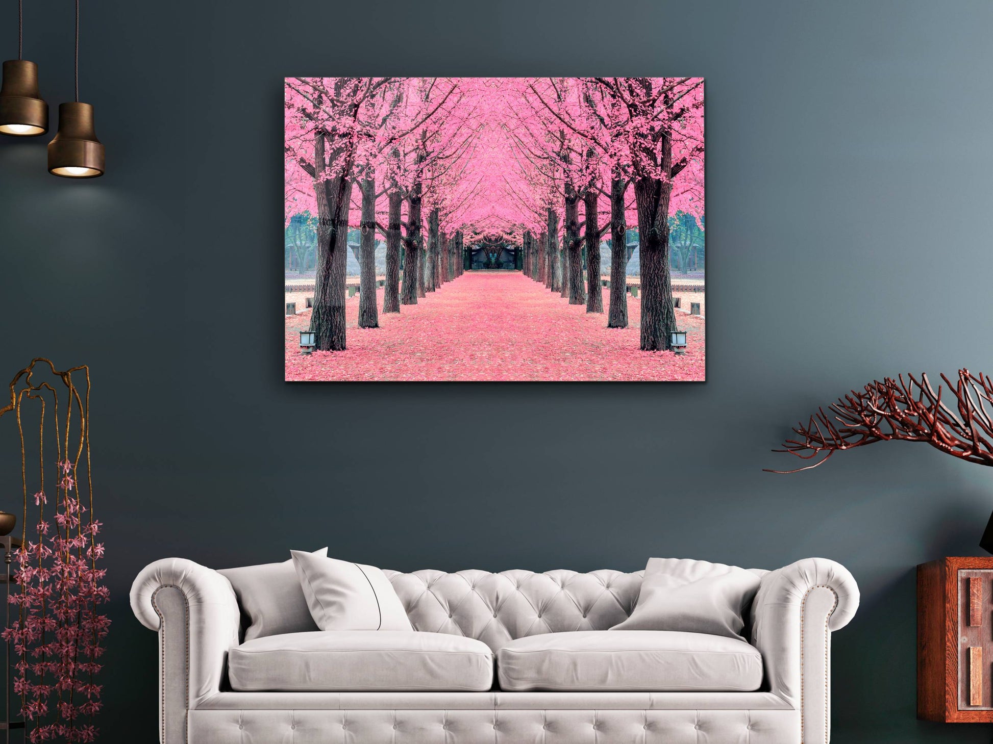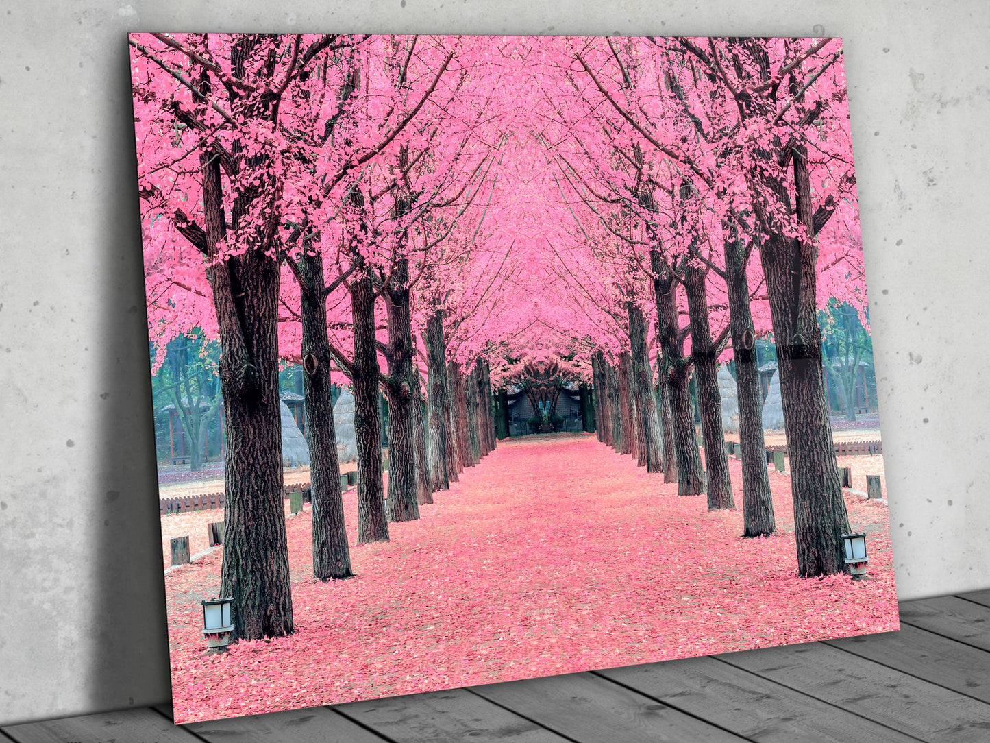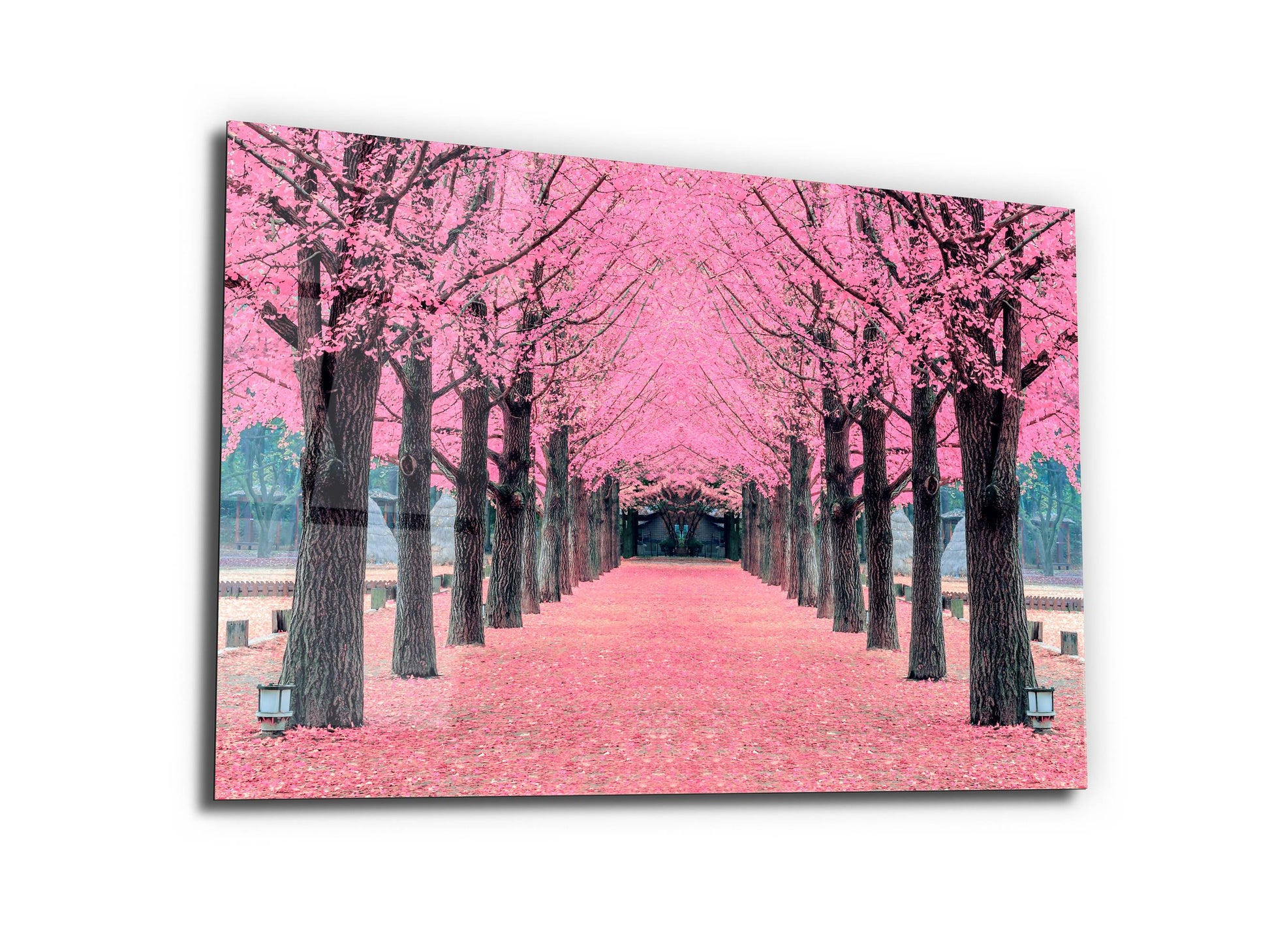Sakura Ağaçları Bahar Cam Tablo – Modern Dekoratif Ev ve Ofis Tablosu