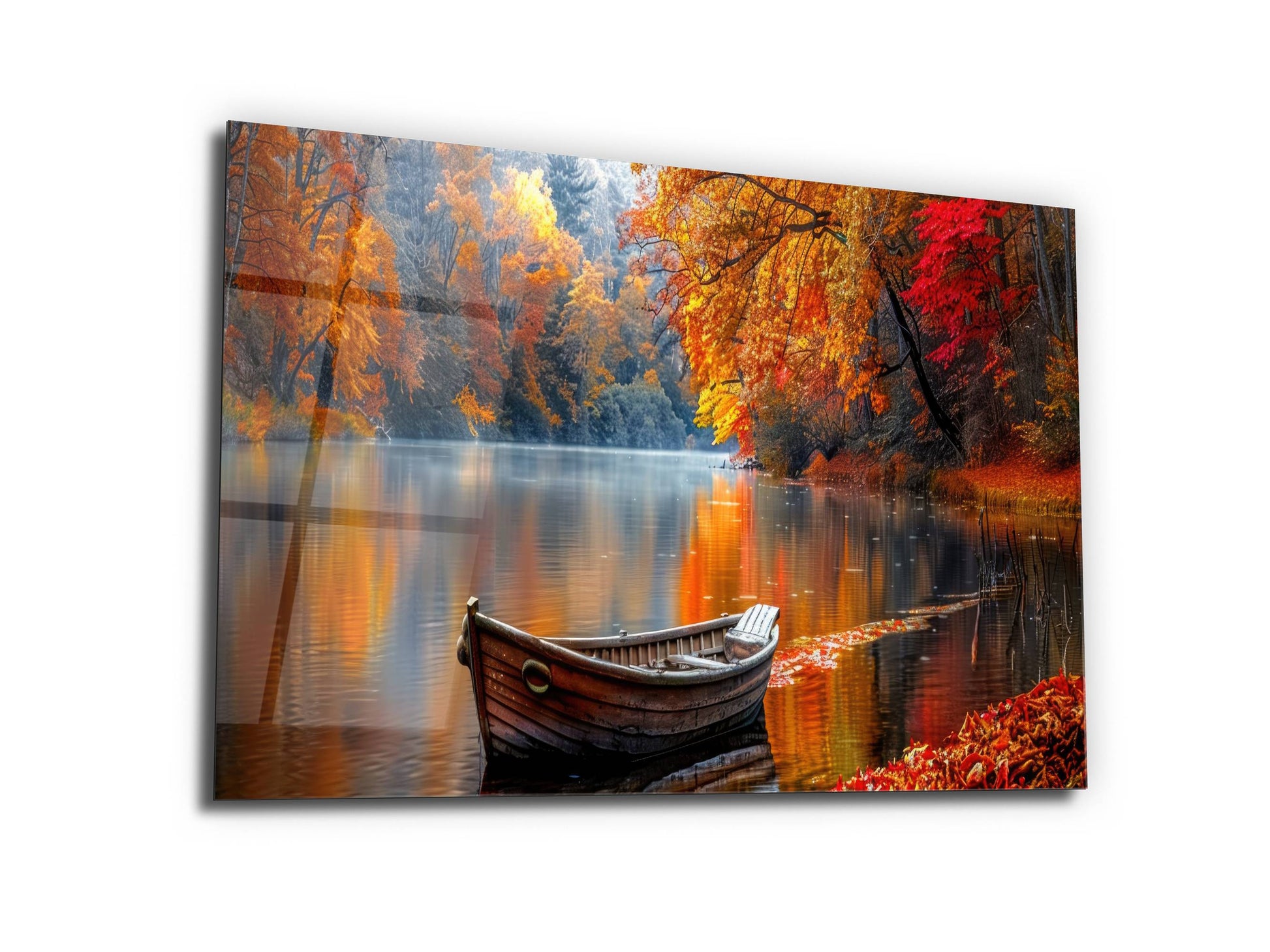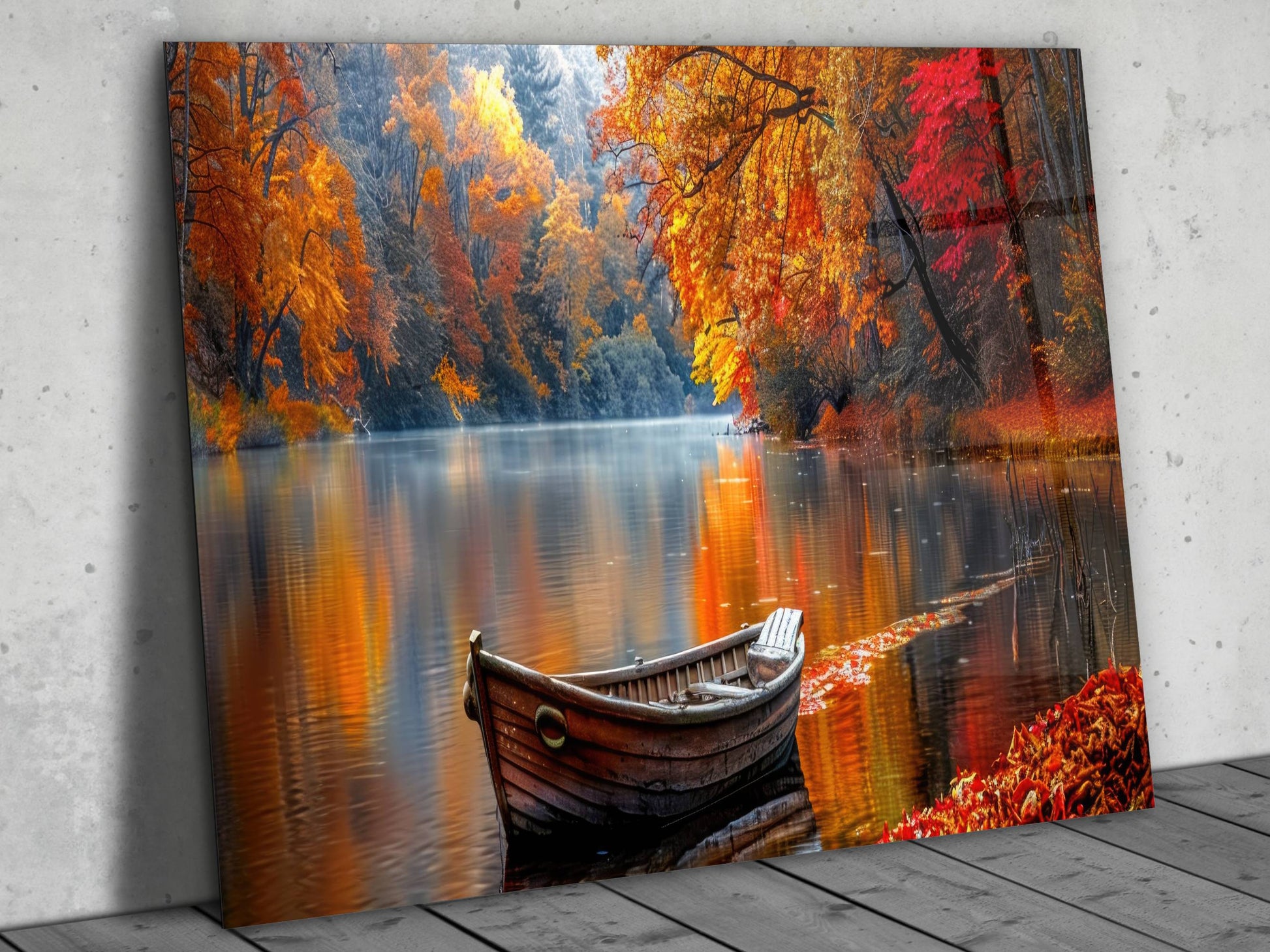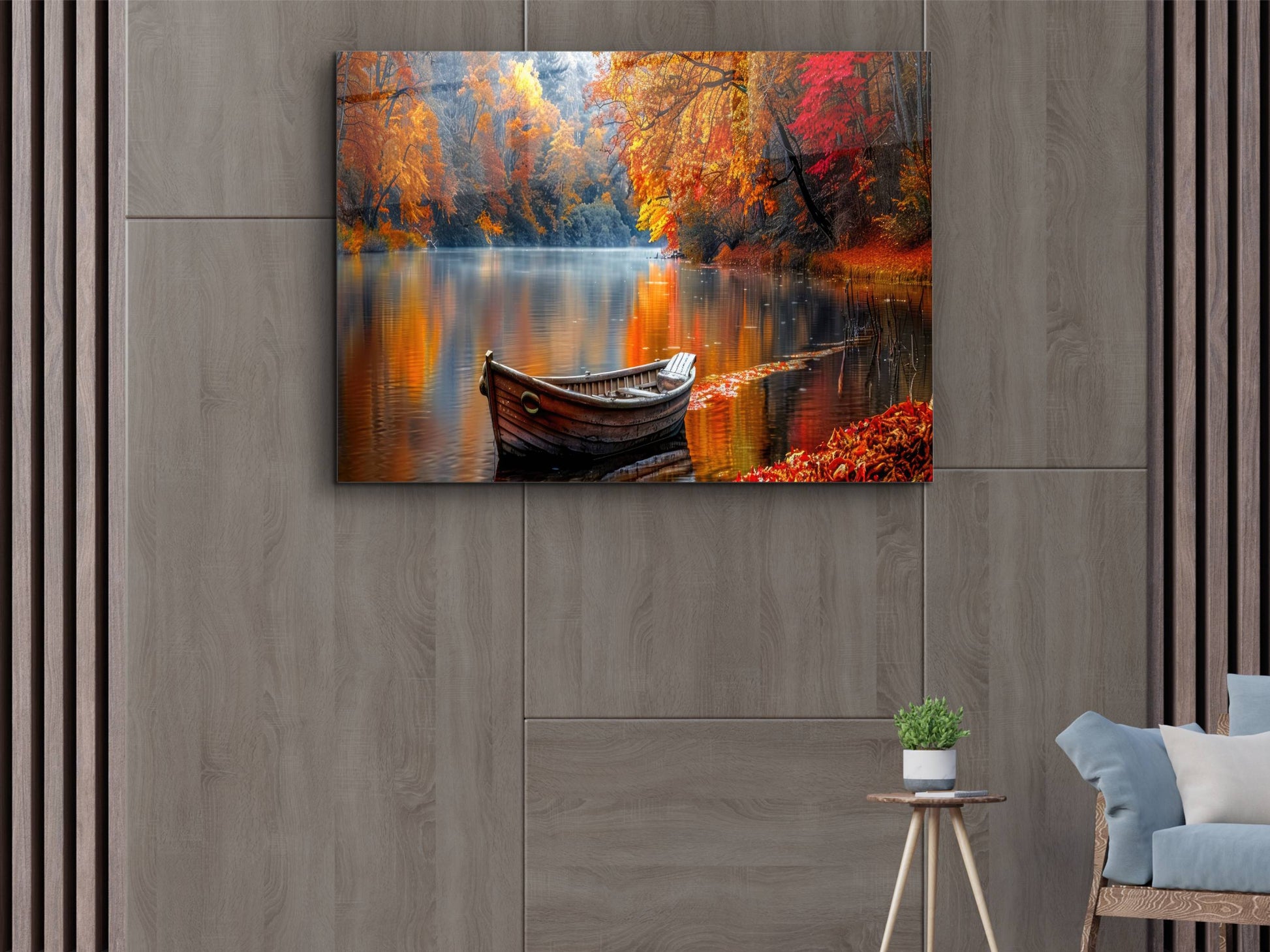 Sessiz Göl ve Sandal Cam Tablo – Sonbahar Temalı Romantik Duvar Tablosu
