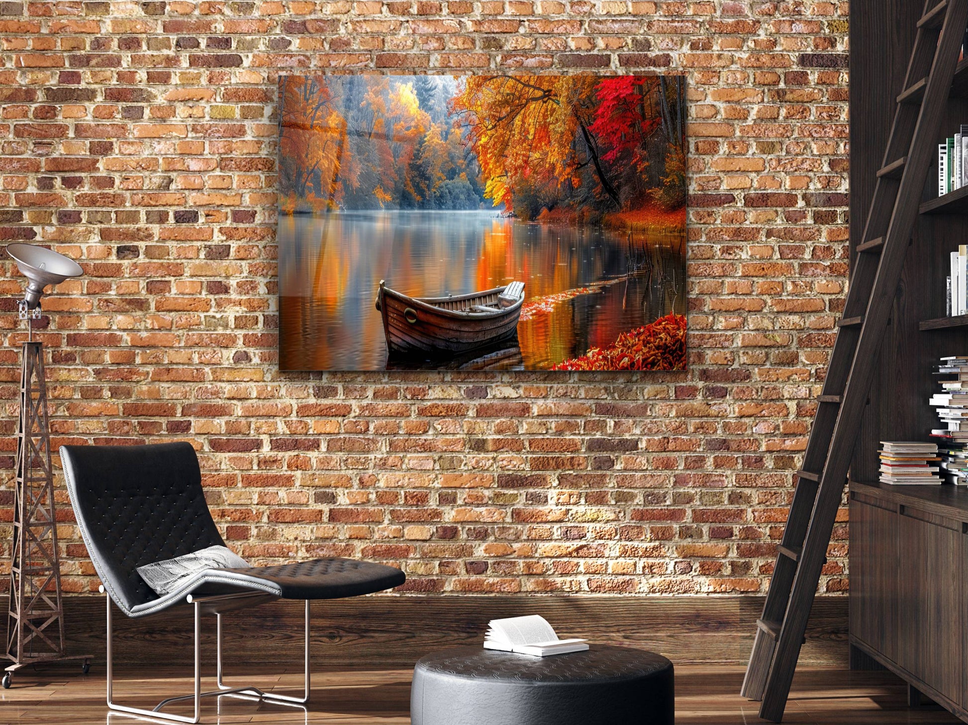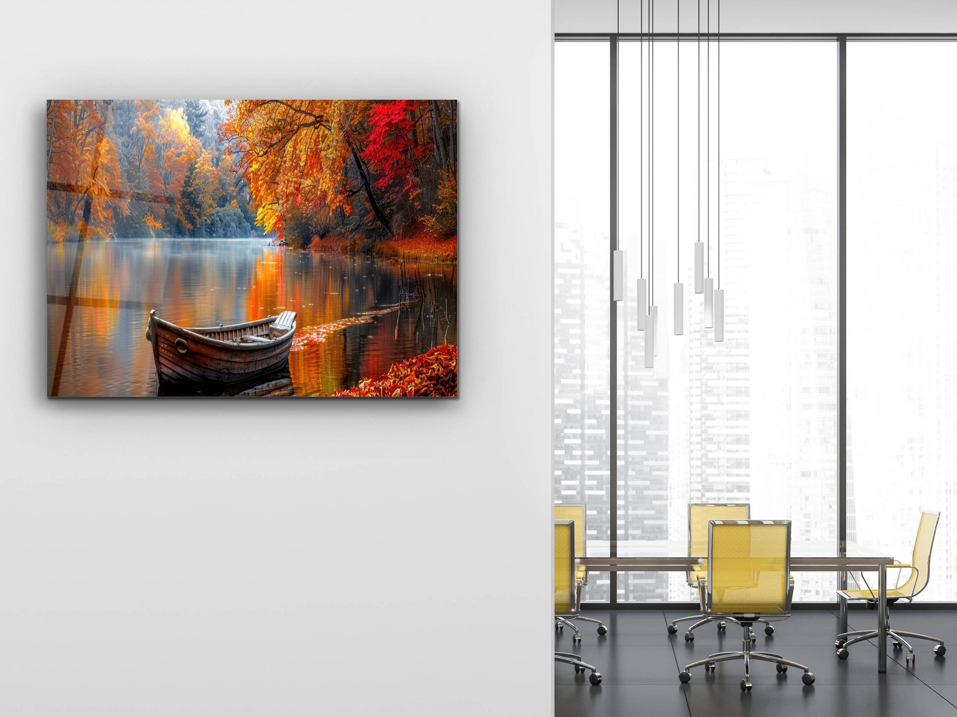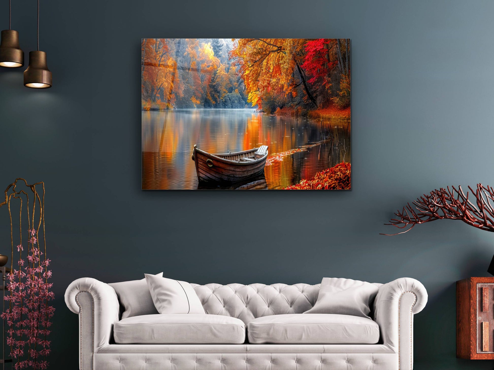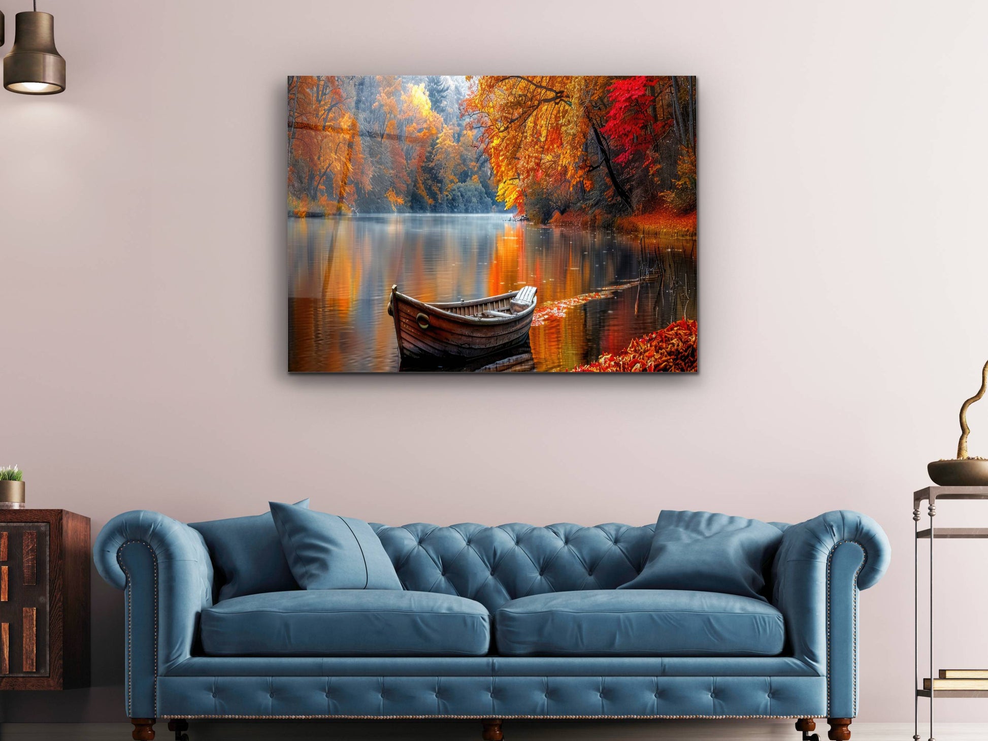 Sessiz Göl ve Sandal Cam Tablo – Sonbahar Temalı Romantik Duvar Tablosu