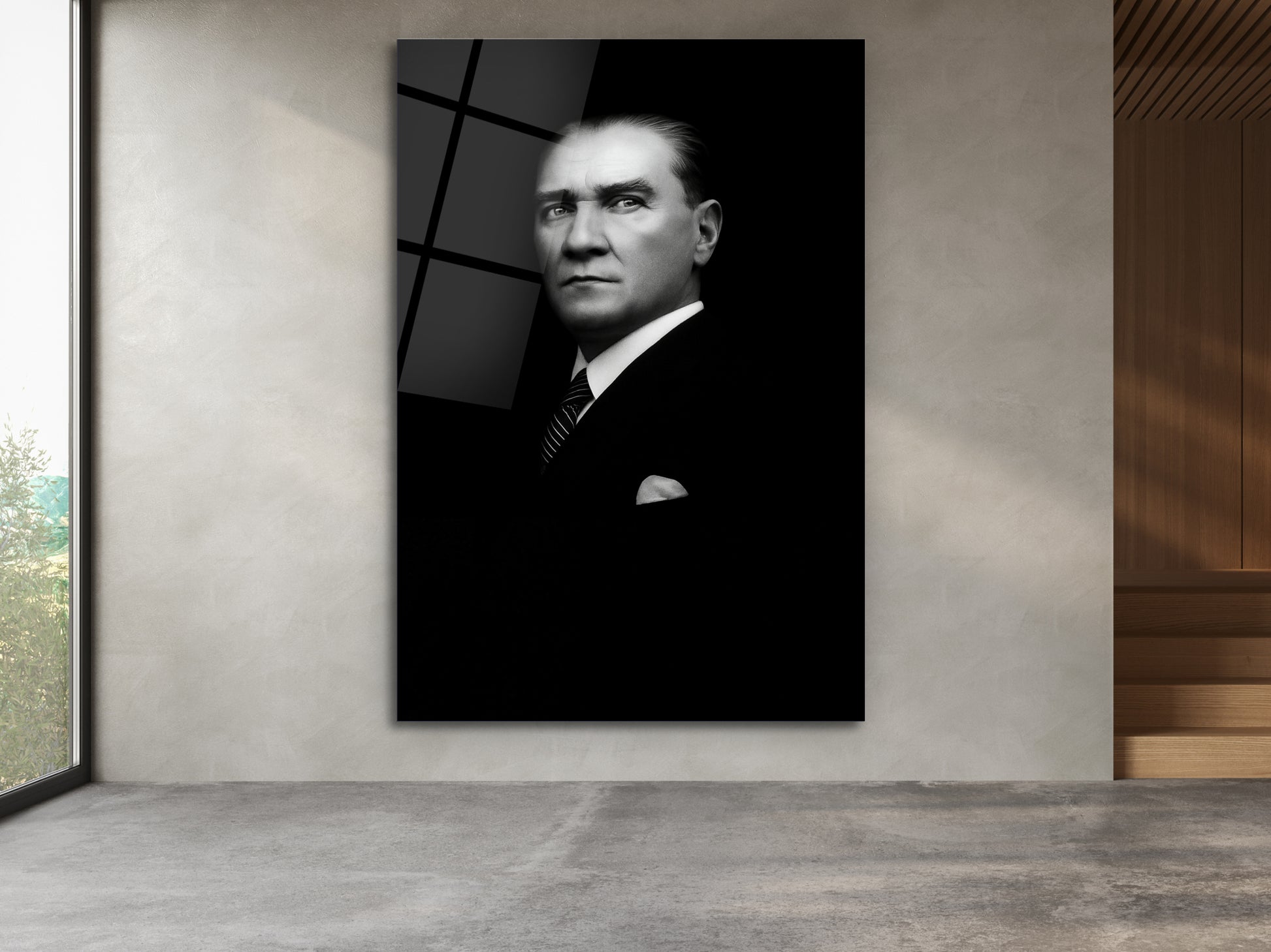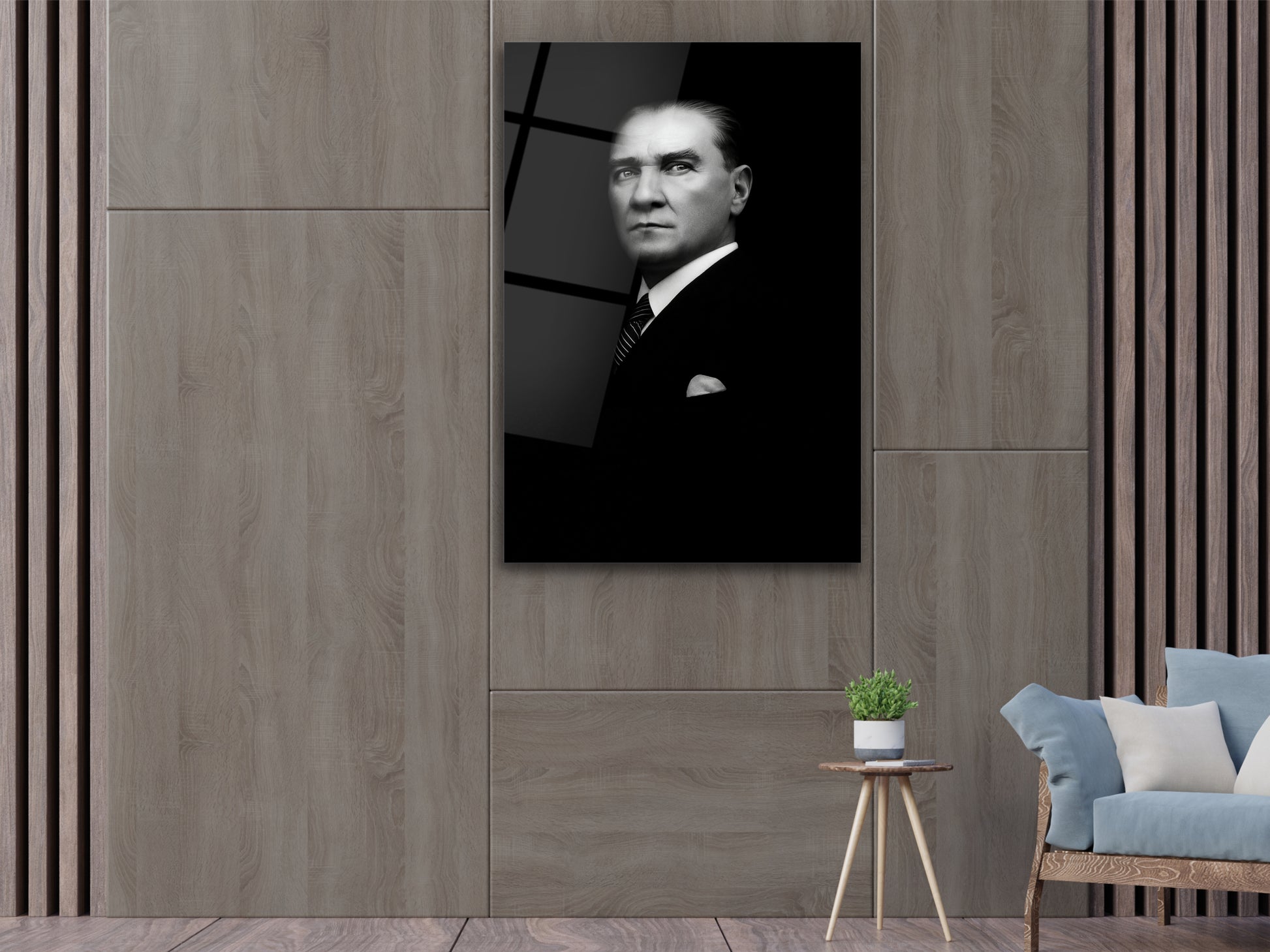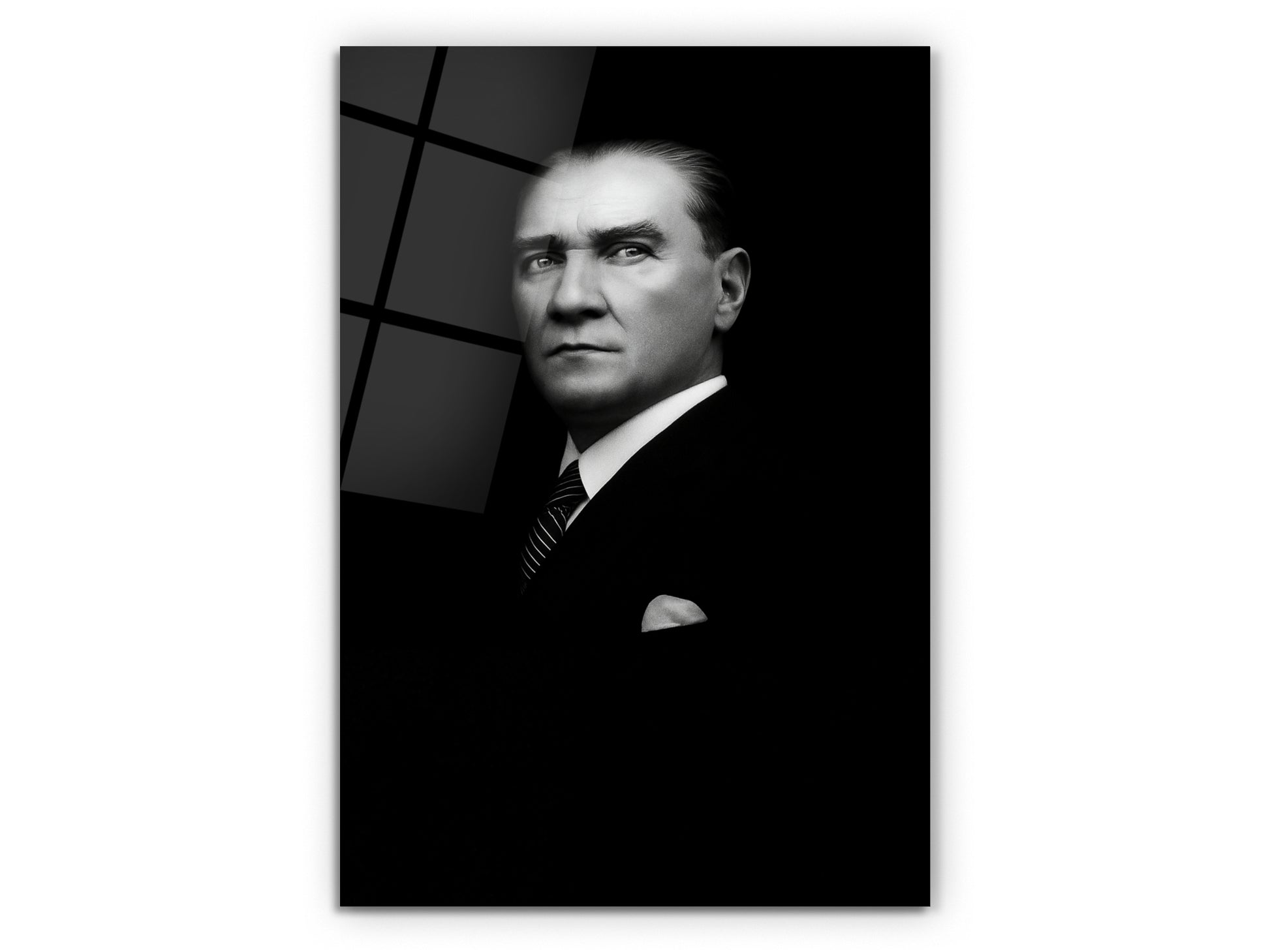Siyah Beyaz Atatürk Portresi Cam Tablo - Atatürk Tablosu - Gazi Mustafa Kemal Ev ve Ofis Dekoru