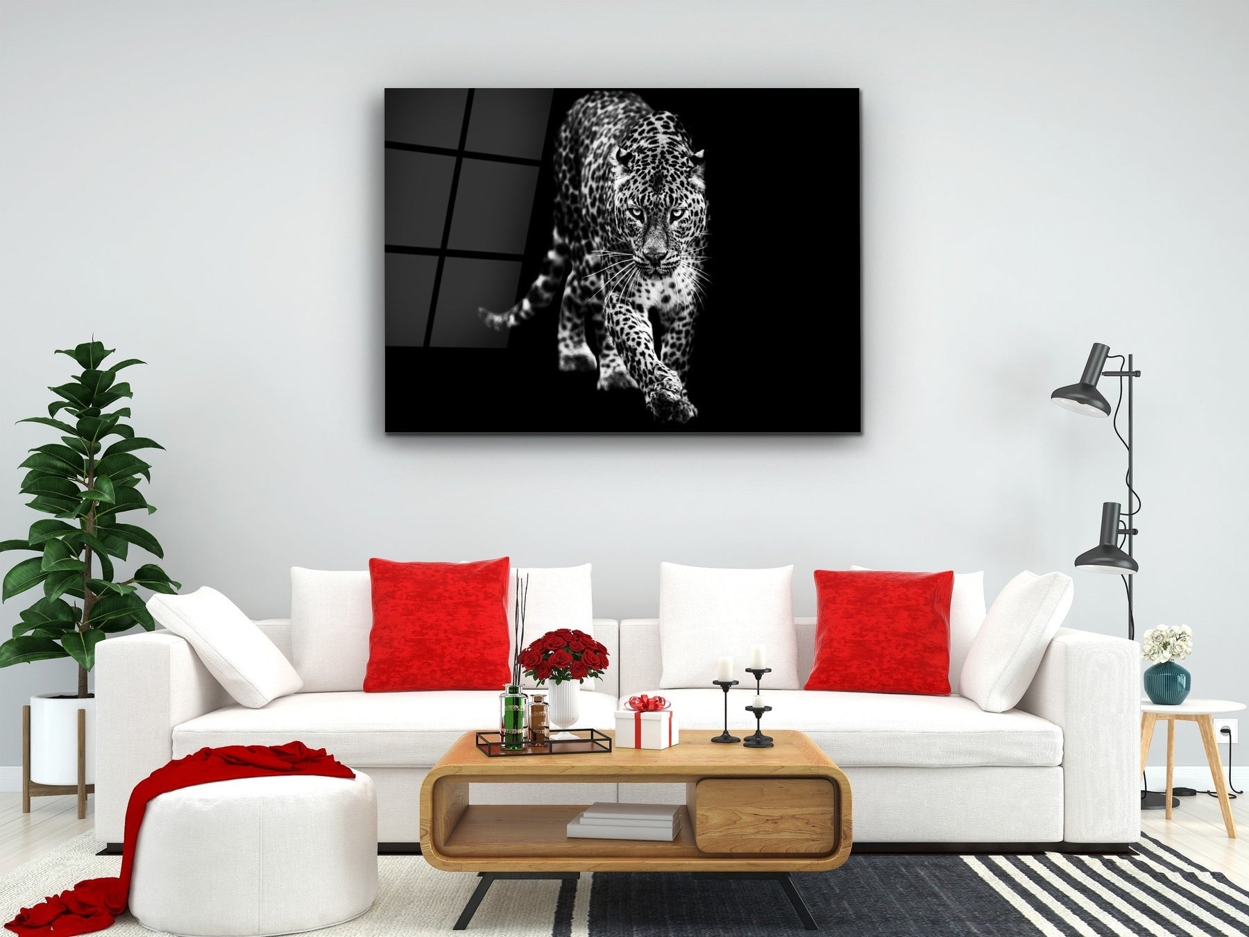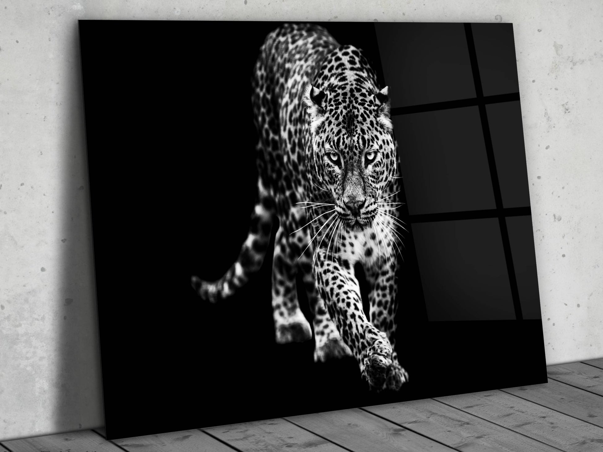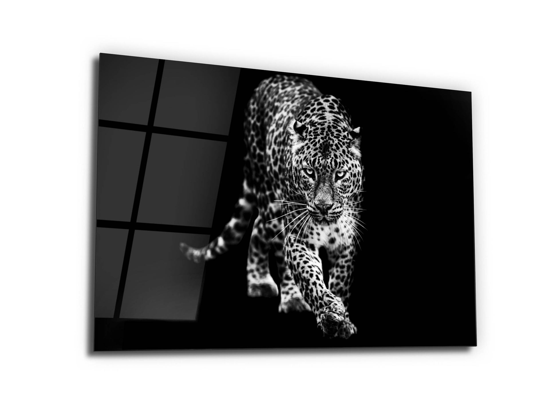 Siyah Beyaz Leopar Cam Tablo - Hayvan Duvar Dekoru