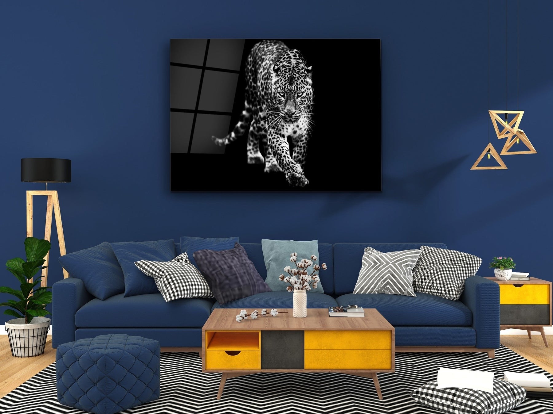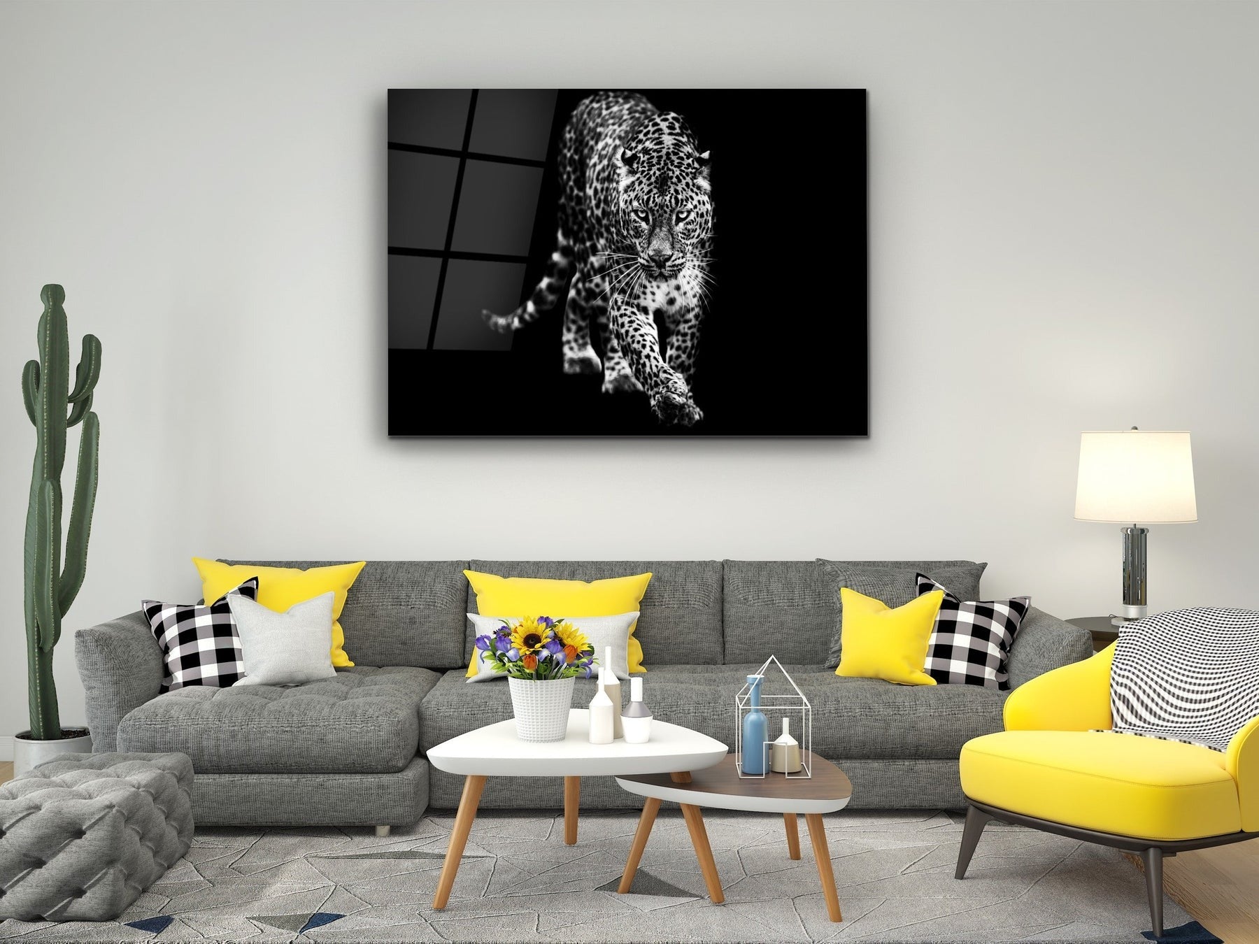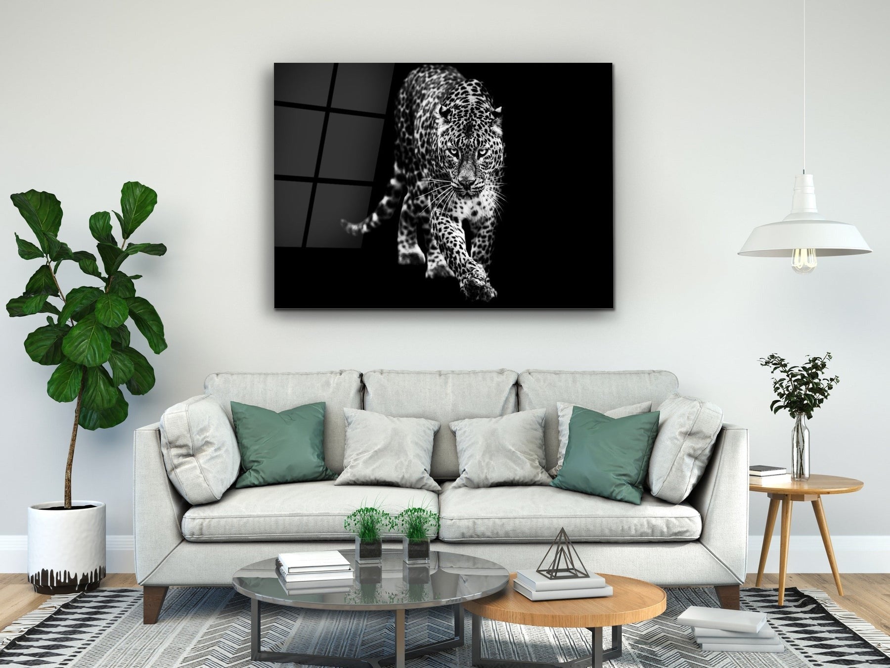 Siyah Beyaz Leopar Cam Tablo - Hayvan Duvar Dekoru