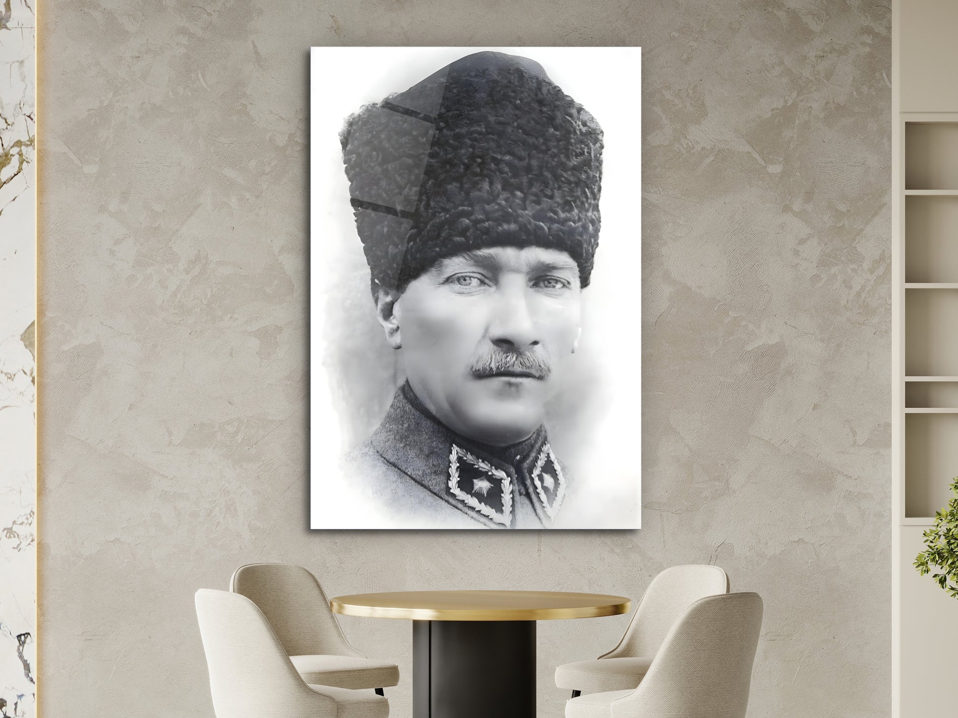 Siyah Beyaz Mustafa Kemal Atatürk Portresi Cam Tablo – Atatürk Tablosu - Modern Ev ve Ofis Dekoru