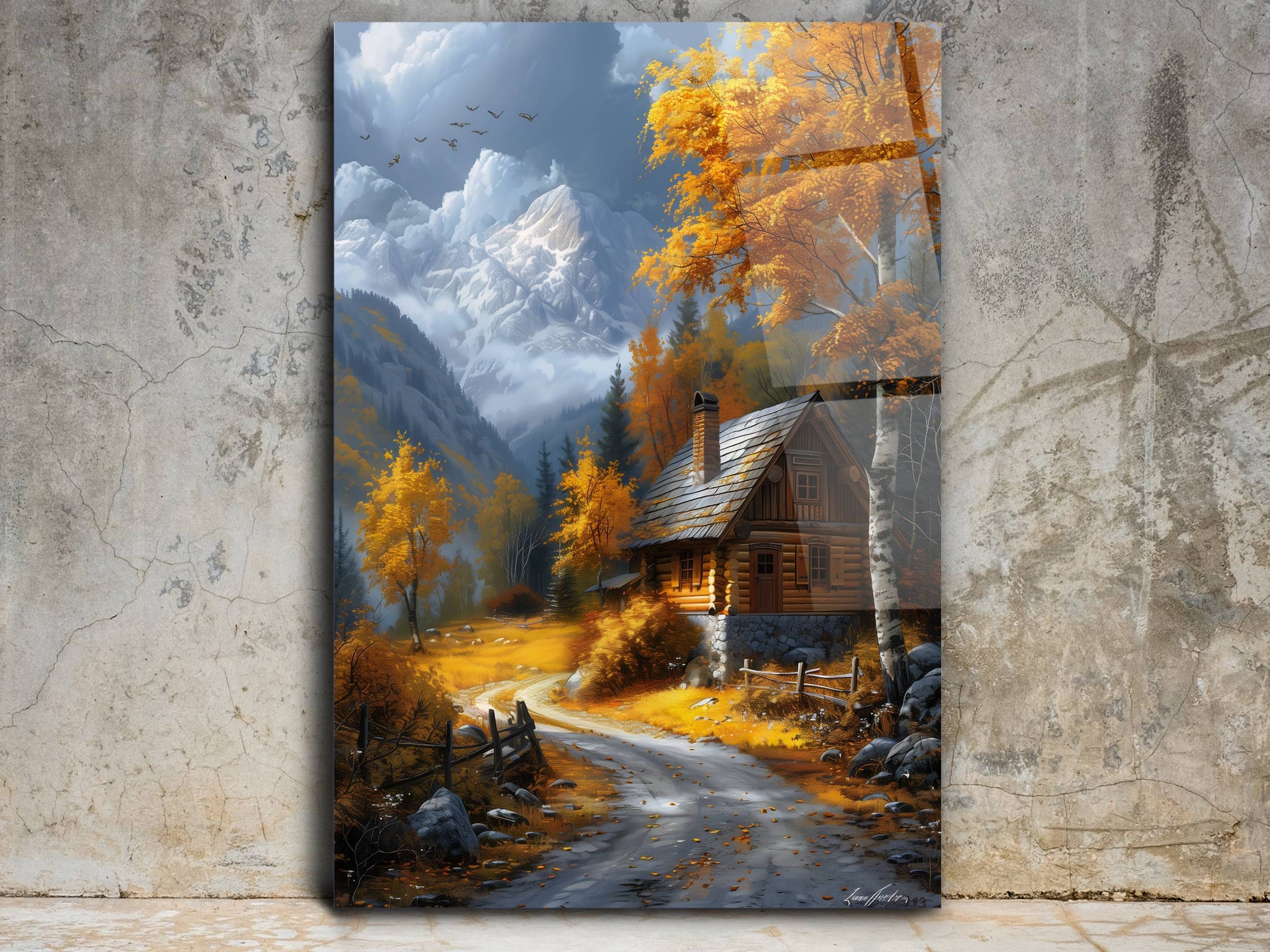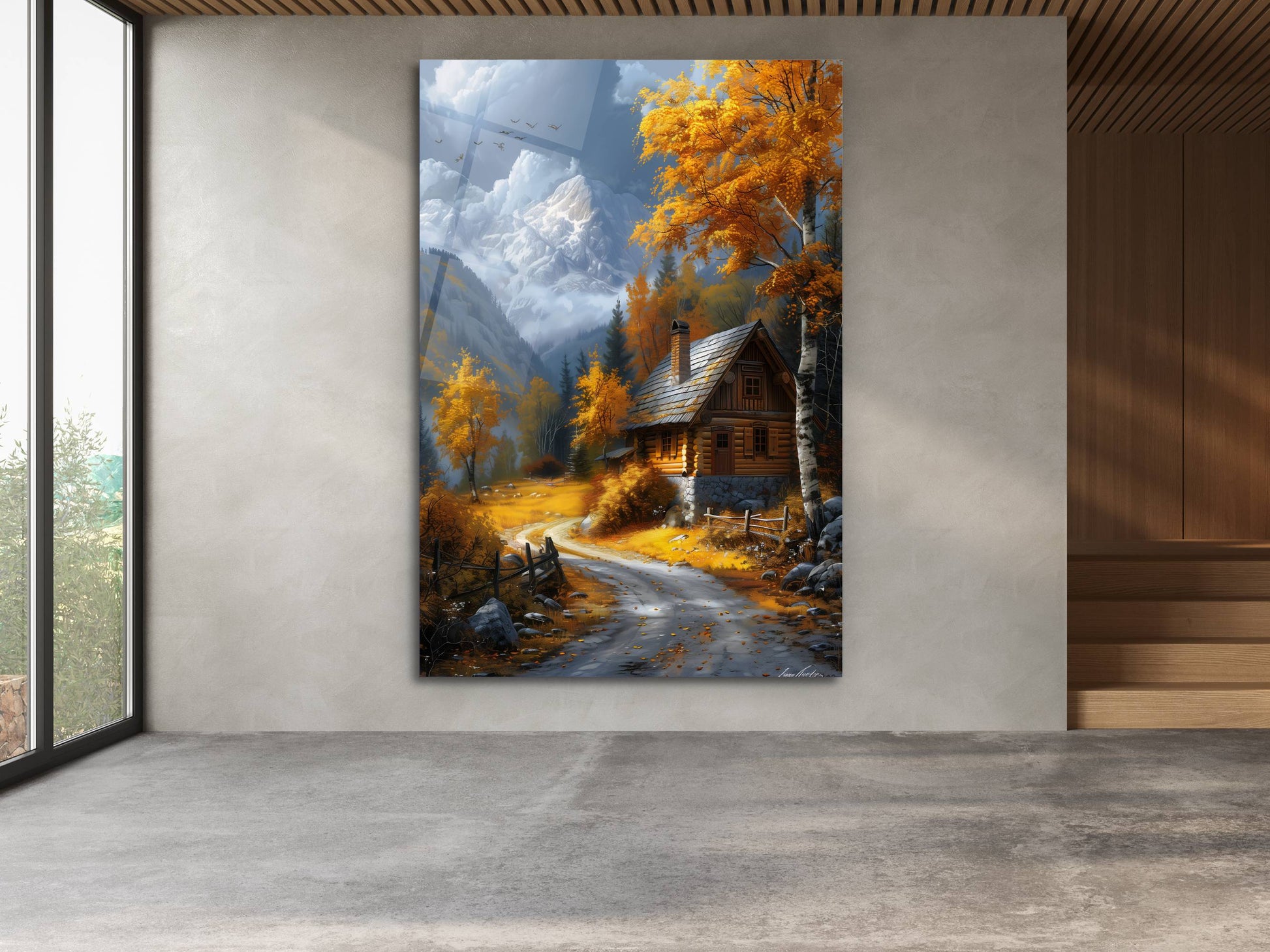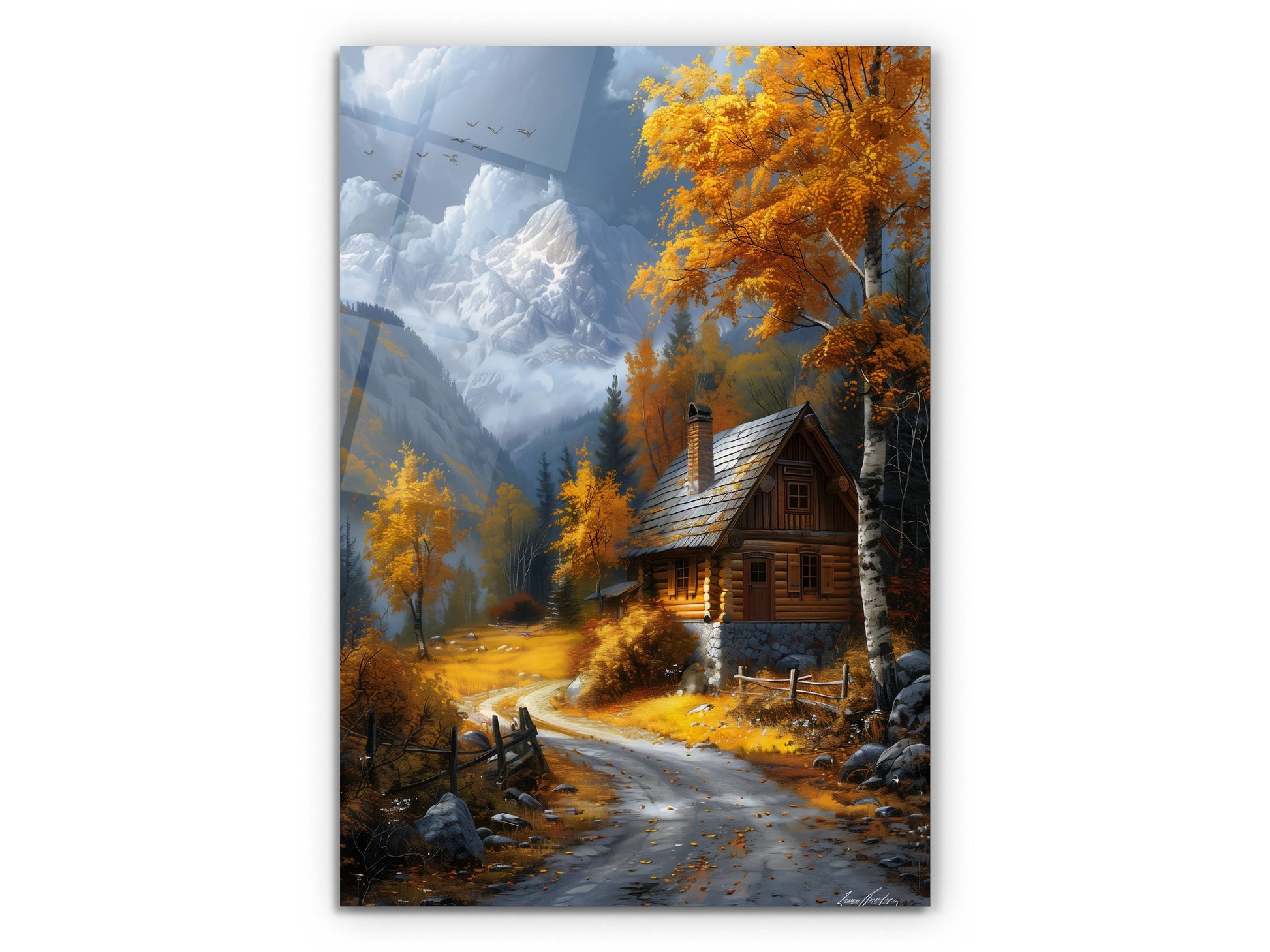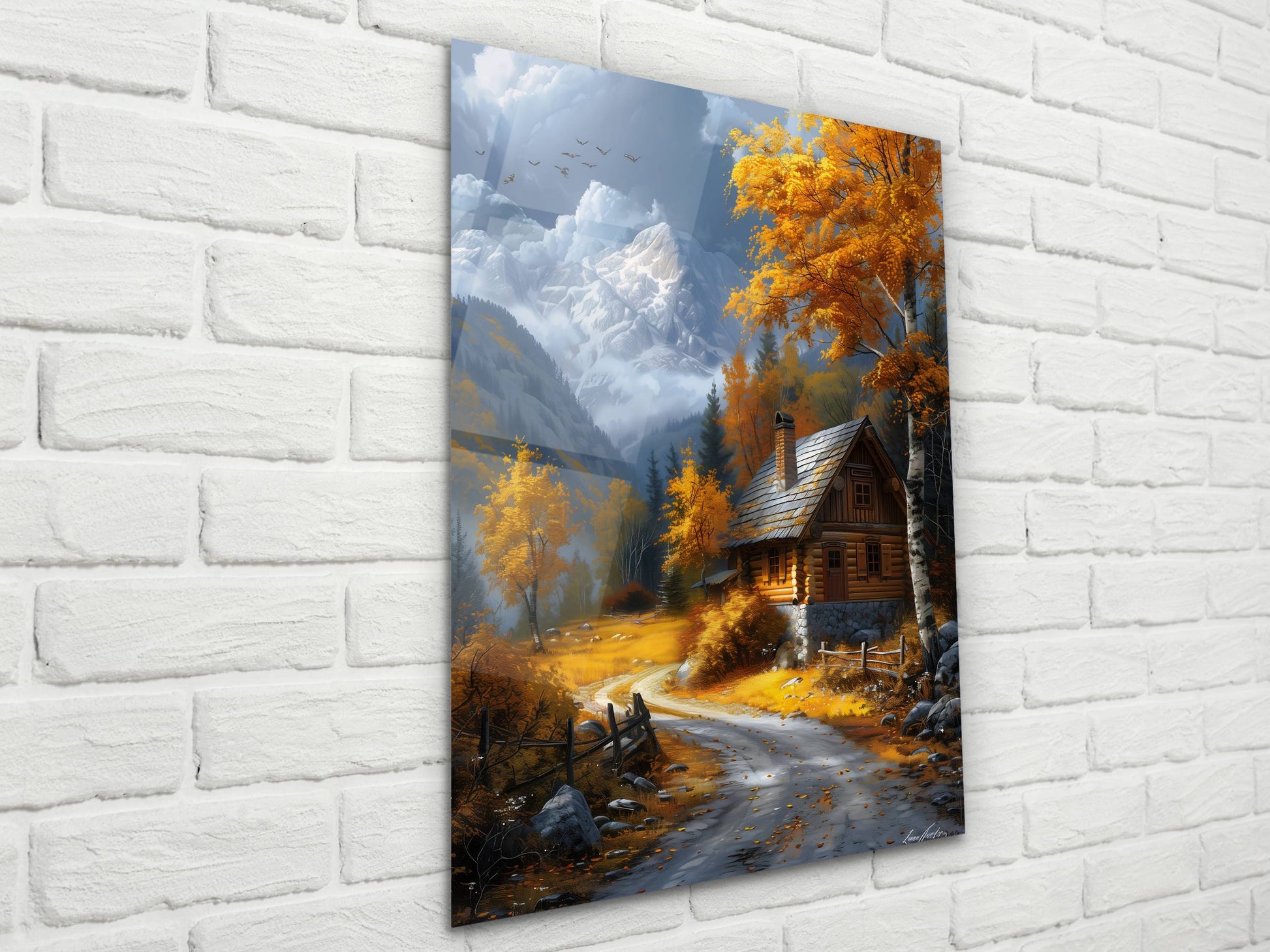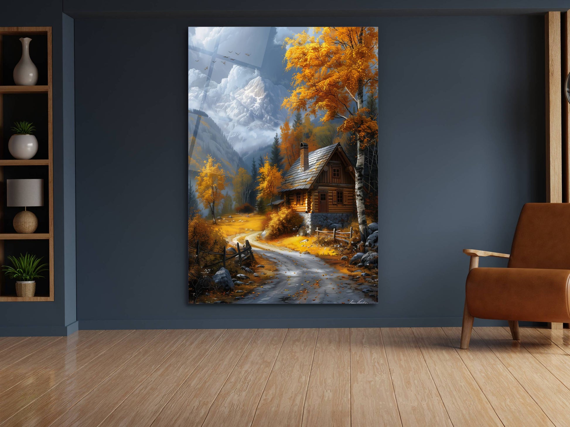 Sonbahar Dağ Evi ve Kar Manzaralı Cam Tablo-Modern Ev ve Ofis Dekoru