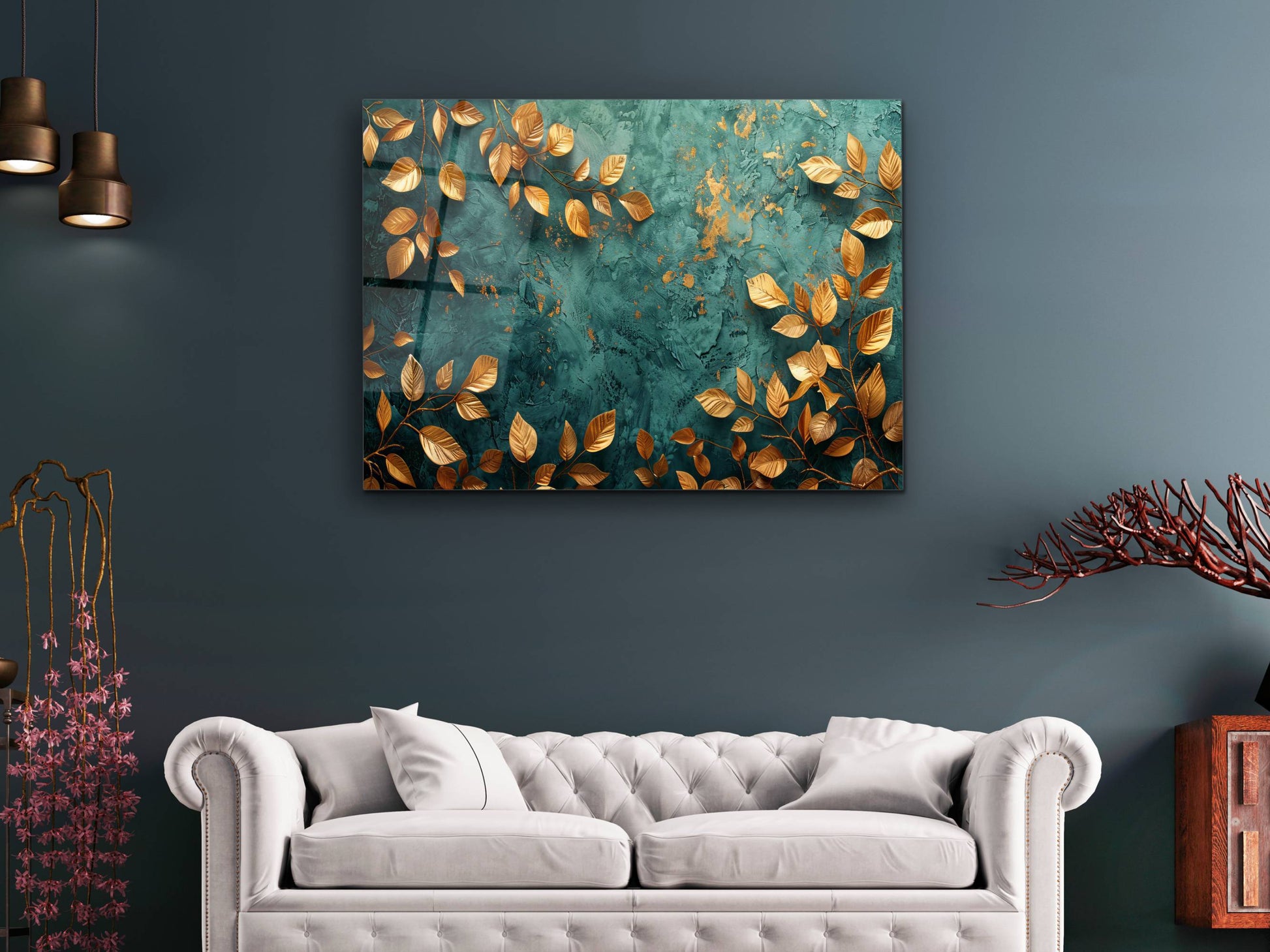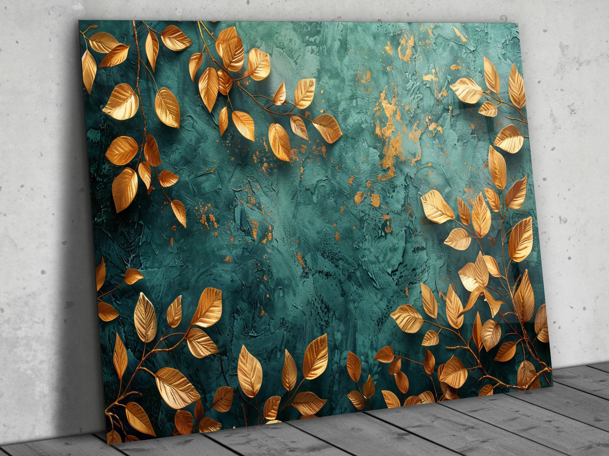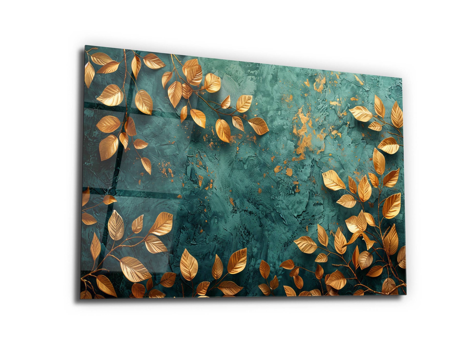 Soyut Gold Yaprak Desen Cam Tablo - Dekoratif Tablo