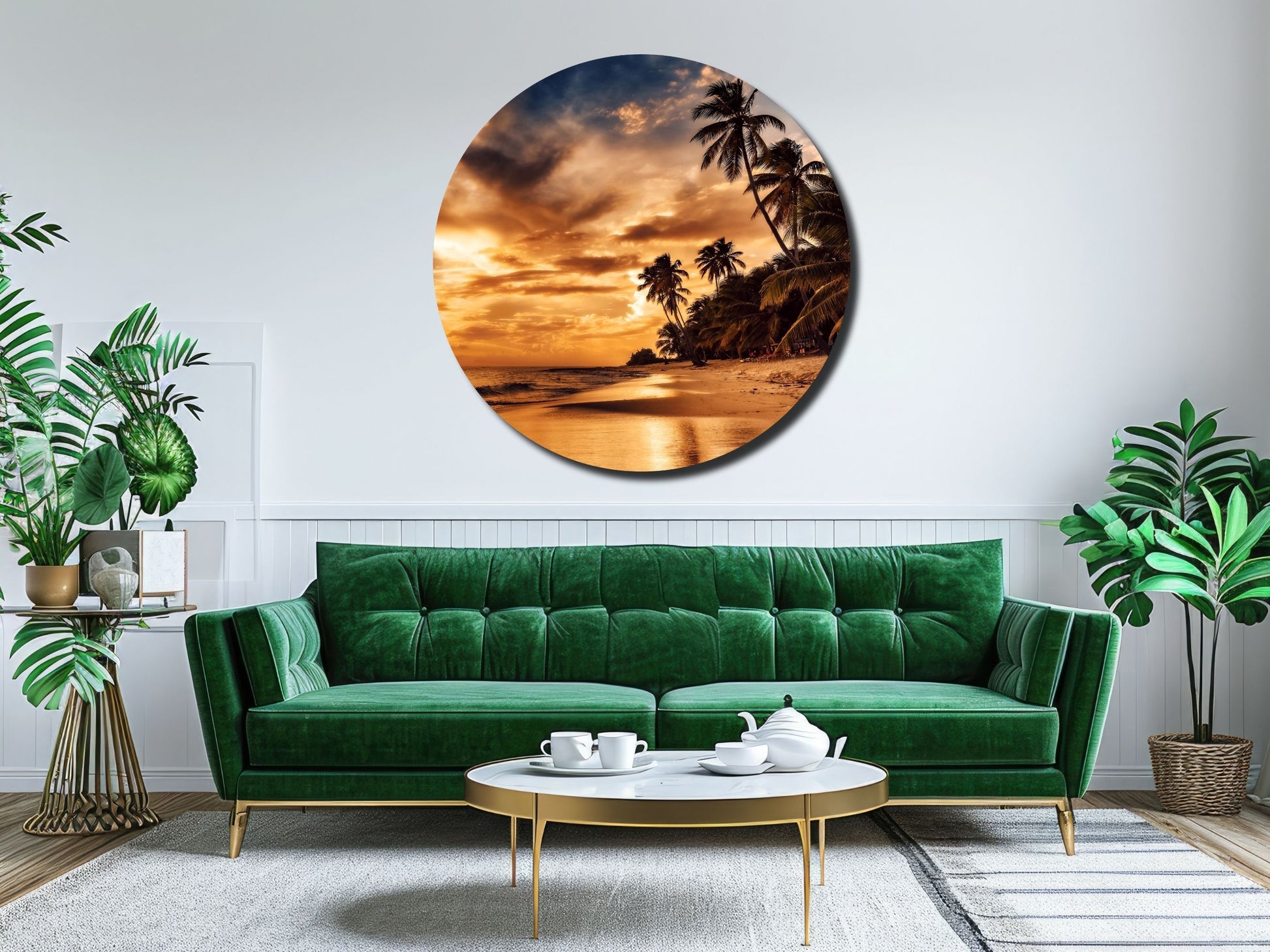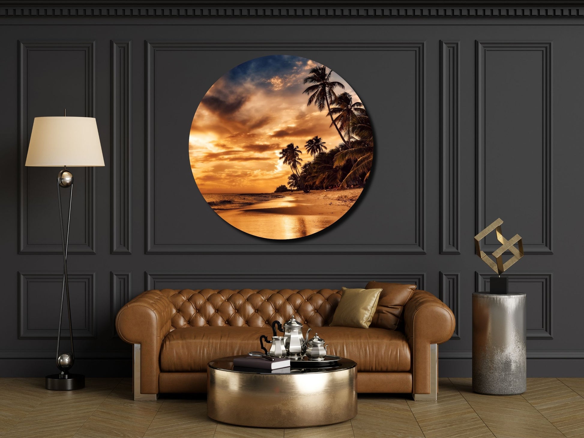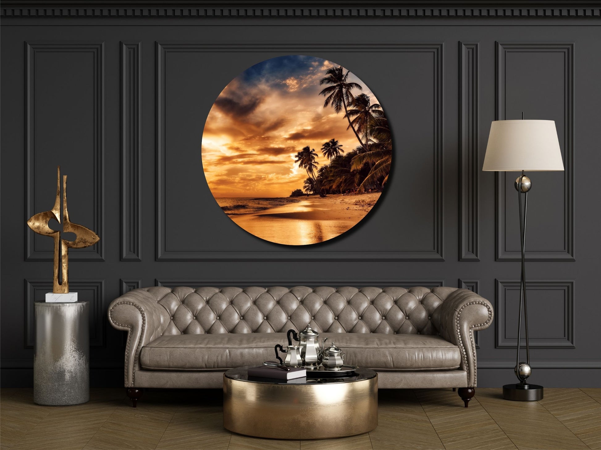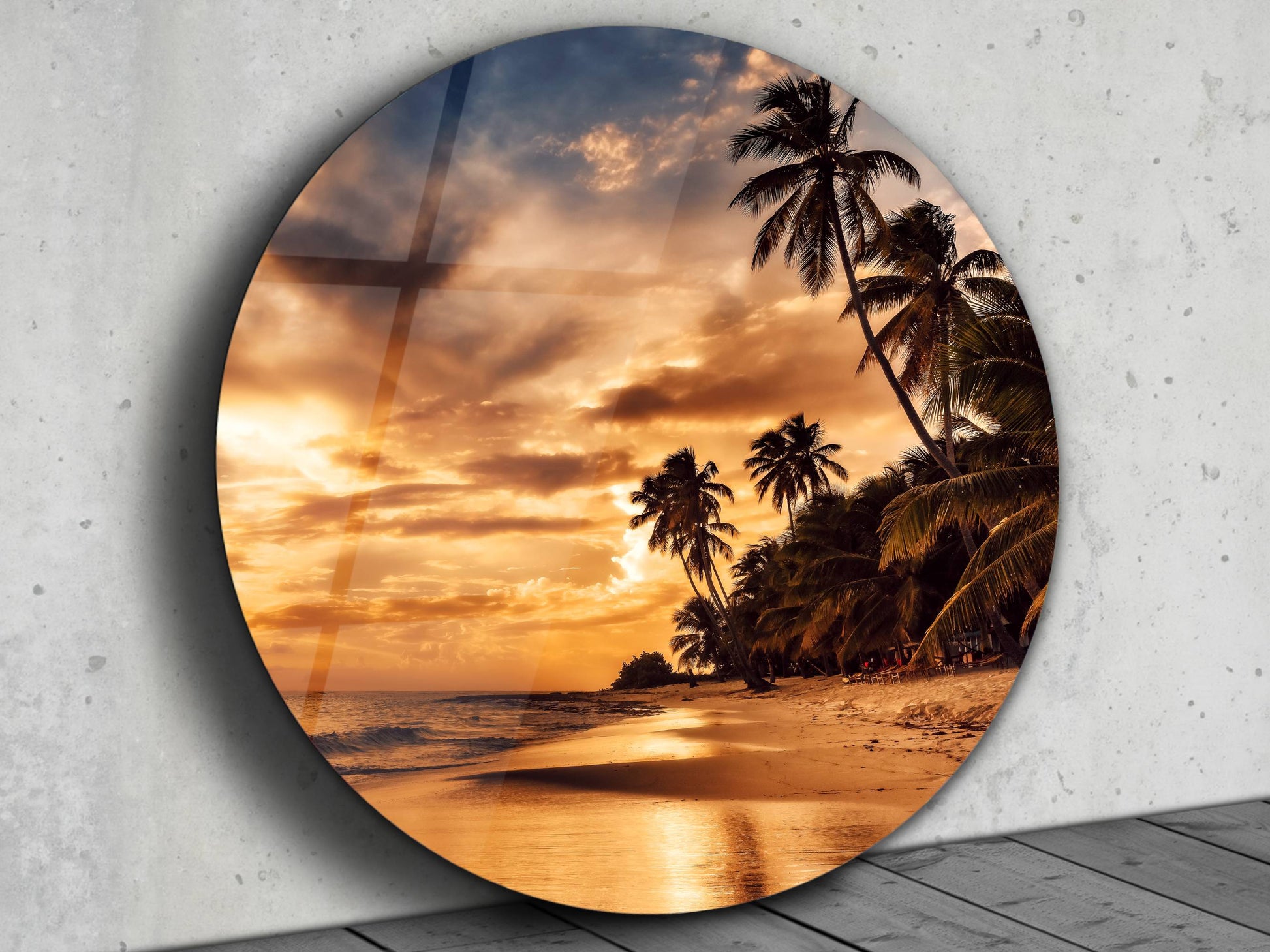 Tropikal Gün Batımı Cam Tablo – Palmiye ve Kumsal Temalı Yuvarlak Tablo