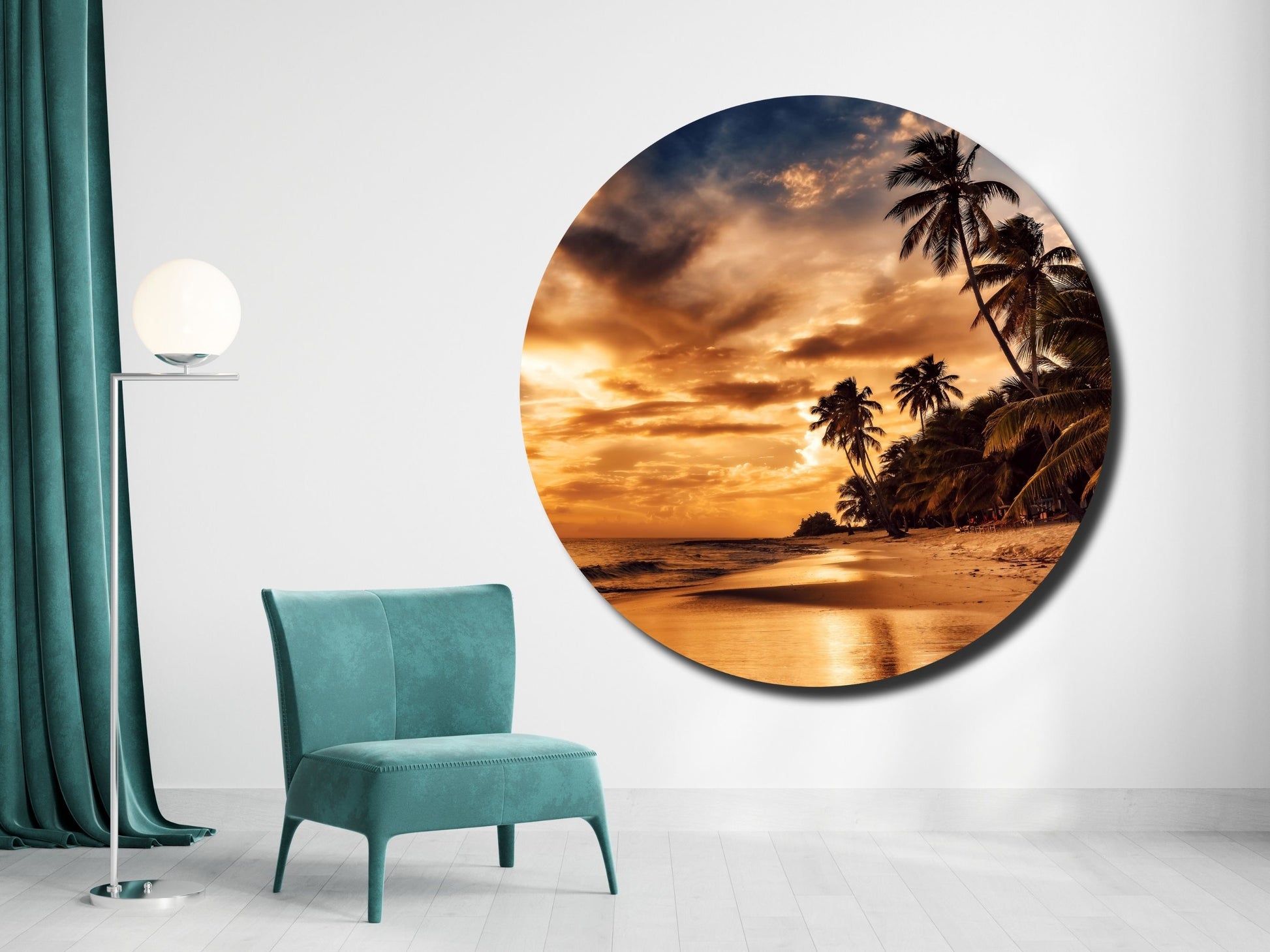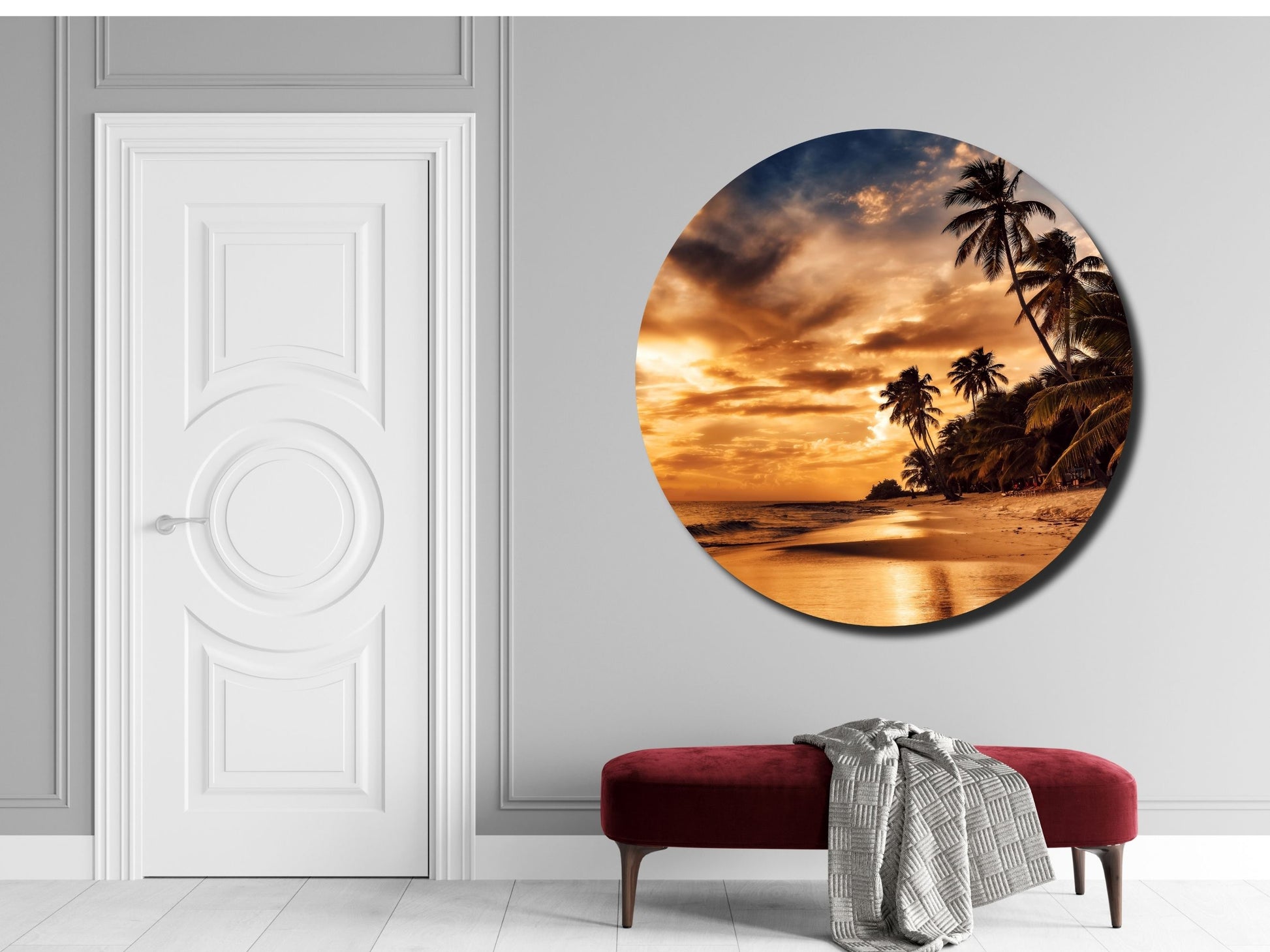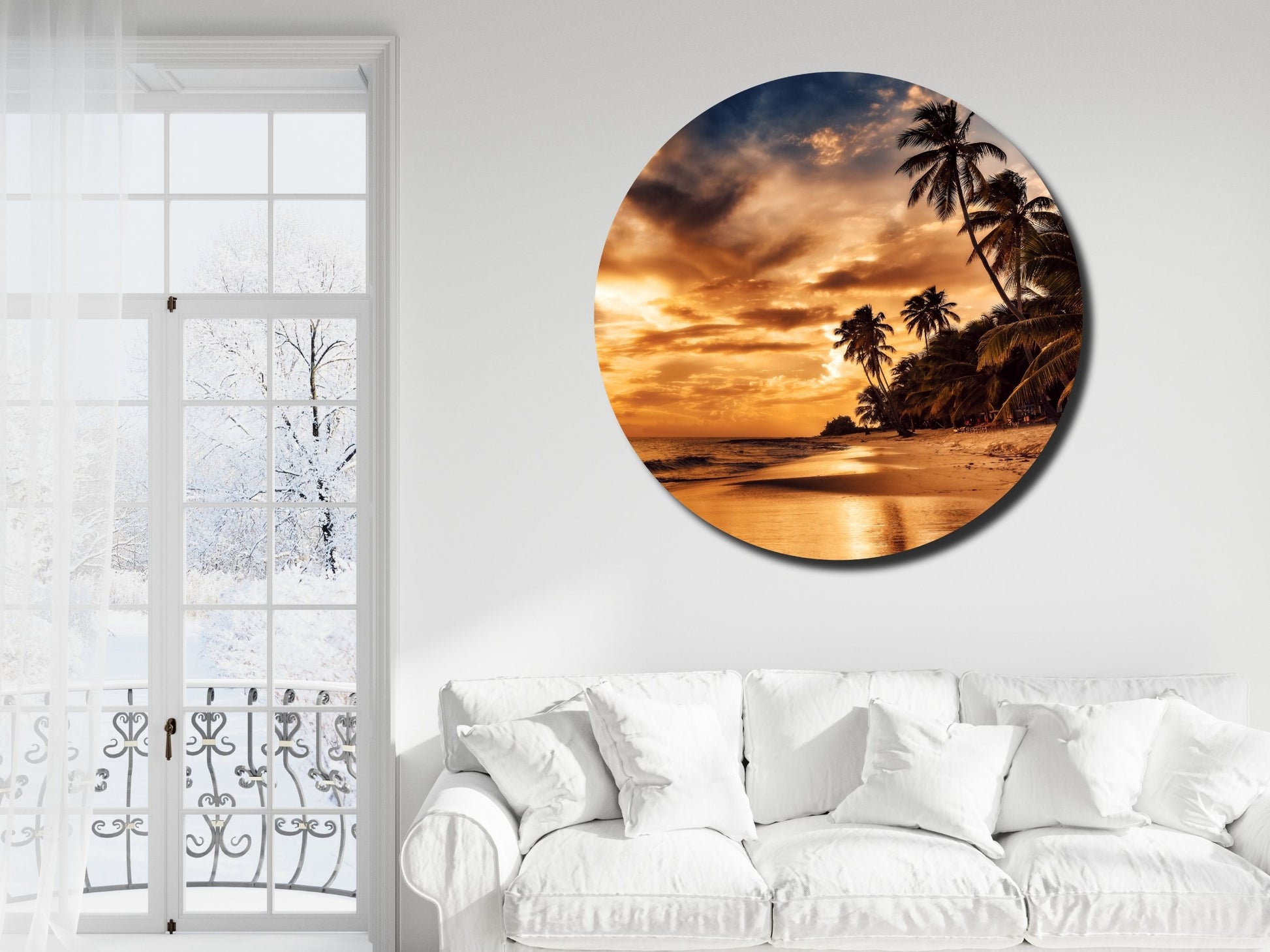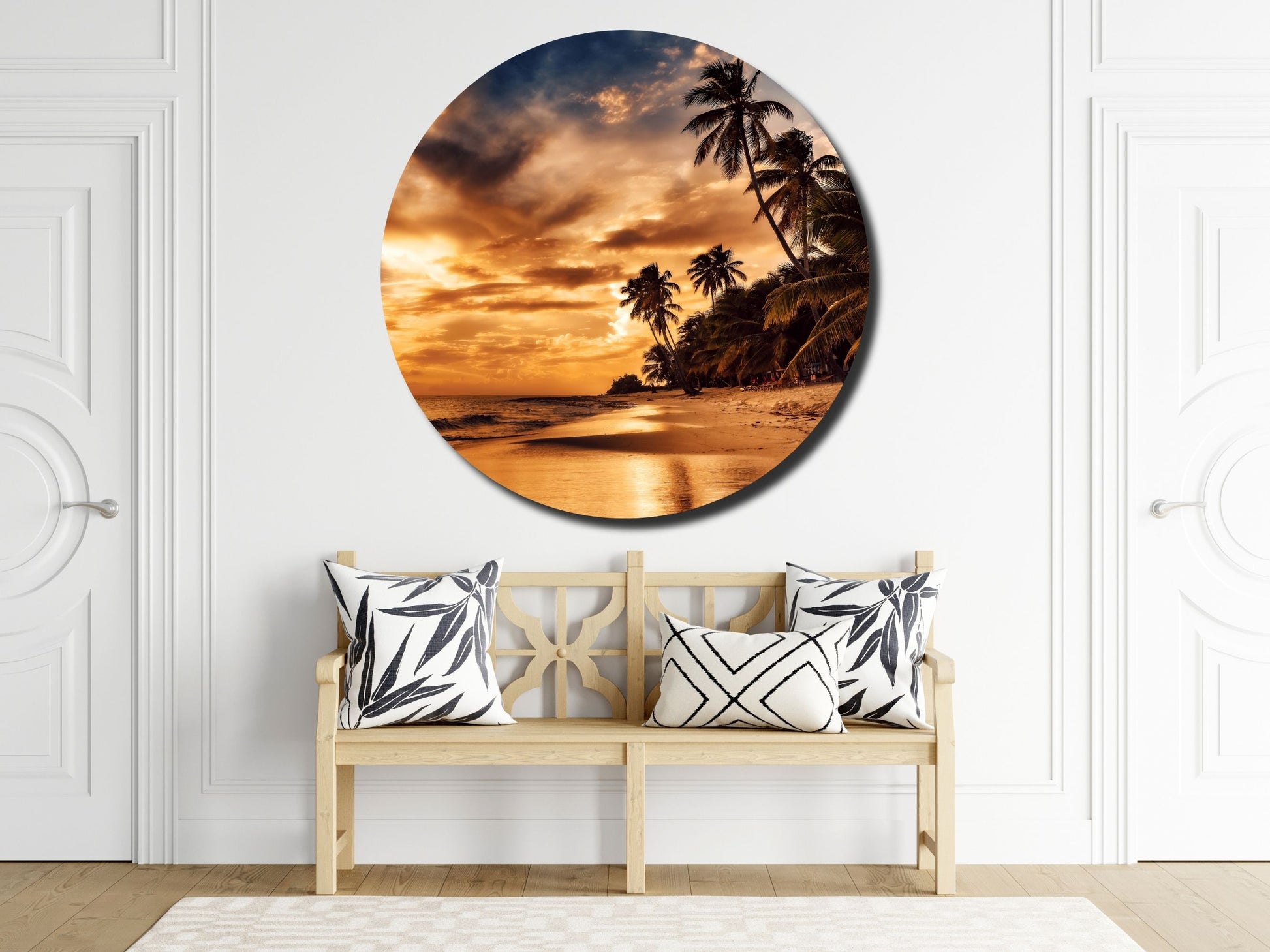 Tropikal Gün Batımı Cam Tablo – Palmiye ve Kumsal Temalı Yuvarlak Tablo