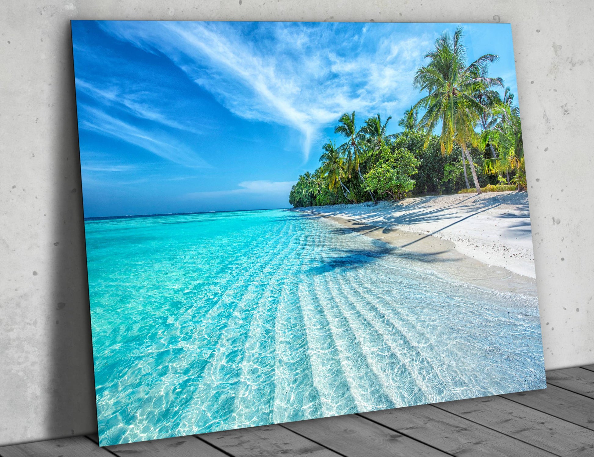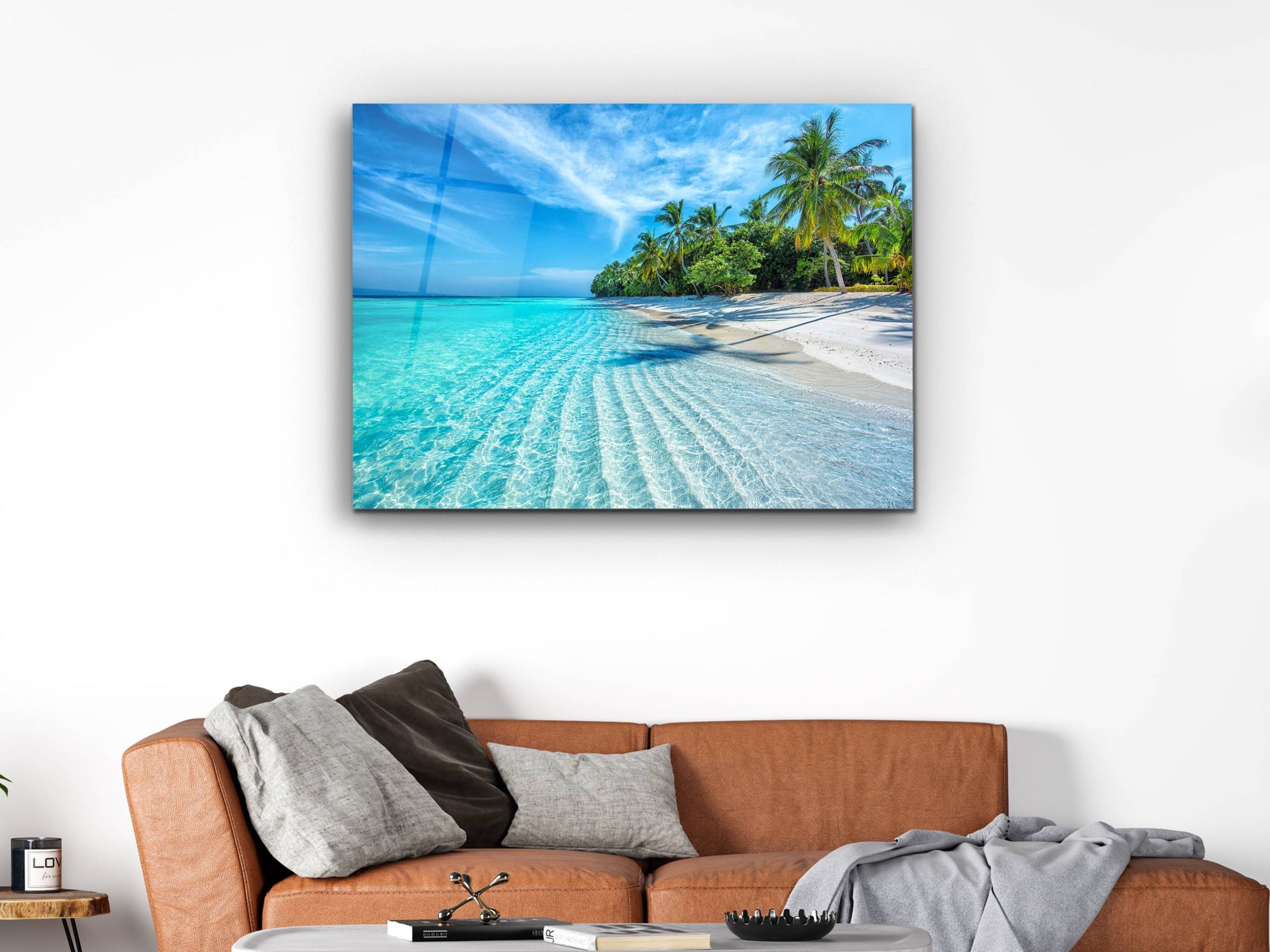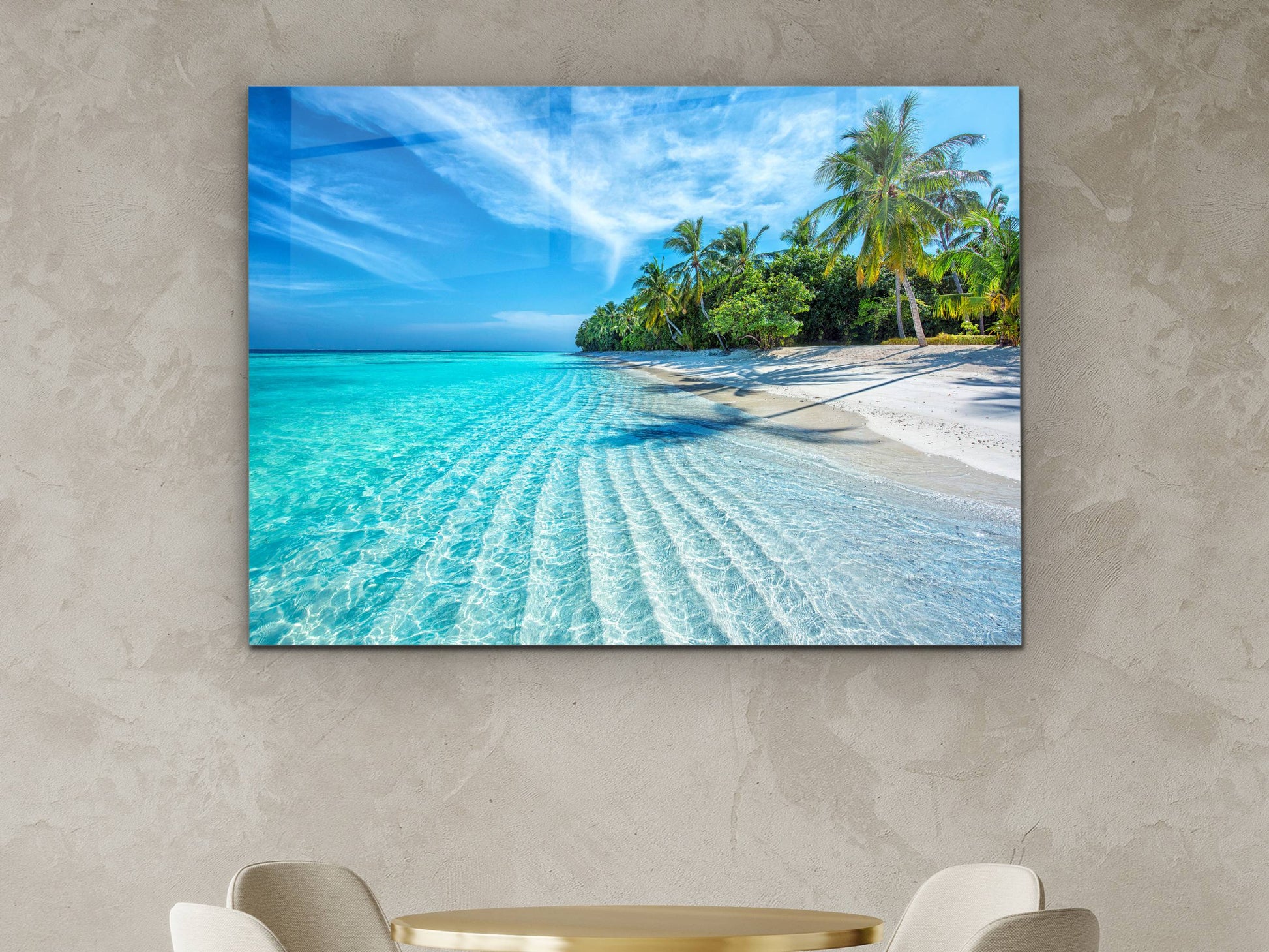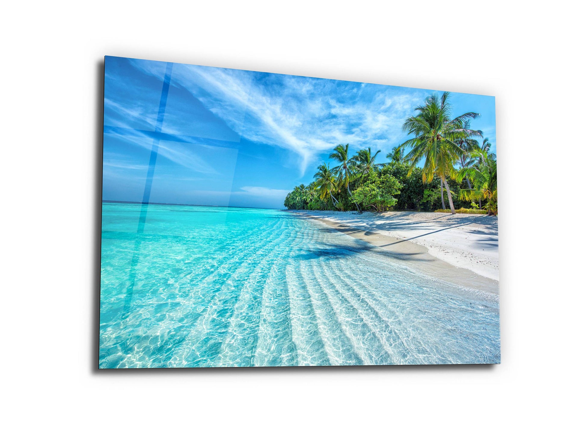Tropikal Sahil ve Palmiye Ağaçları Cam Tablo – Dekoratif Ev ve Ofis Tablosu
