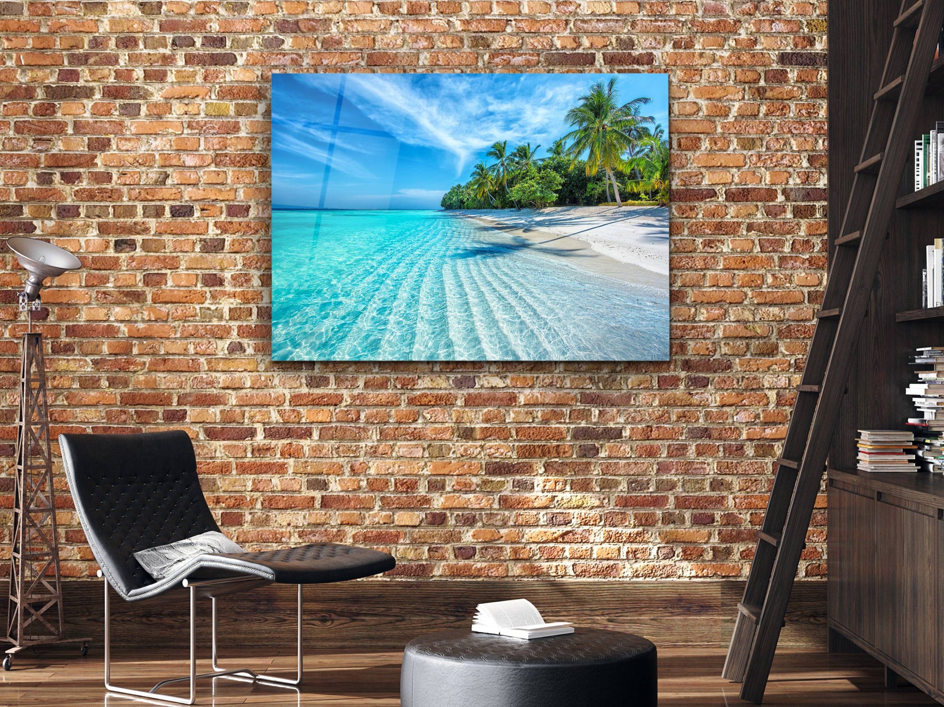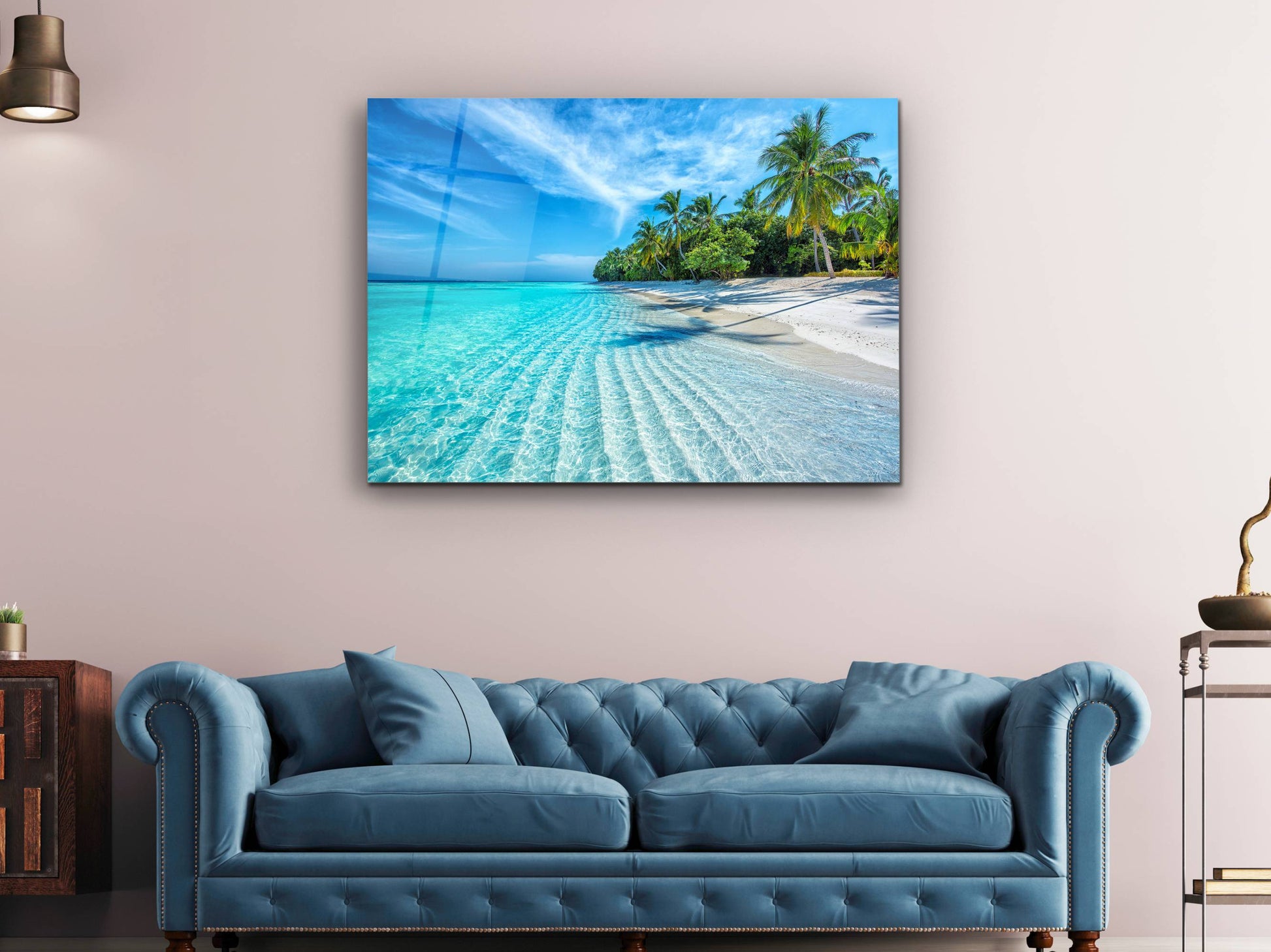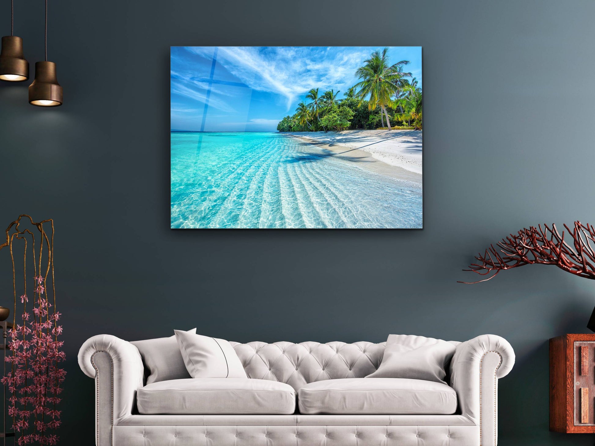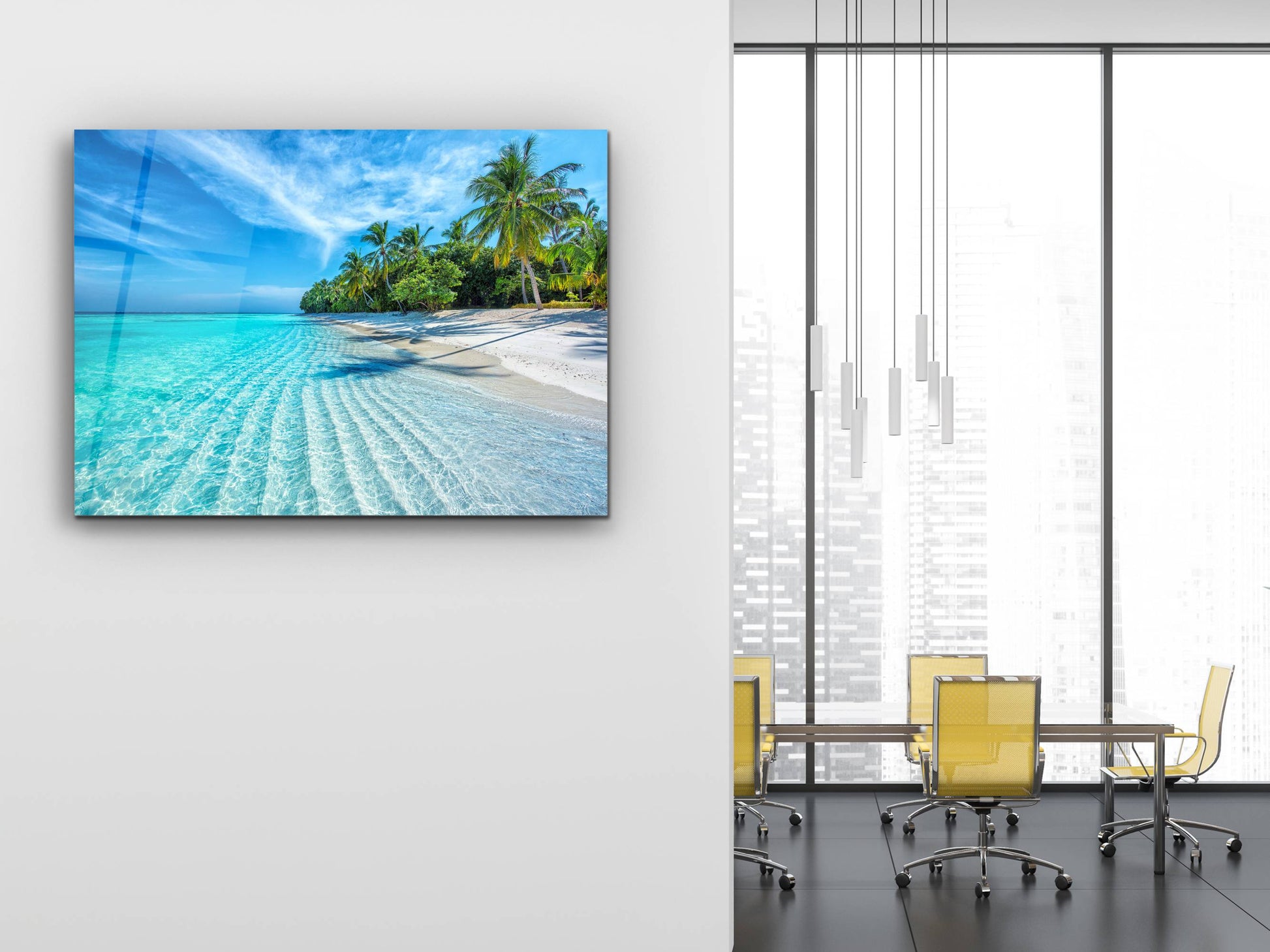 Tropikal Sahil ve Palmiye Ağaçları Cam Tablo – Dekoratif Ev ve Ofis Tablosu