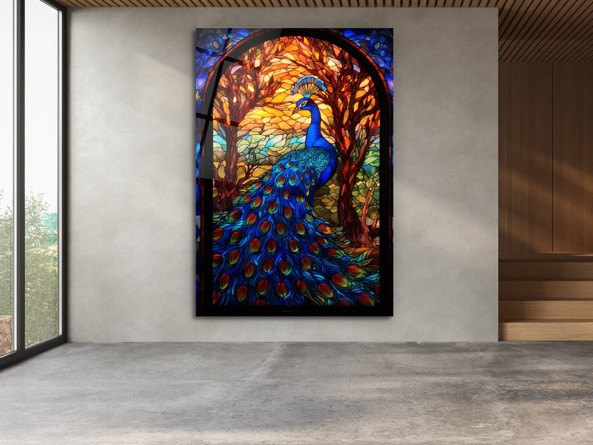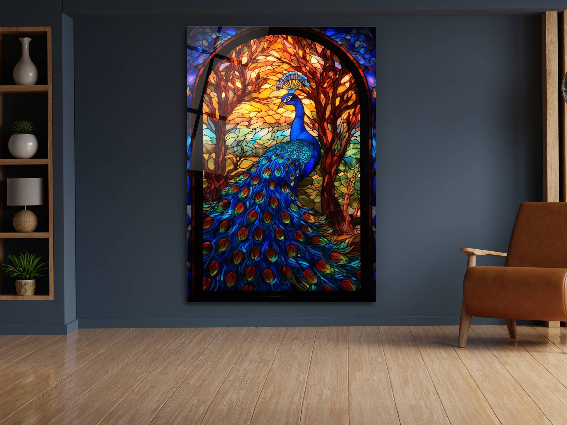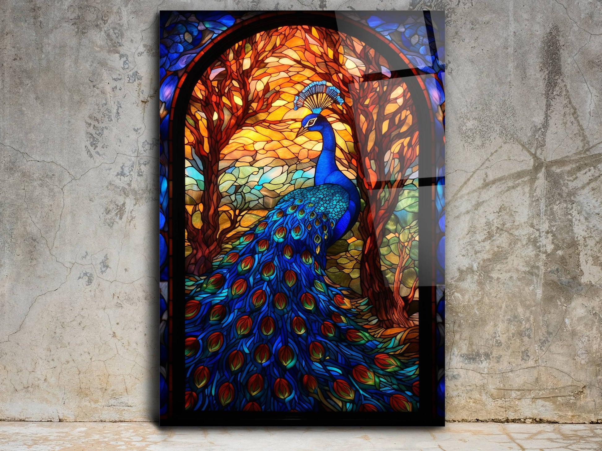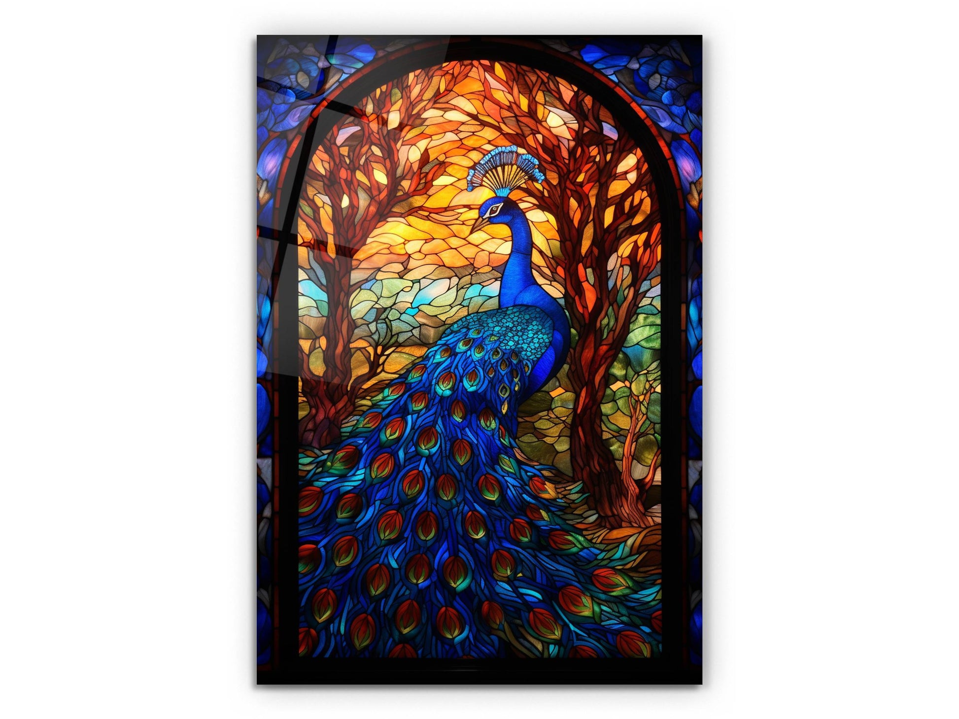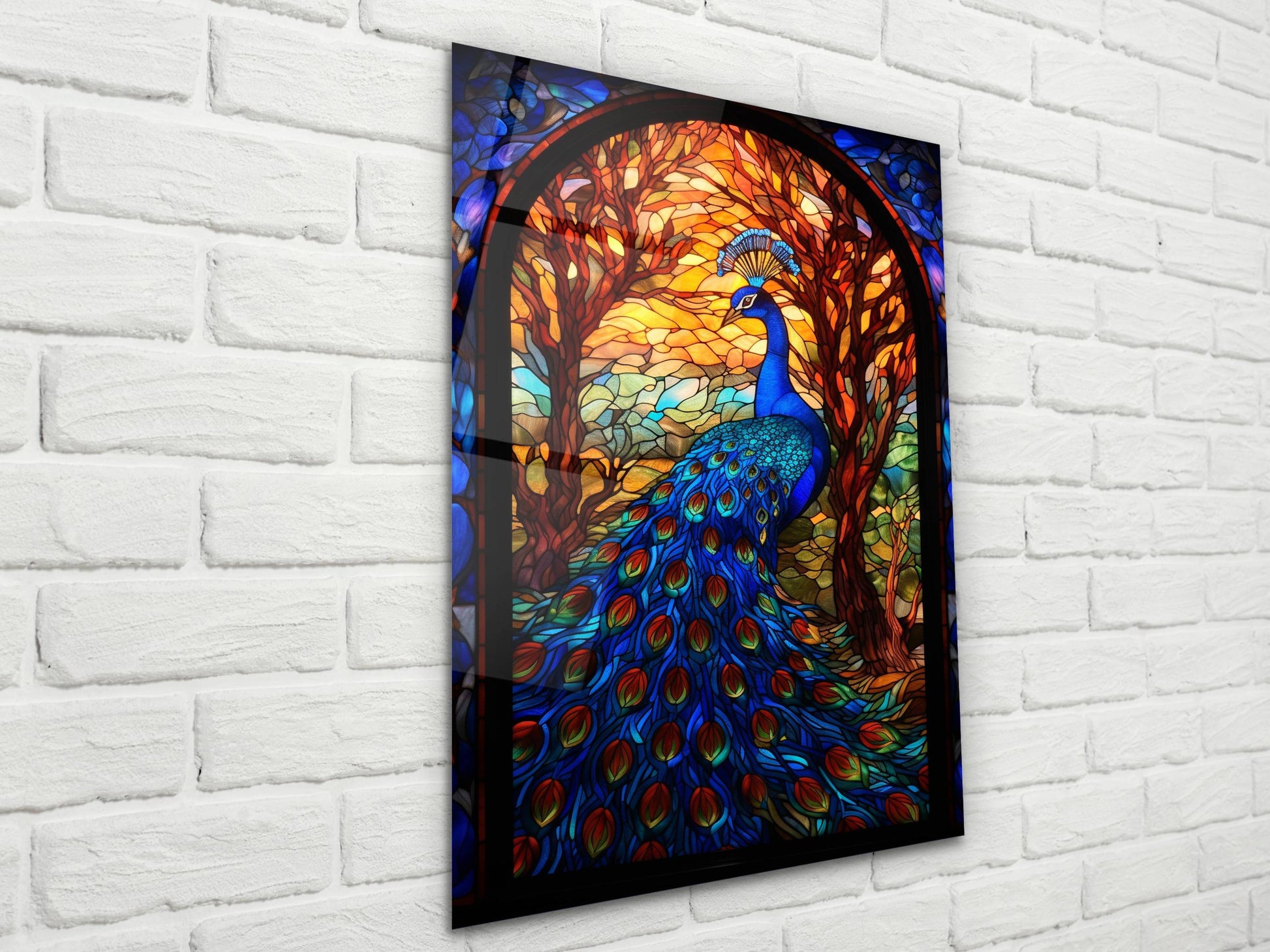 Vitray Tavus Kuşu Cam Tablo – Duvar Dekoru - Modern Ev ve Ofis Dekoru