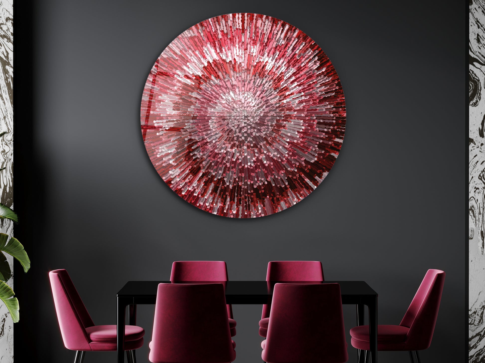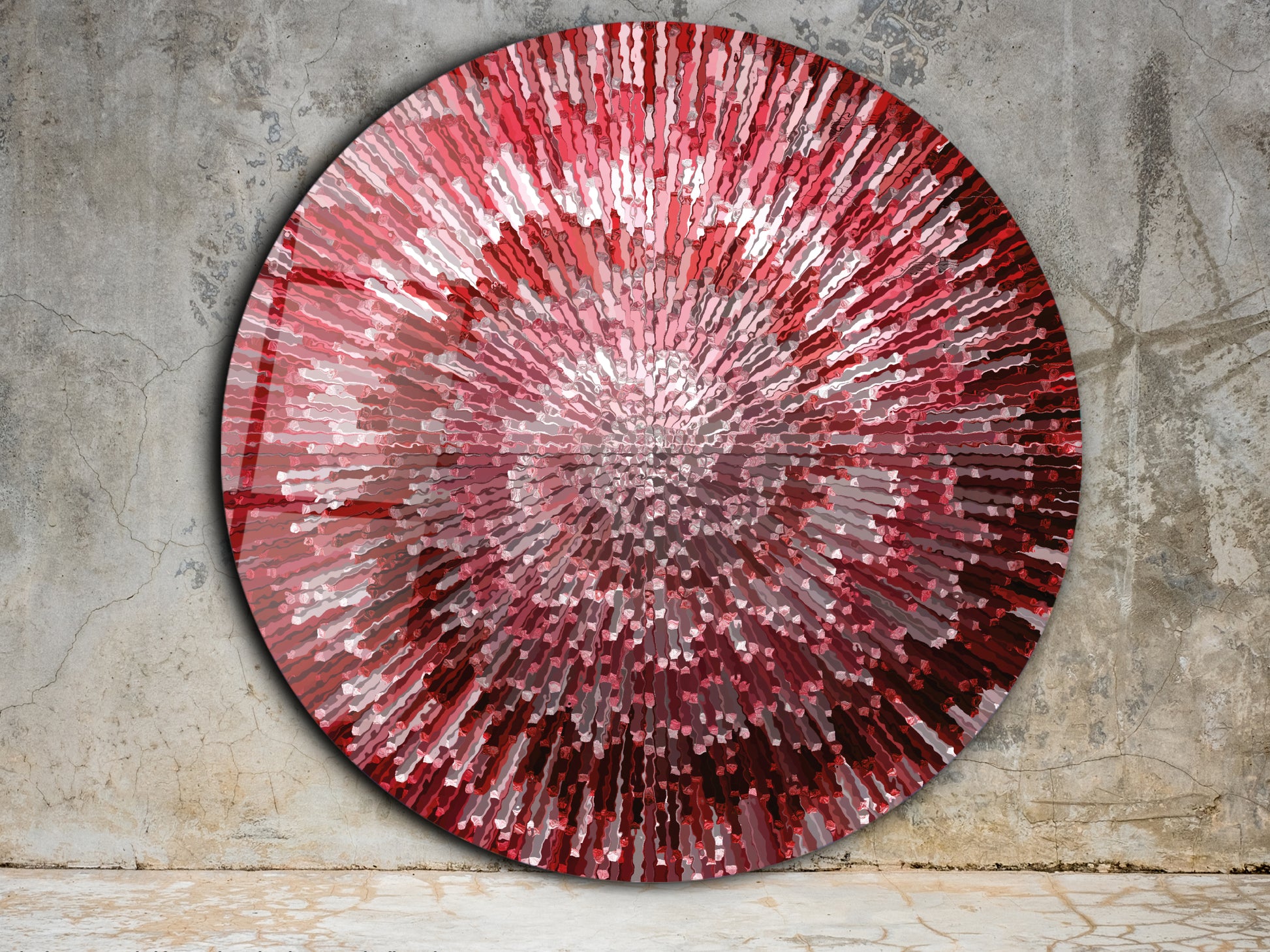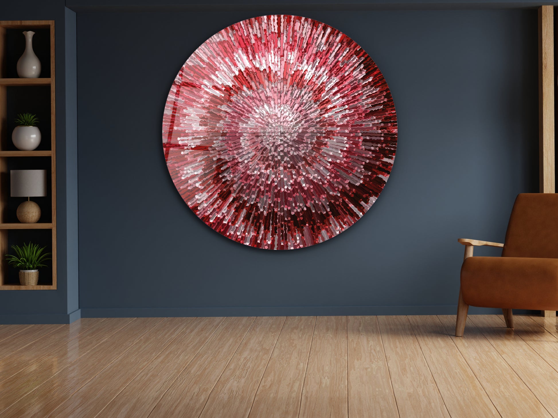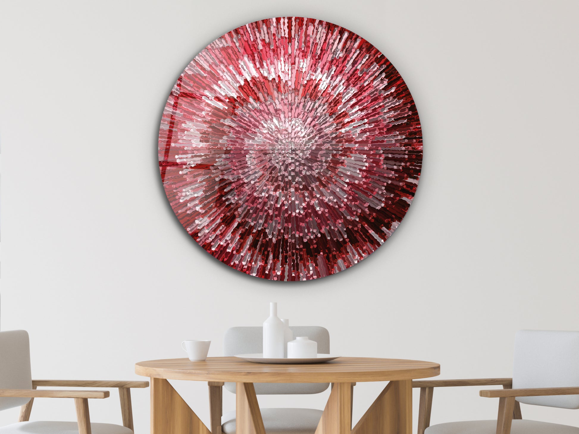 Yuvarlak Cam Tablo – Kırmızı Soyut Patlama Desenli Modern Duvar Dekoru