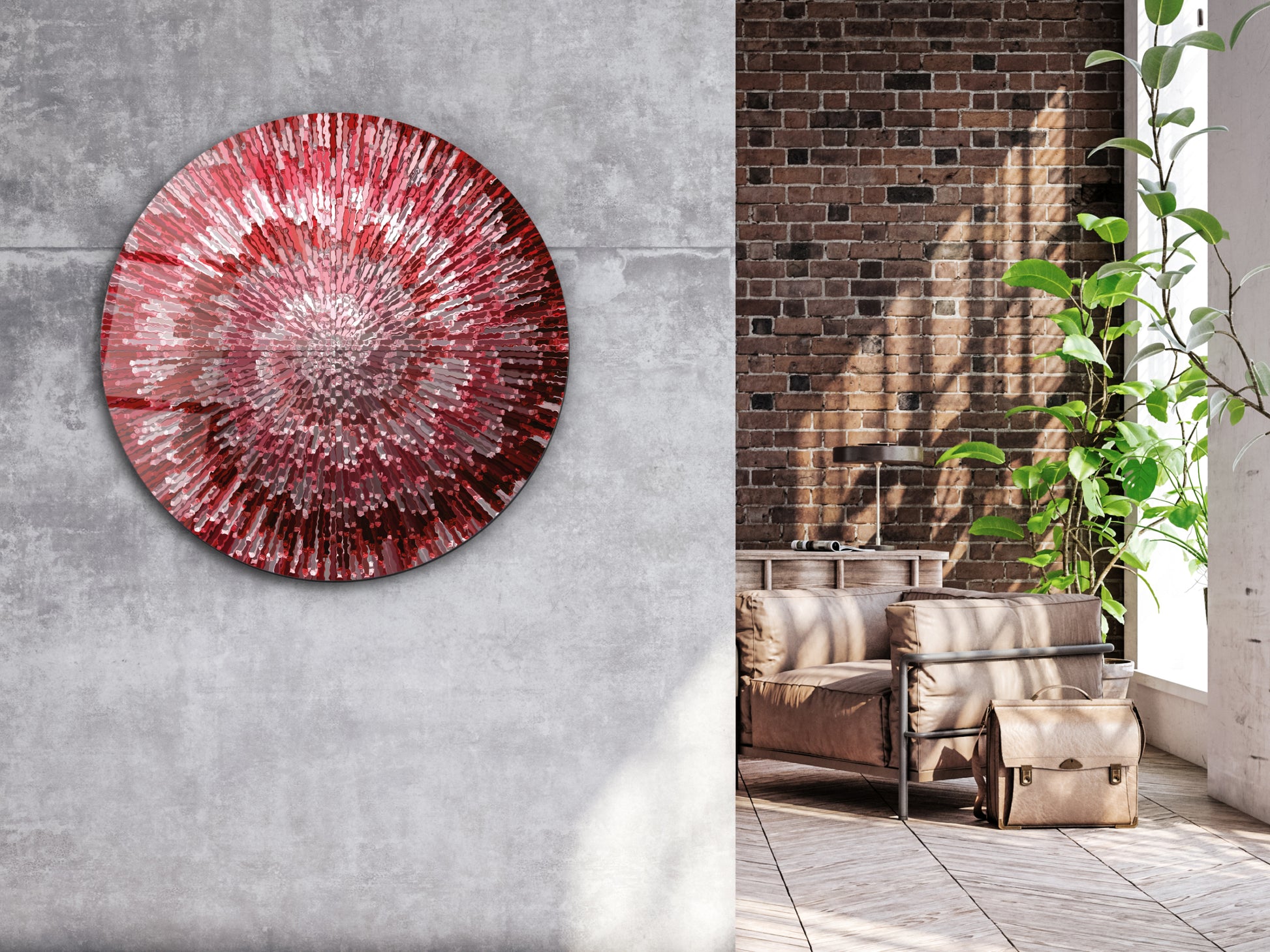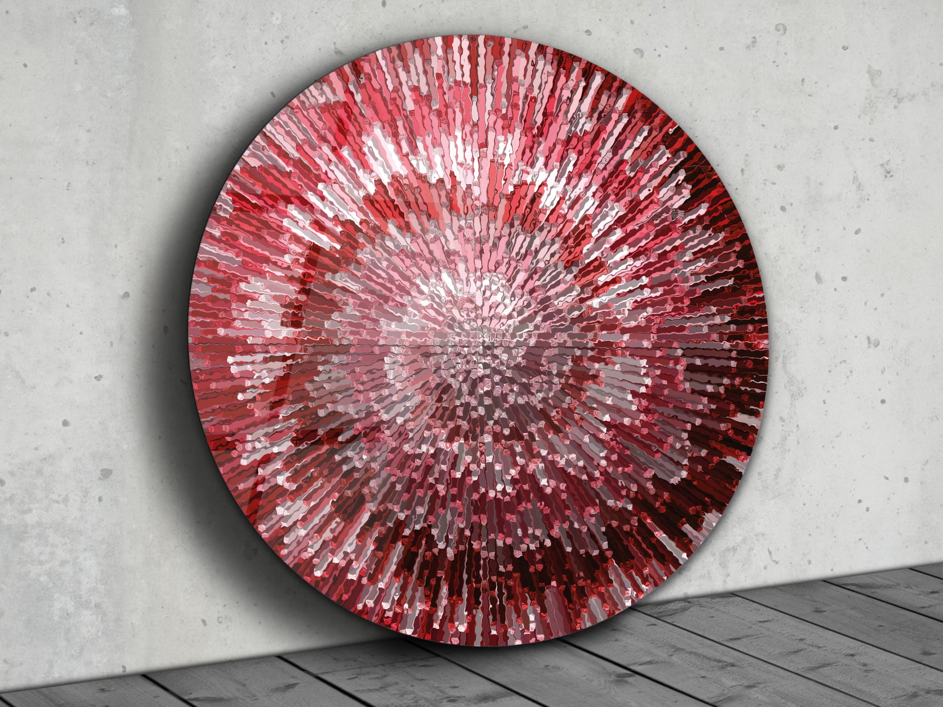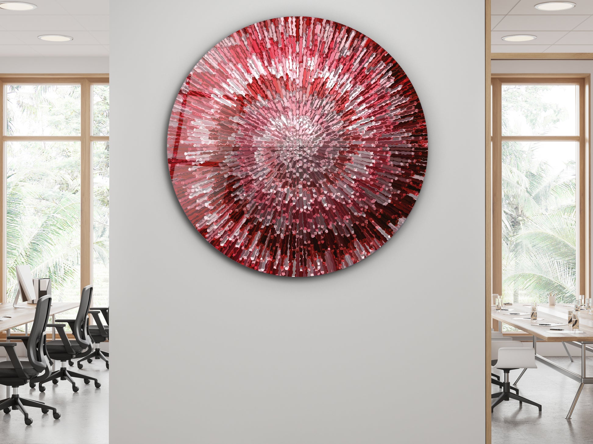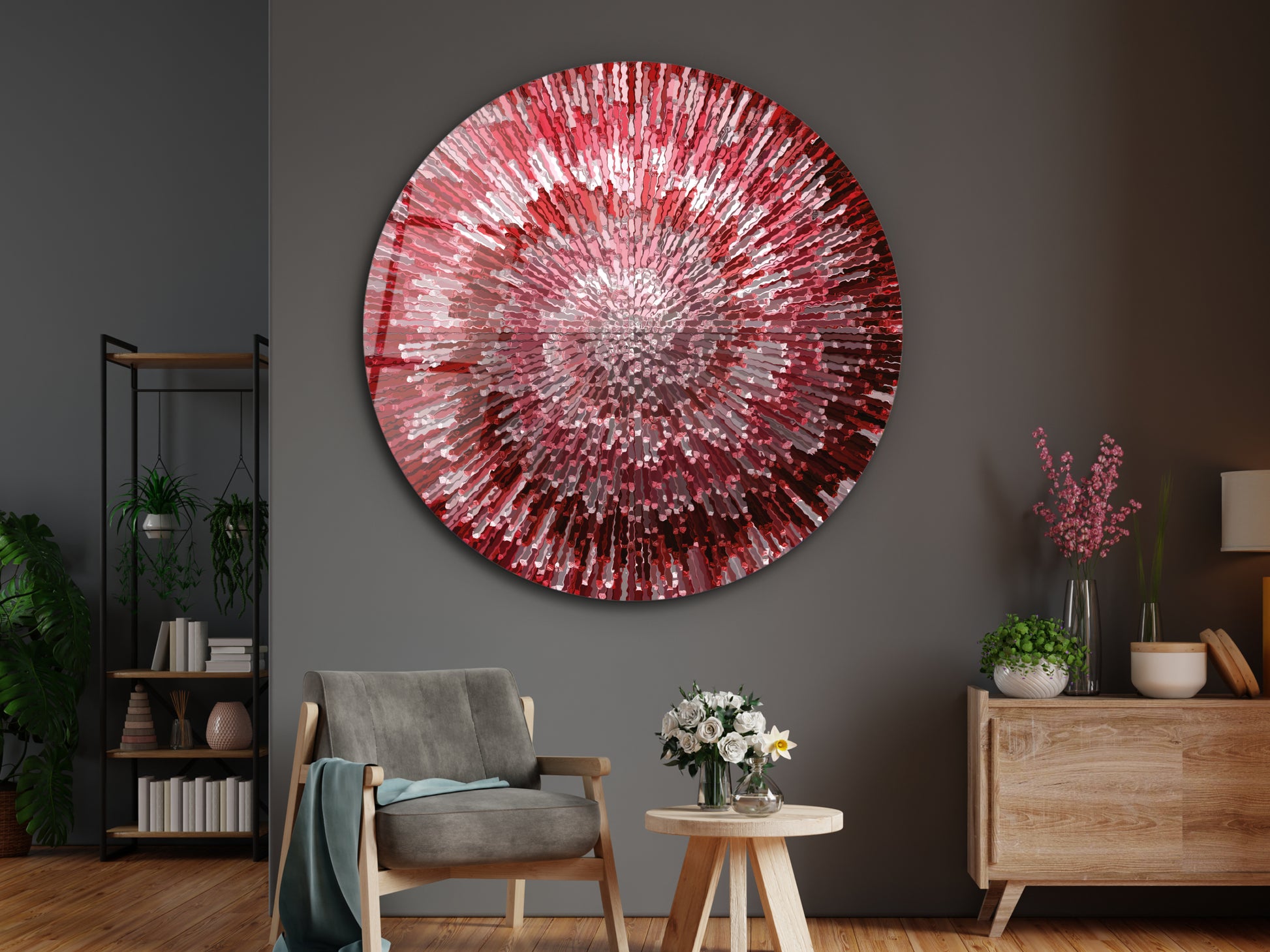 Yuvarlak Cam Tablo – Kırmızı Soyut Patlama Desenli Modern Duvar Dekoru