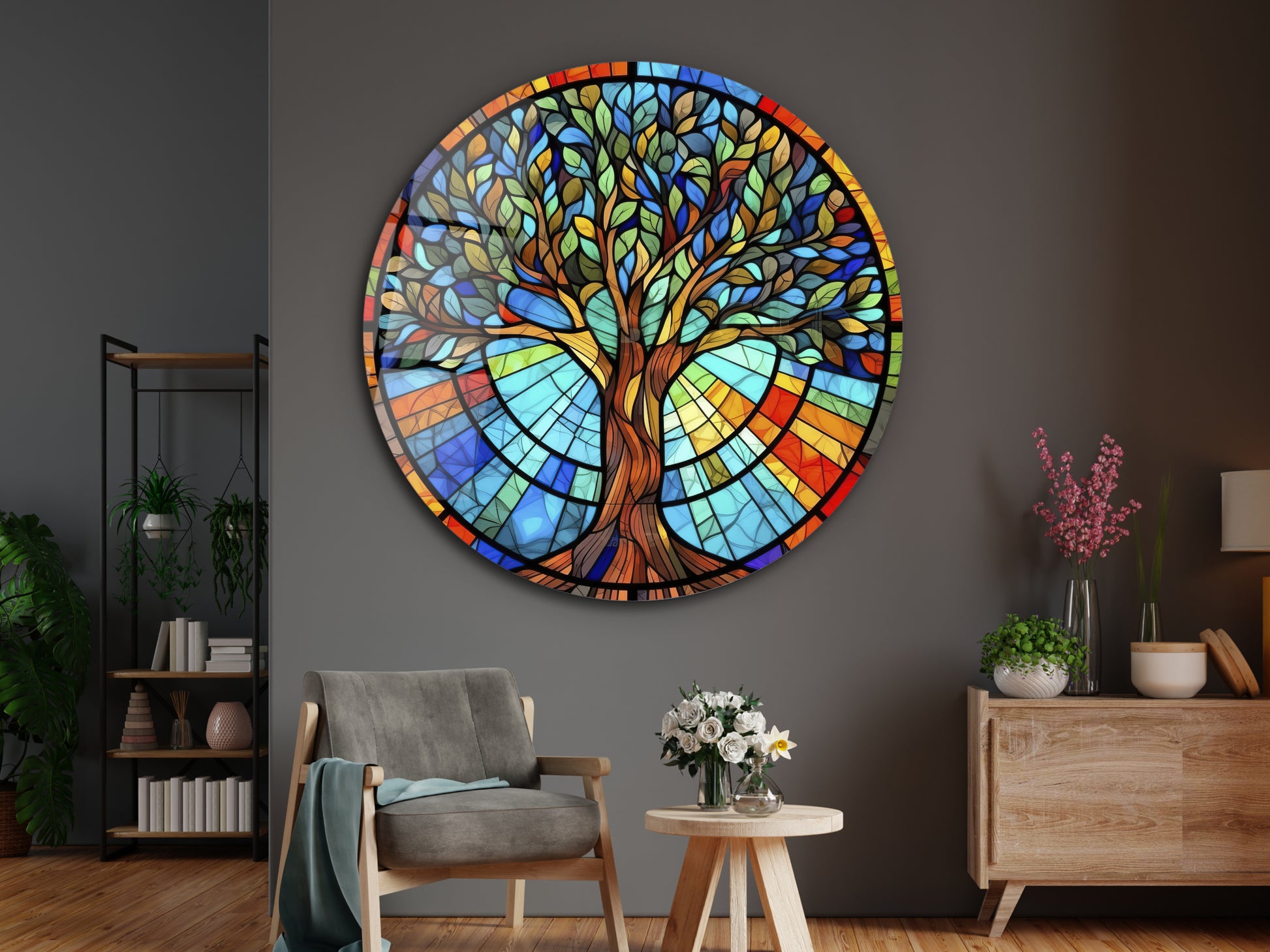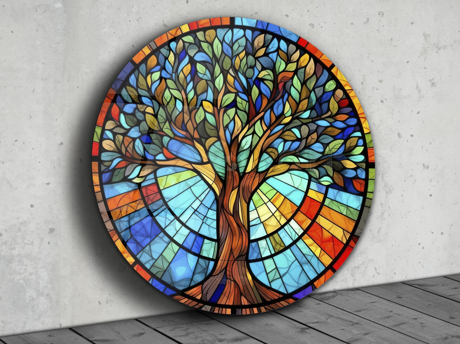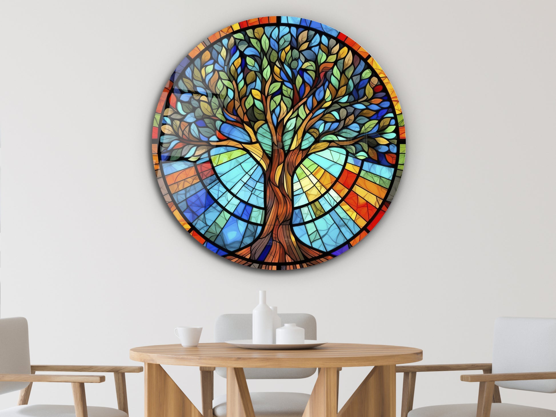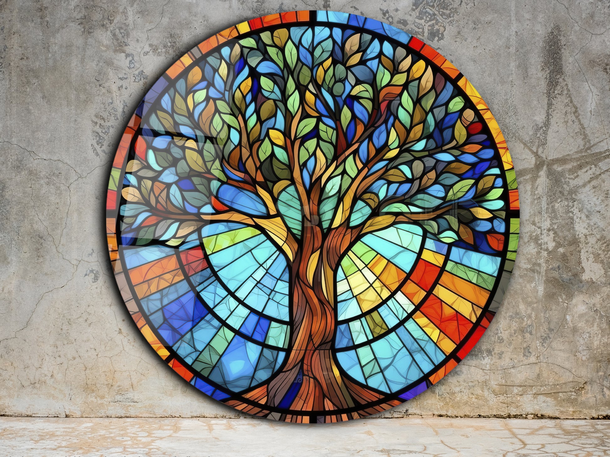 Yuvarlak Cam Tablo – Vitray Tarzı Hayat Ağacı Desenli Renkli Duvar Dekoru