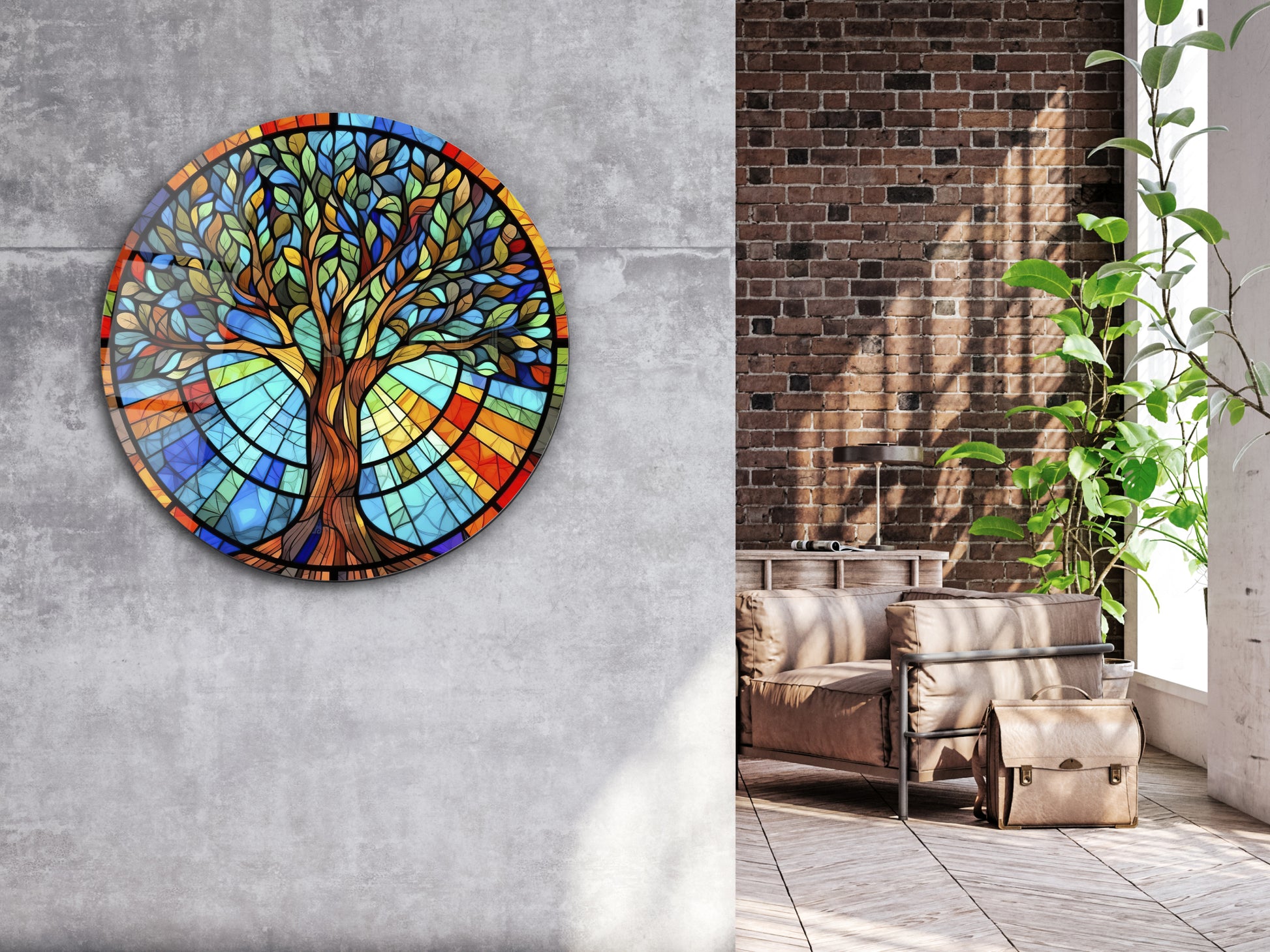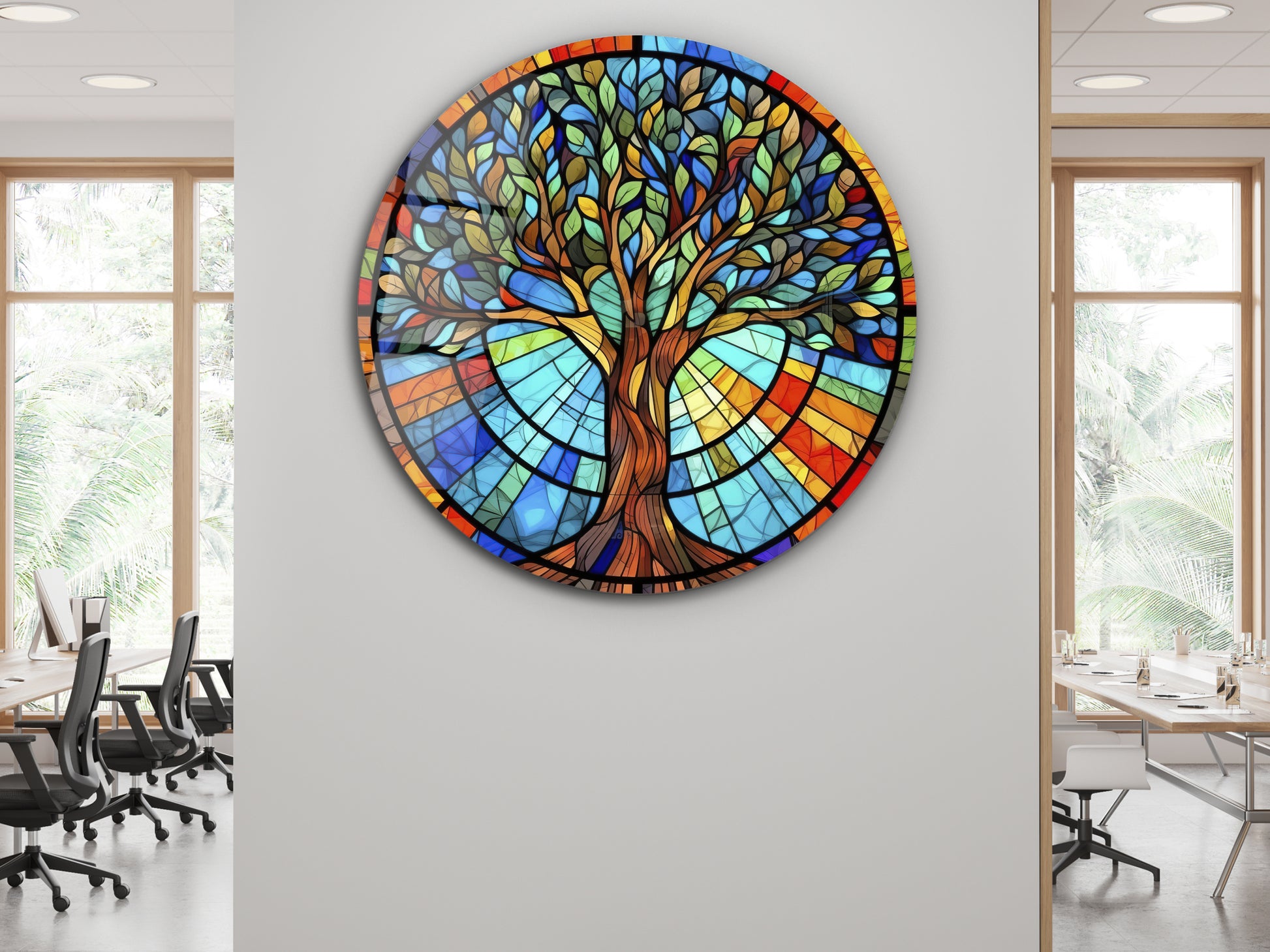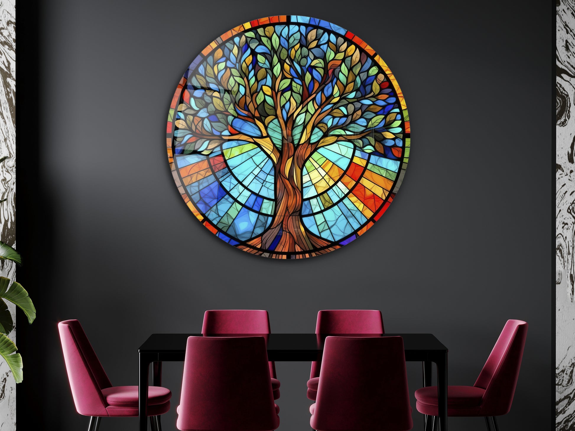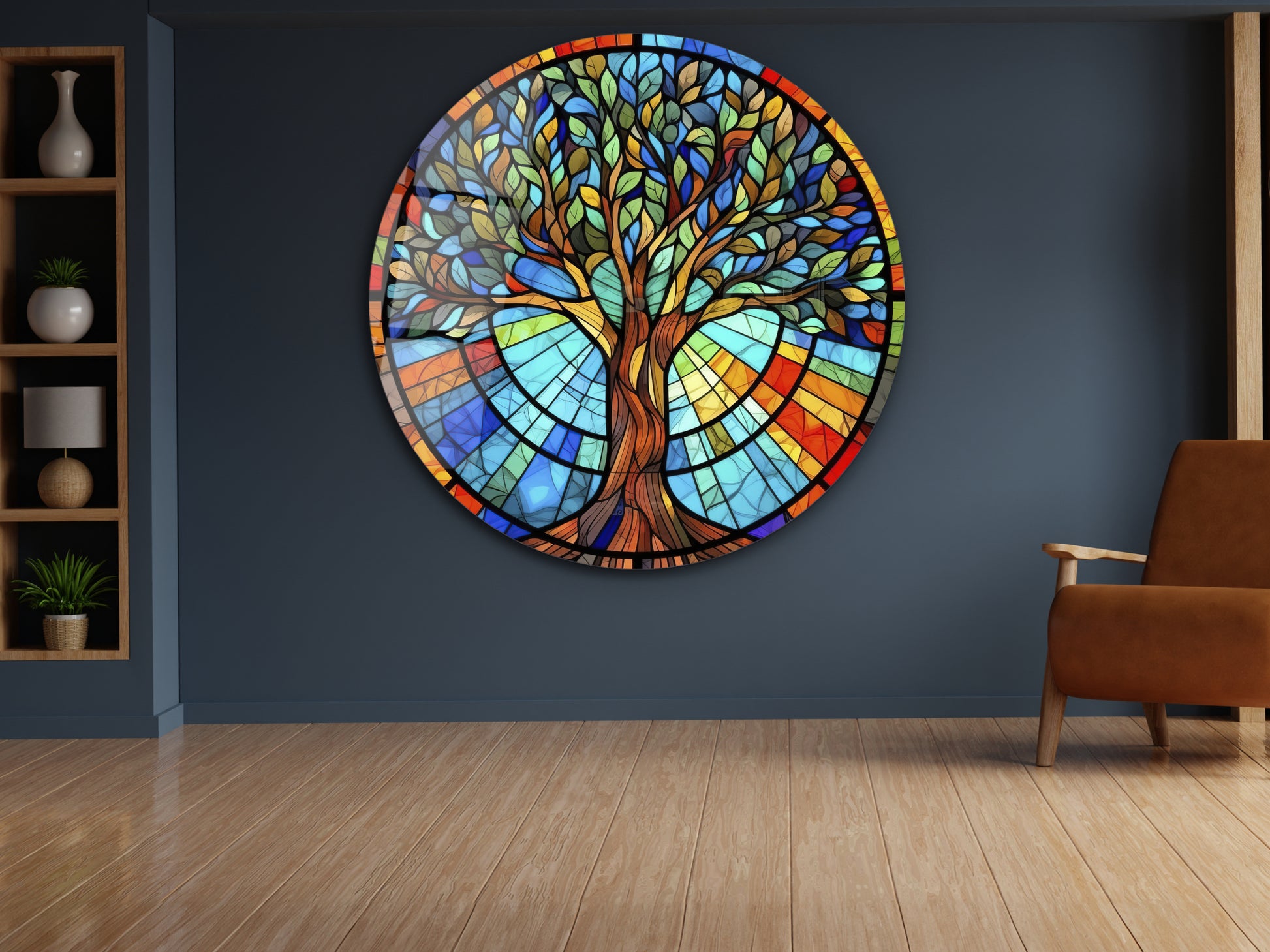 Yuvarlak Cam Tablo – Vitray Tarzı Hayat Ağacı Desenli Renkli Duvar Dekoru