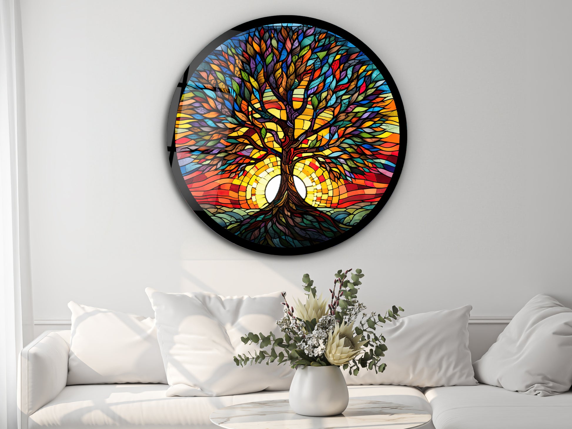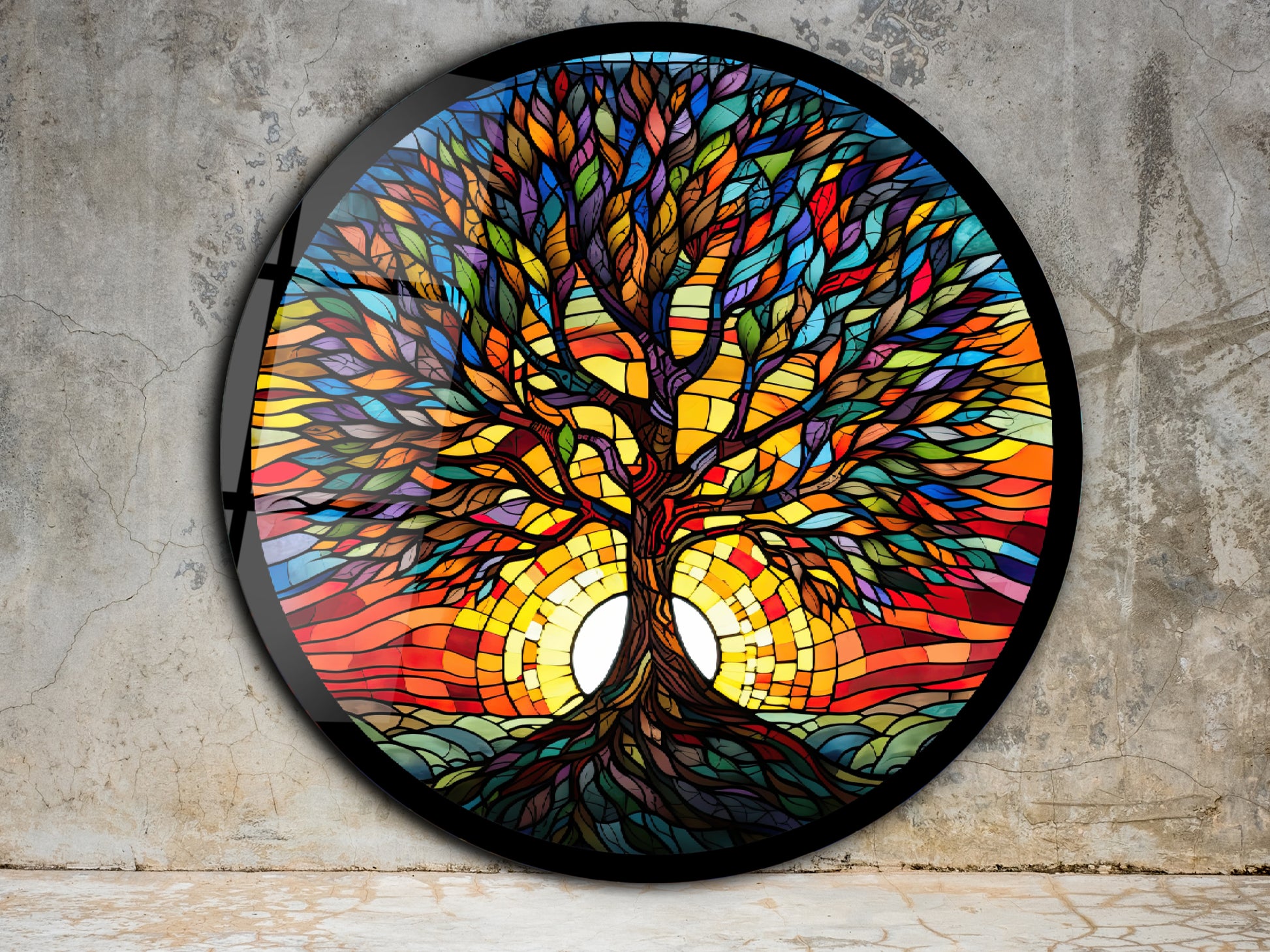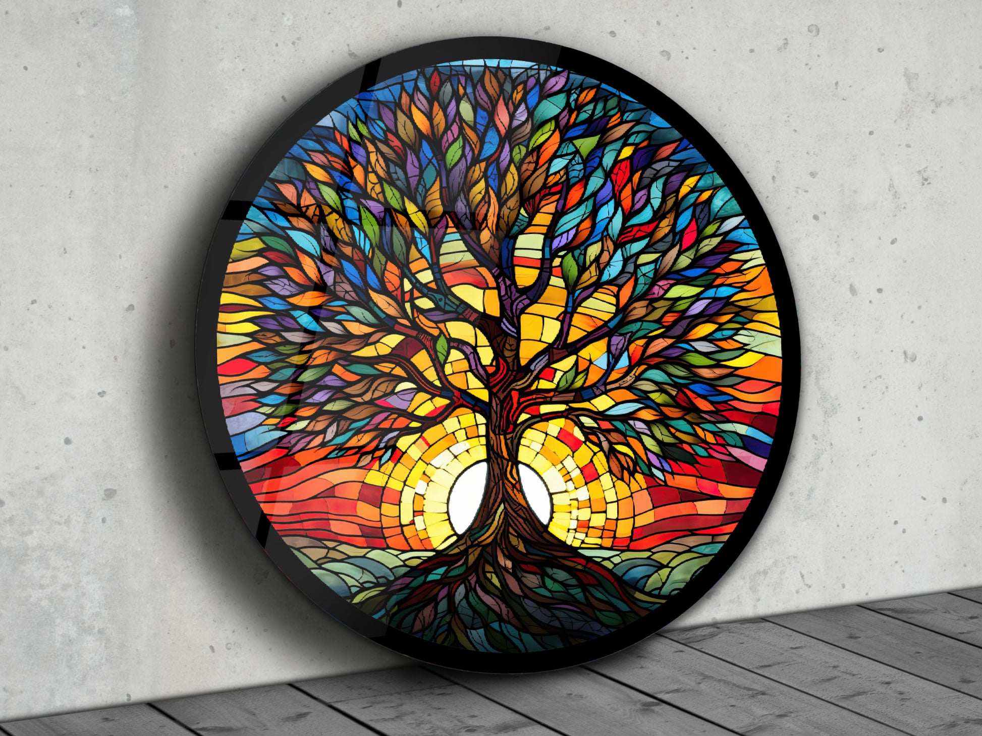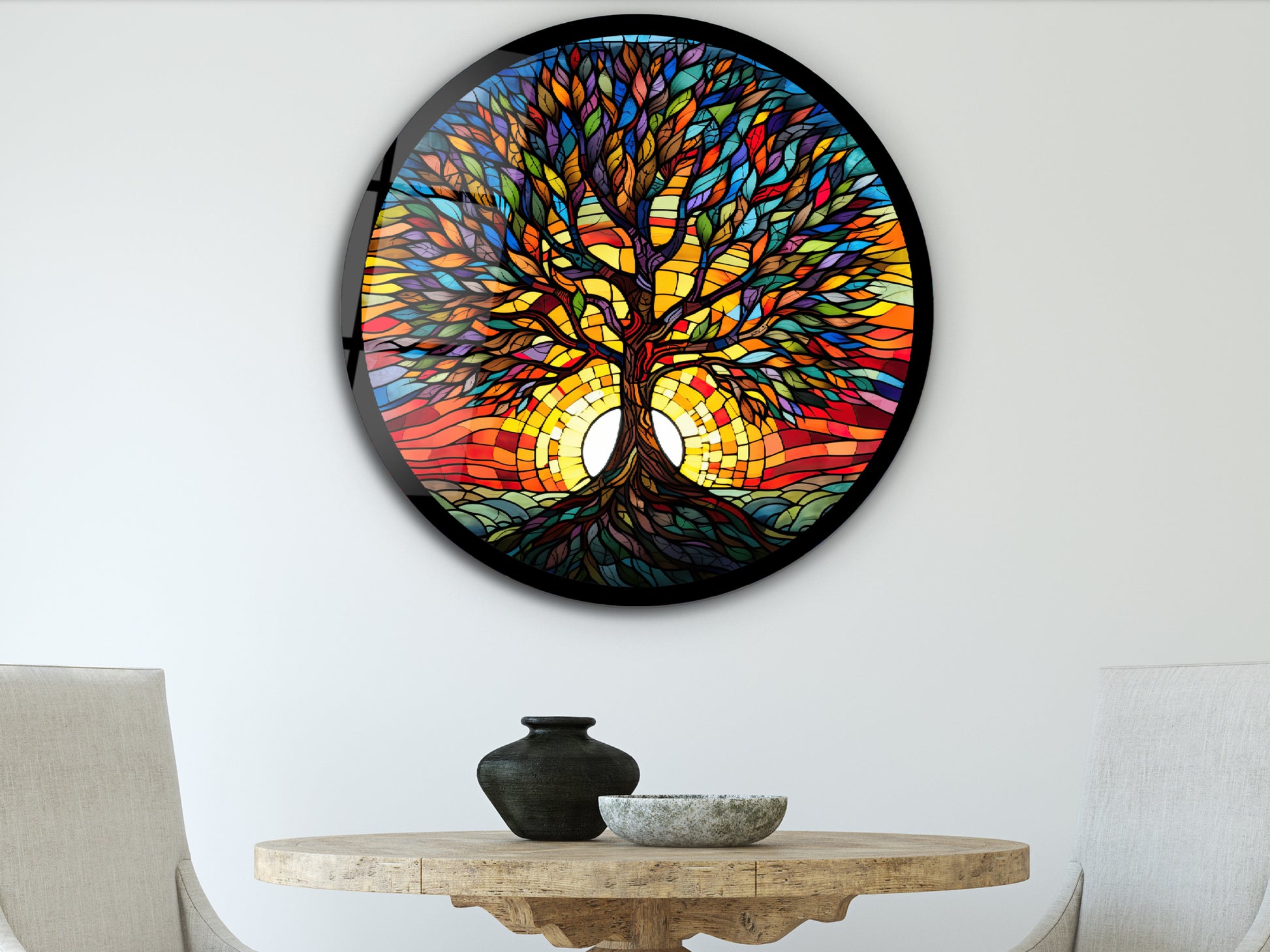 Yuvarlak Hayat Ağacı Cam Tablo – Vitray Tarzı Desenli Renkli Duvar Tablosu