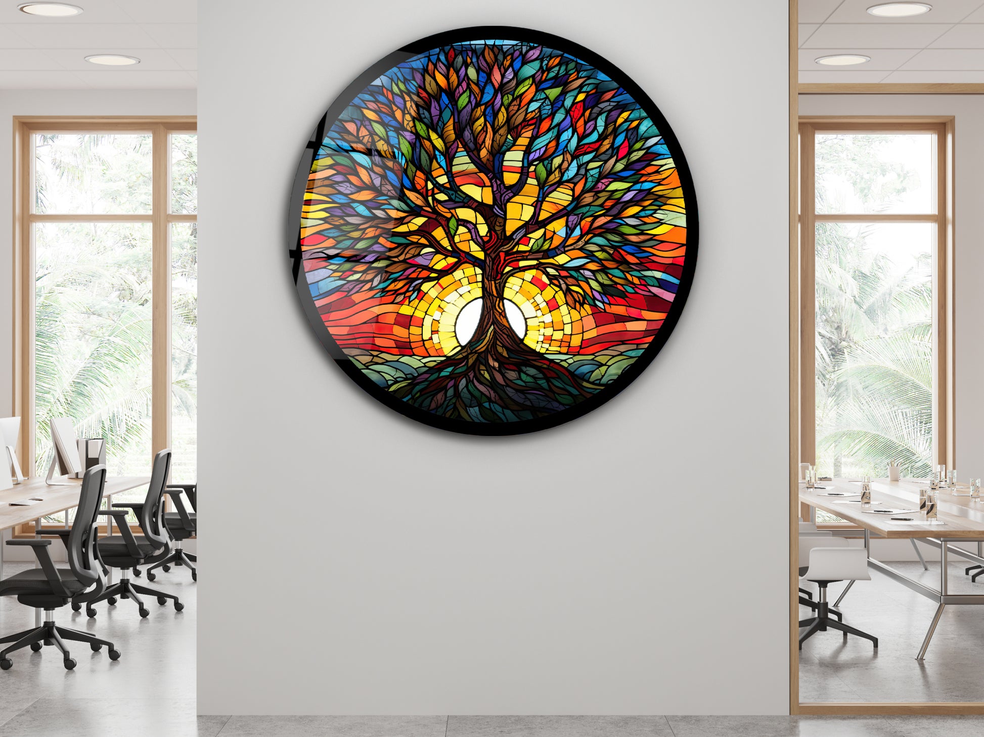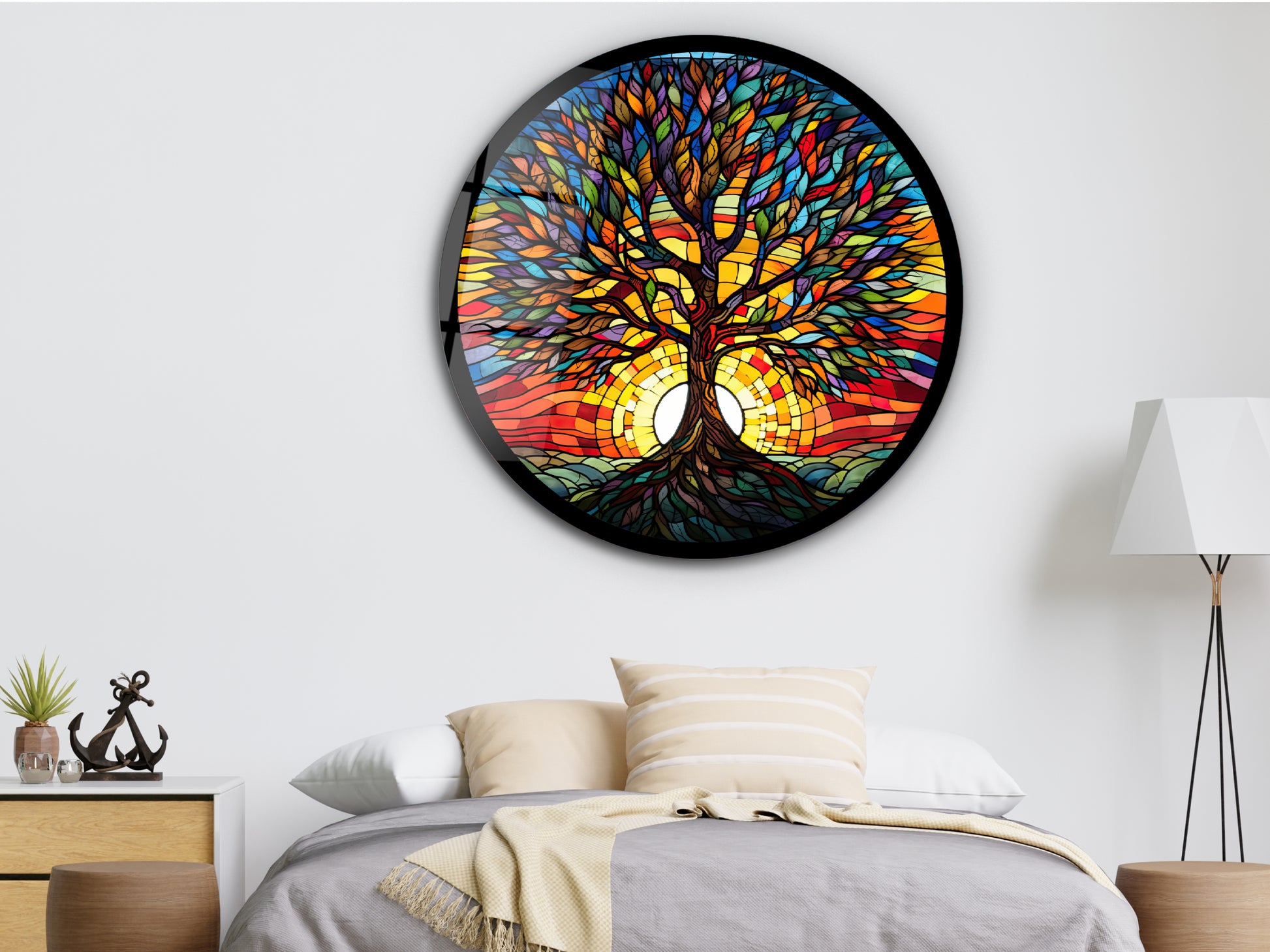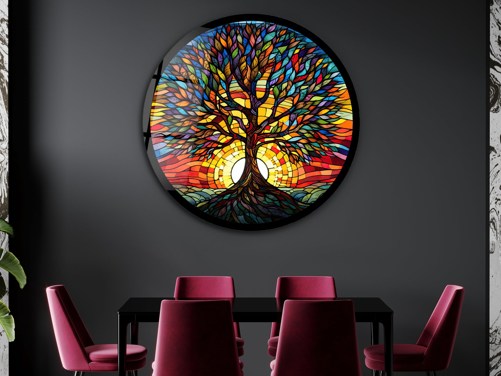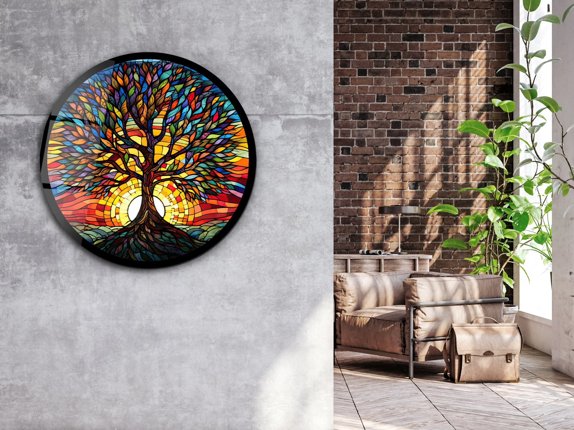 Yuvarlak Hayat Ağacı Cam Tablo – Vitray Tarzı Desenli Renkli Duvar Tablosu